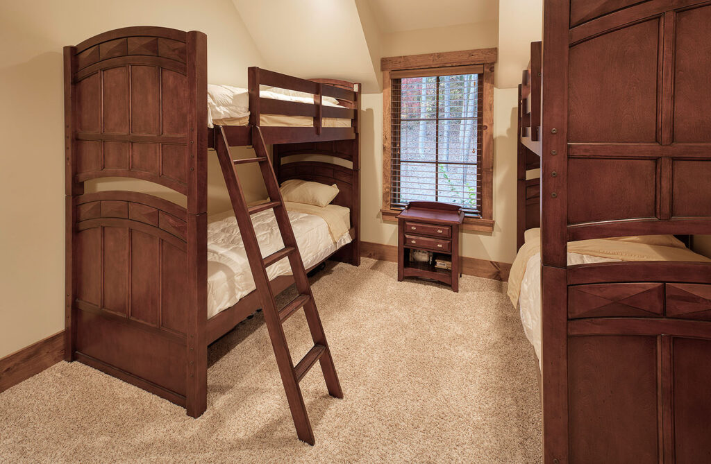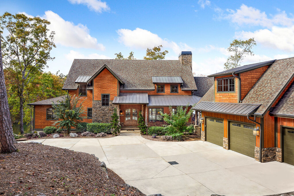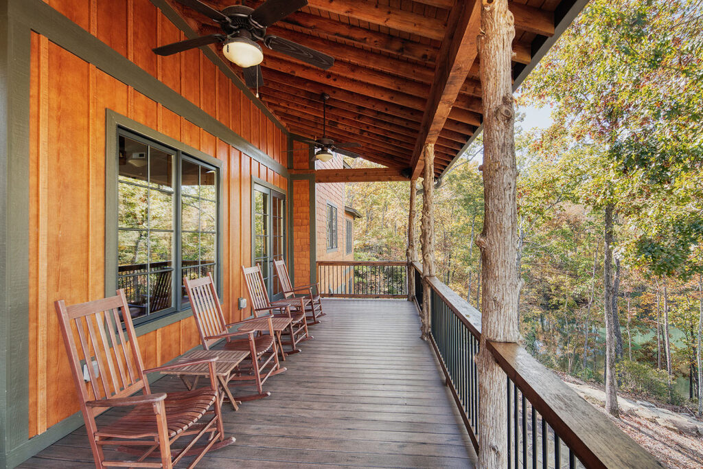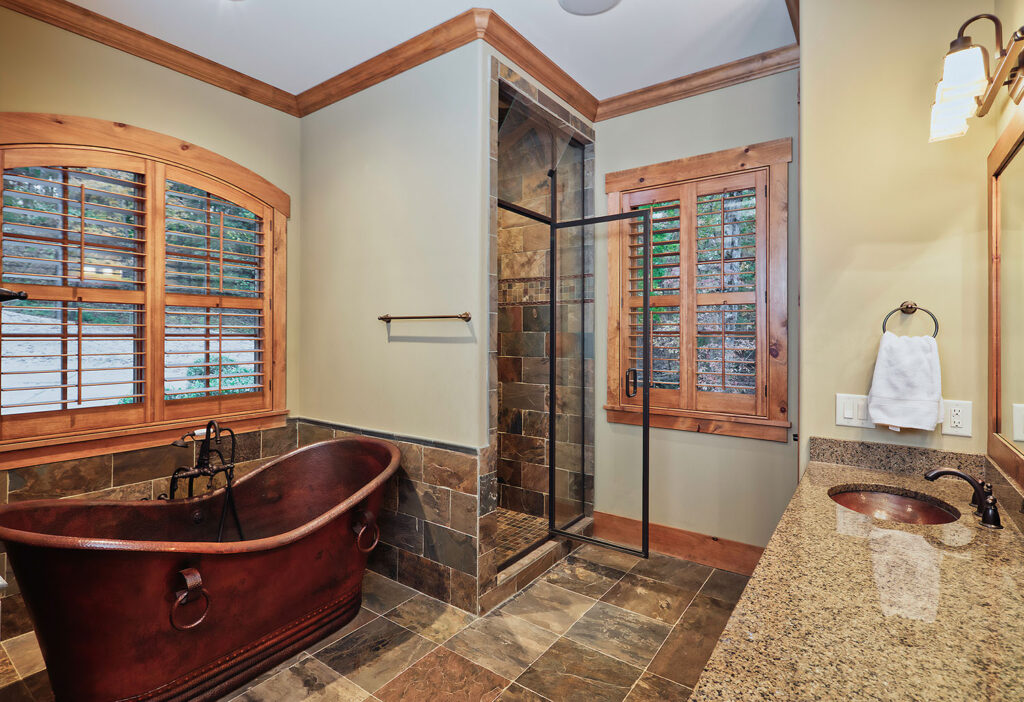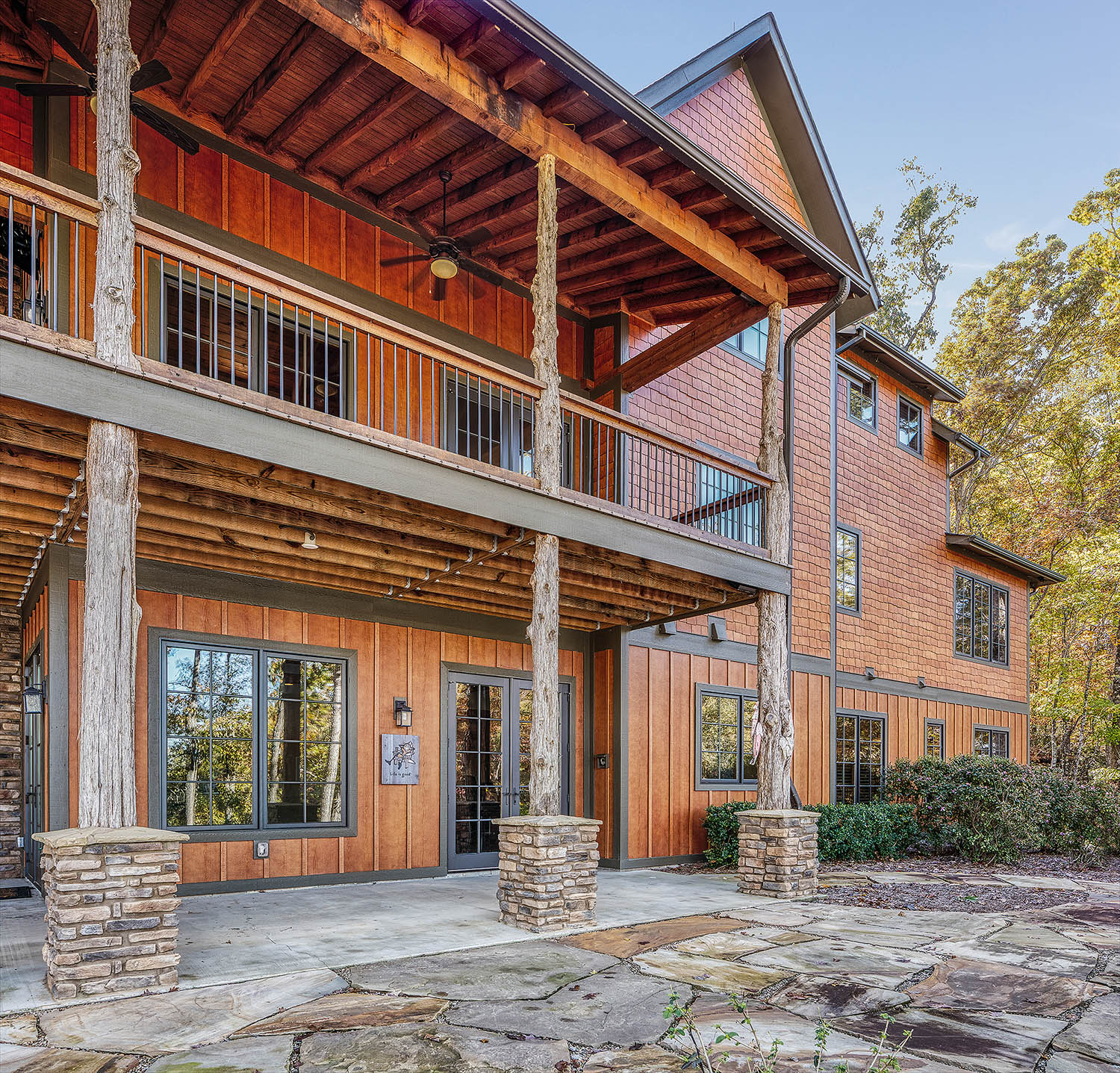 The main living space of this rustic custom home features a distressed wood feature wall that continues across the vaulted ceiling with wood support beams.