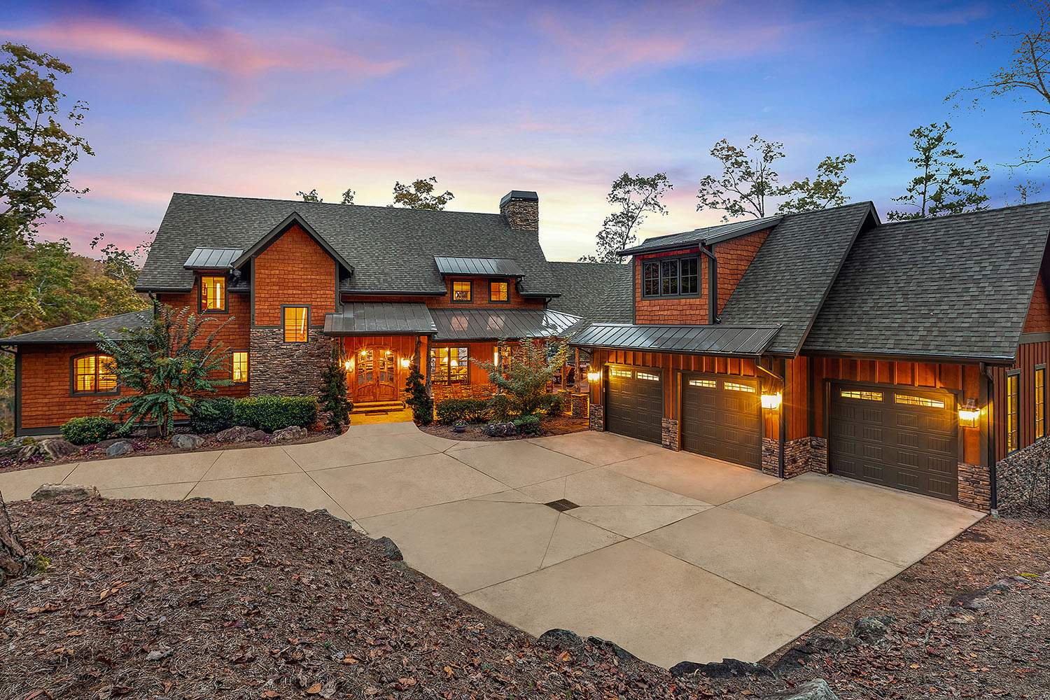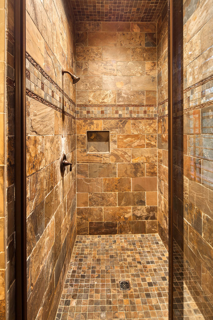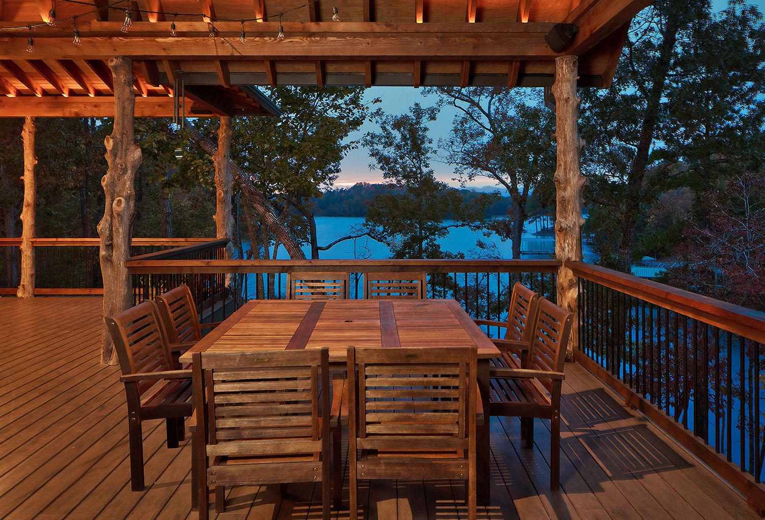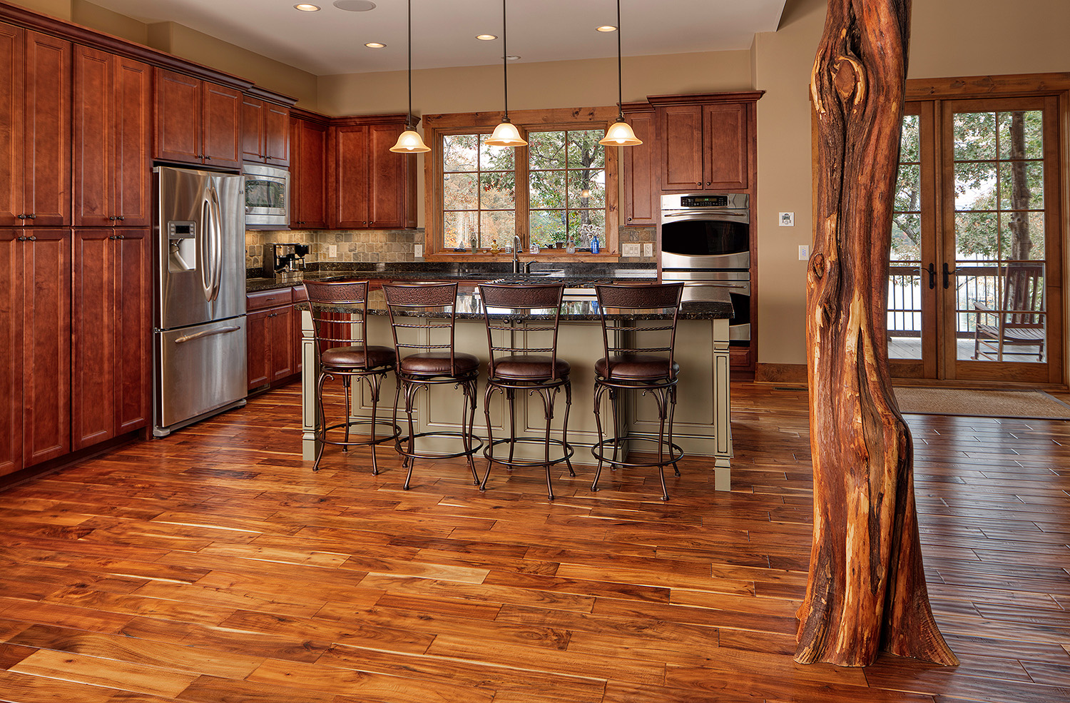 The main living space of this rustic custom home features a distressed wood feature wall that continues across the vaulted ceiling with wood support beams.
