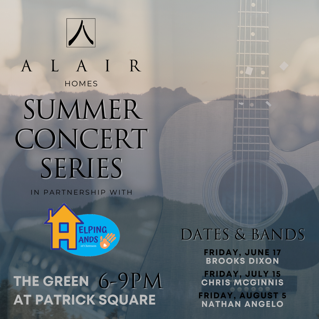 Mark your calendars for the 2022 Alair Homes Clemson Summer Concert Series! Hosted at The Green at Patrick Square, this year’s concert series will benefit Helping Hands of Clemson Children’s Home.
