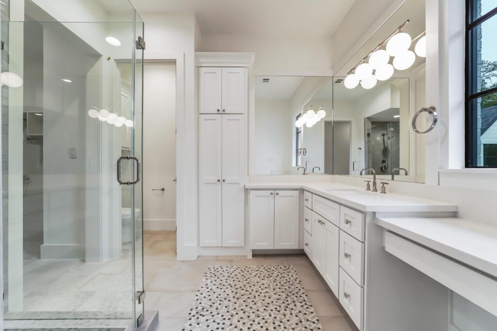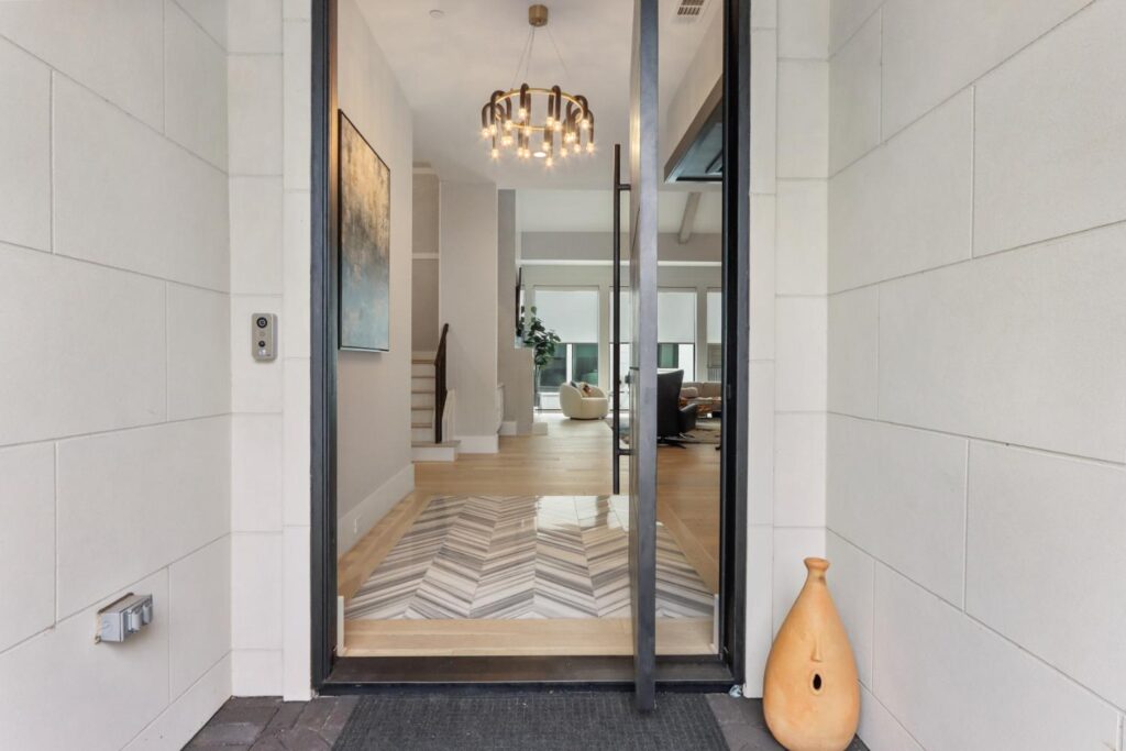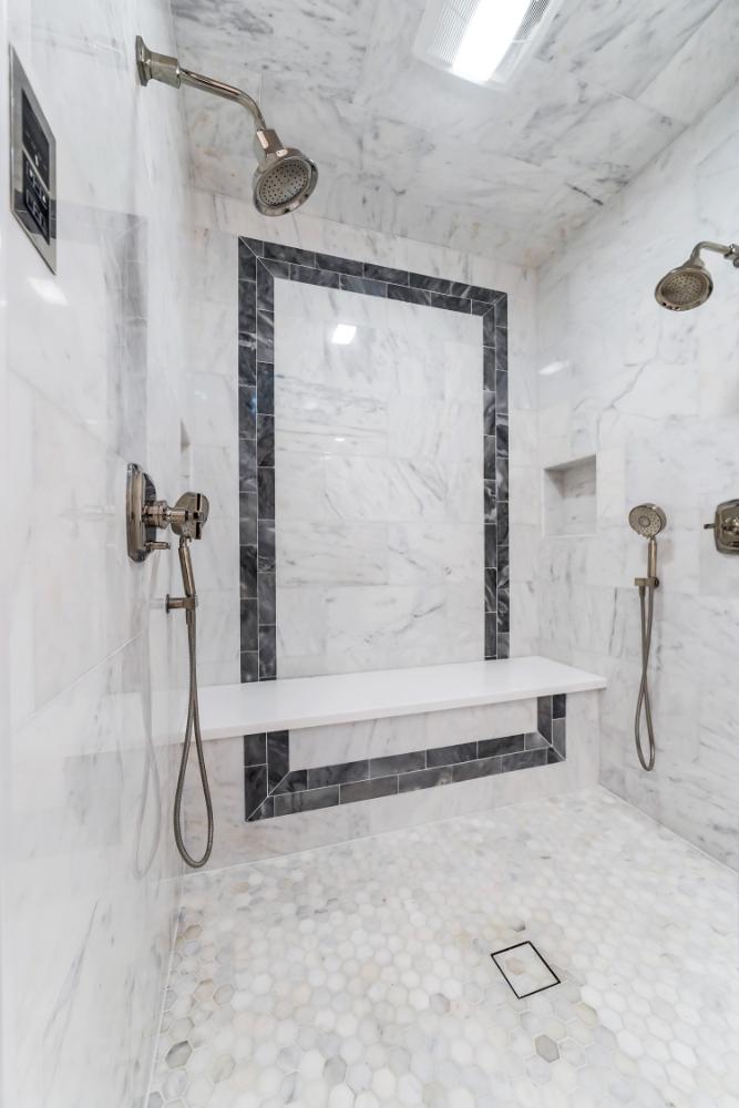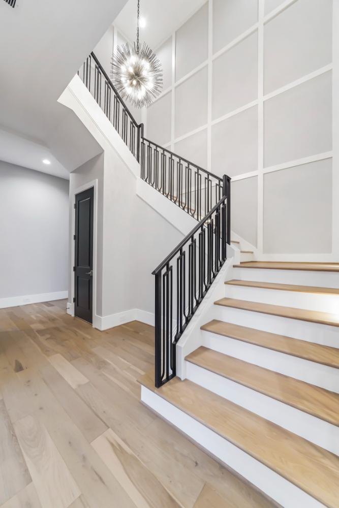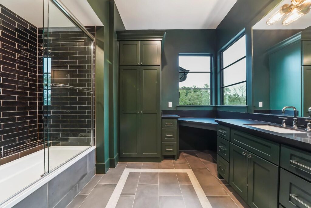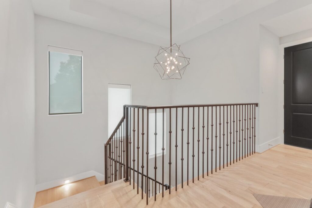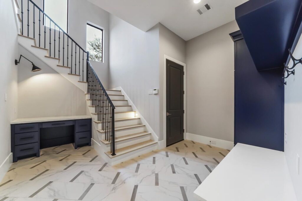 This transitional style home has evolved from a traditional style absent period details. With clean lines and more open glass areas, this fresh expression exemplifies the transitional look. Mitered siding corners, though a detail in & of itself, & the lack of traditional corner boards enforce this unique style. As in all good transitional homes, a glimpse of the past must be held onto, & we see that in the crafted arched shed roof brackets & diagonal tile design over the front door.