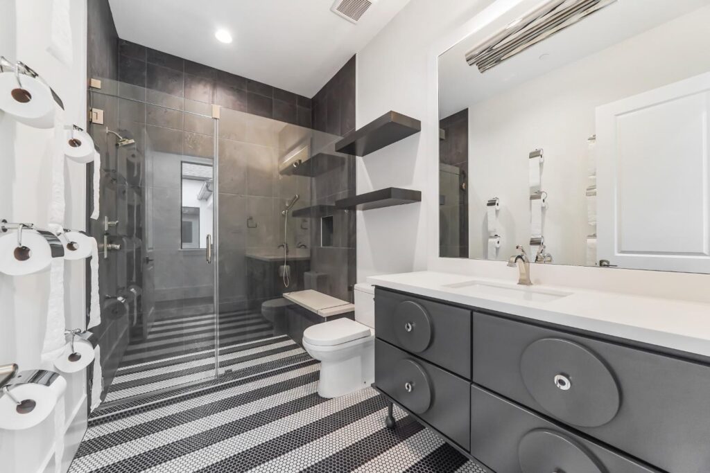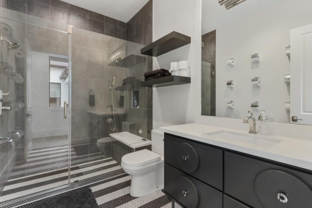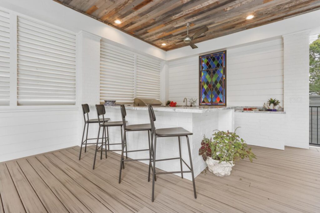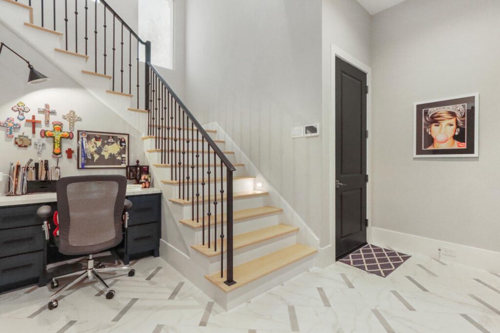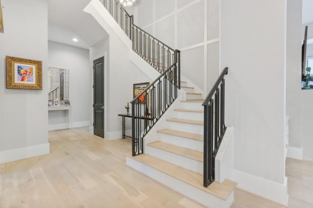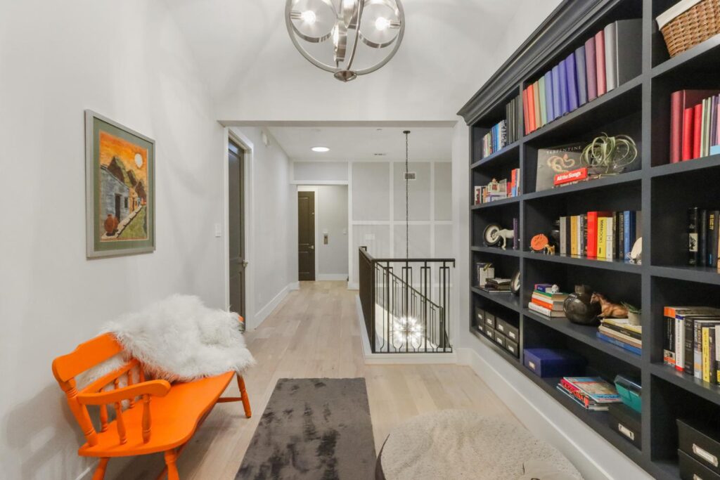 This transitional style home has evolved from a traditional style absent period details. With clean lines and more open glass areas, this fresh expression exemplifies the transitional look. Mitered siding corners, though a detail in & of itself, & the lack of traditional corner boards enforce this unique style. As in all good transitional homes, a glimpse of the past must be held onto, & we see that in the crafted arched shed roof brackets & diagonal tile design over the front door.