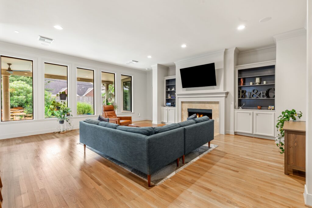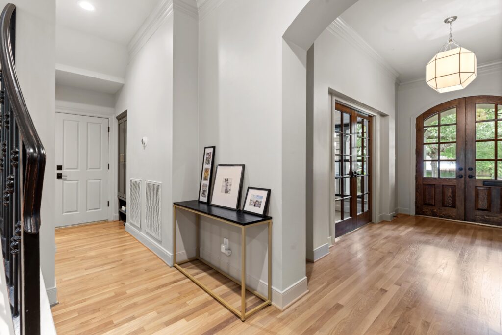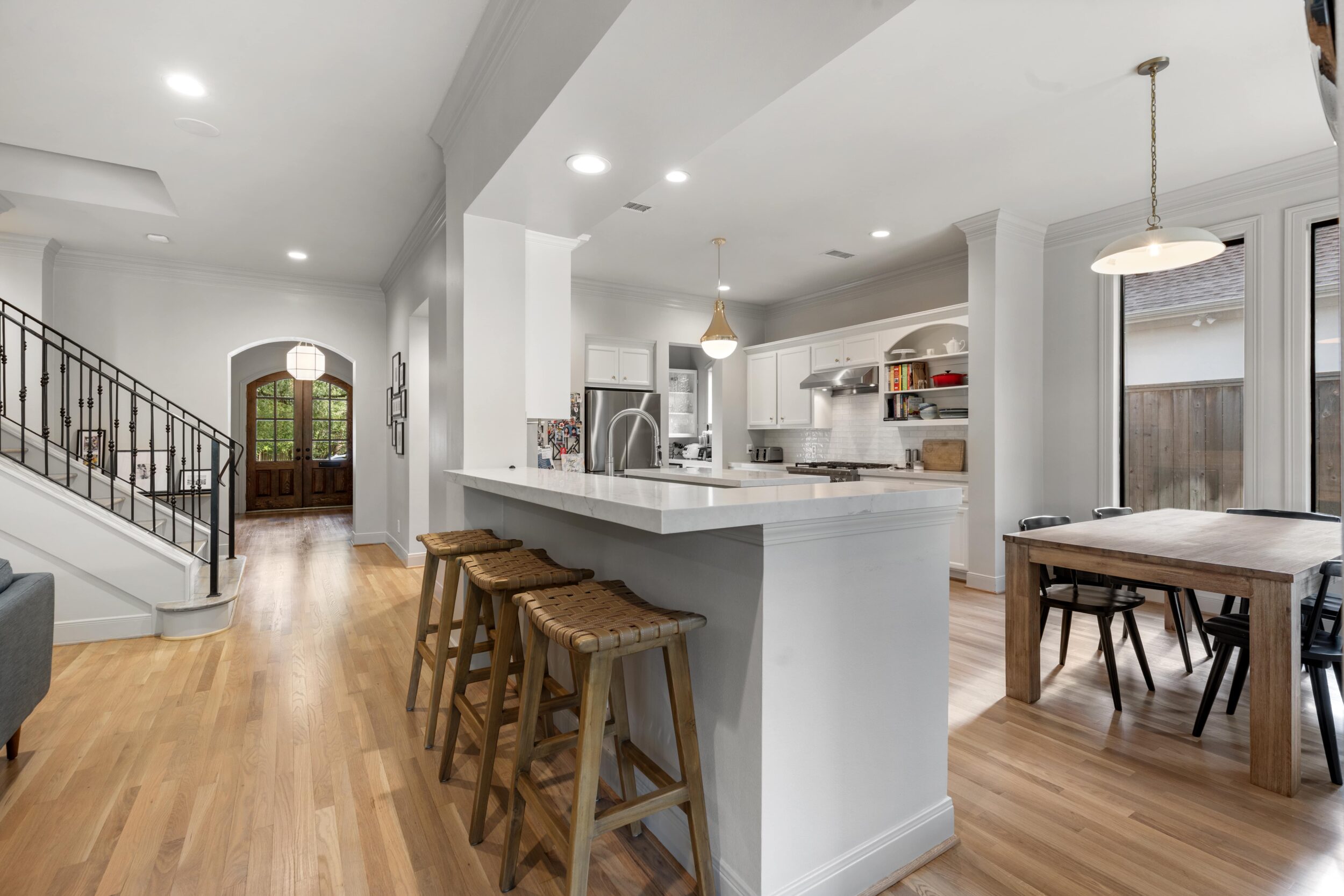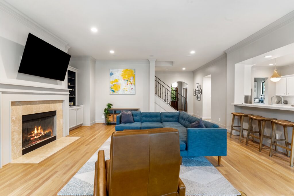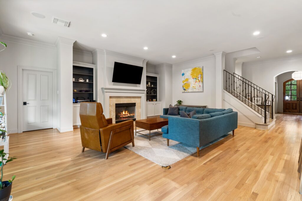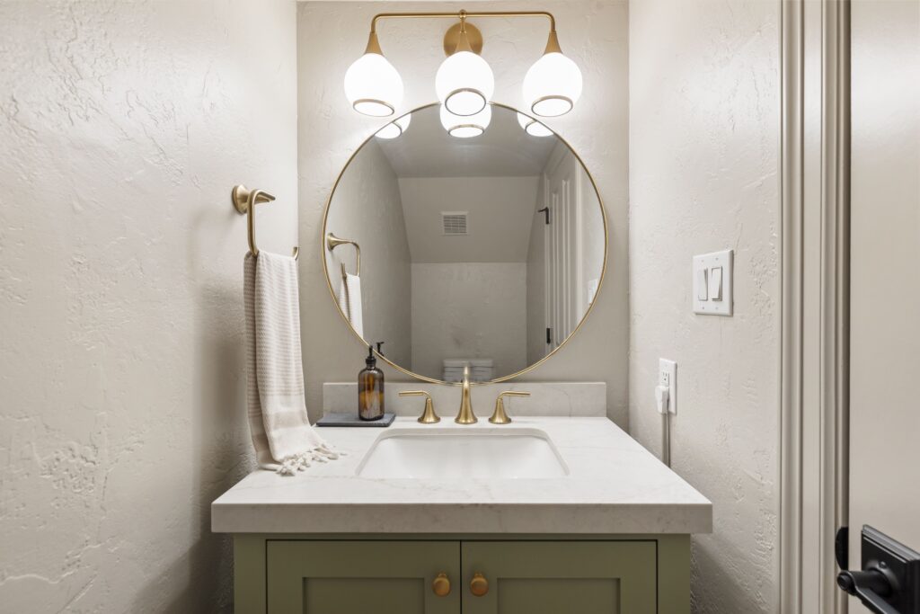 Light removal and replacement, refinished flooring, new cabinetry in select areas, updated kitchen countertops, refreshed living room built-ins, and an elevated powder room design.