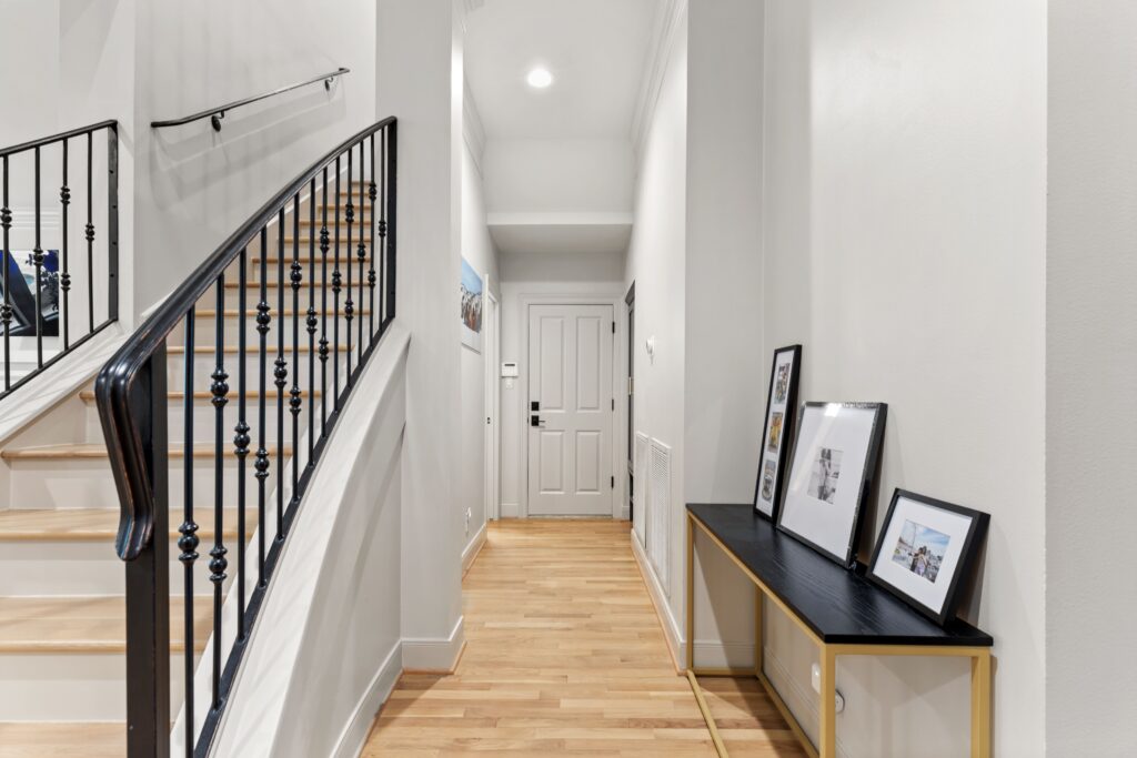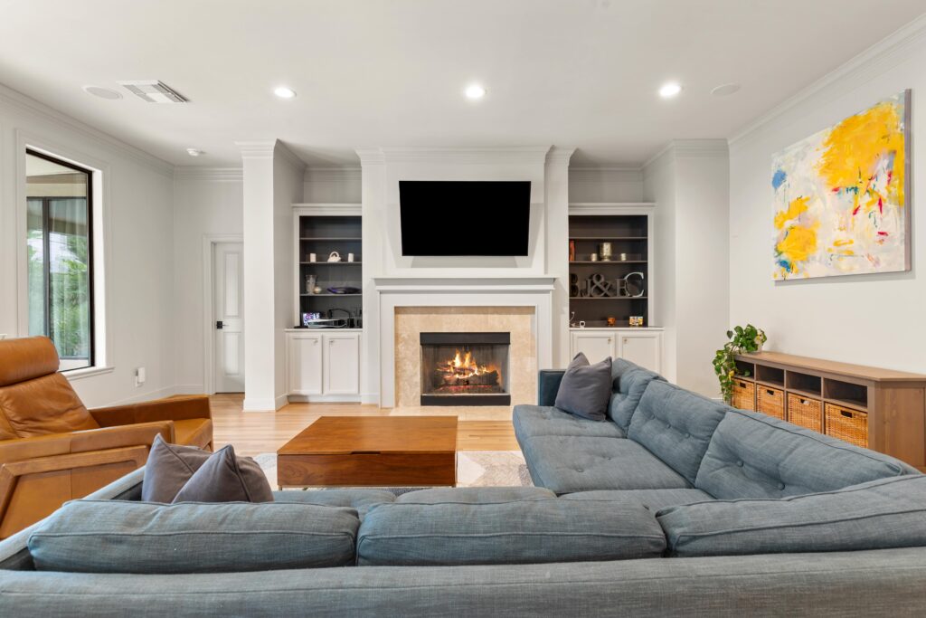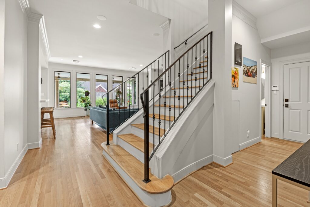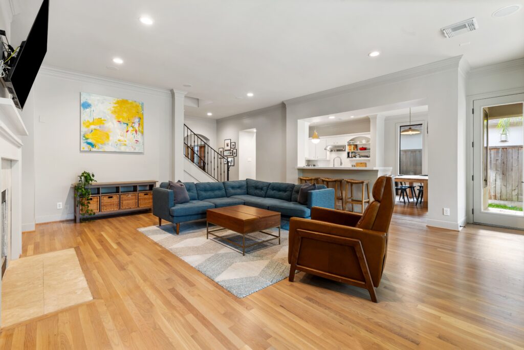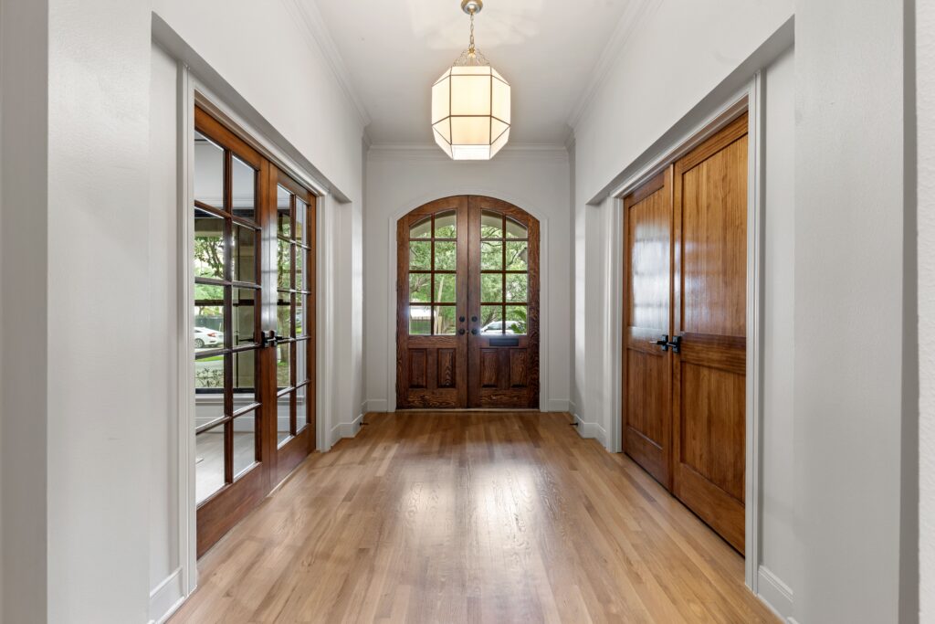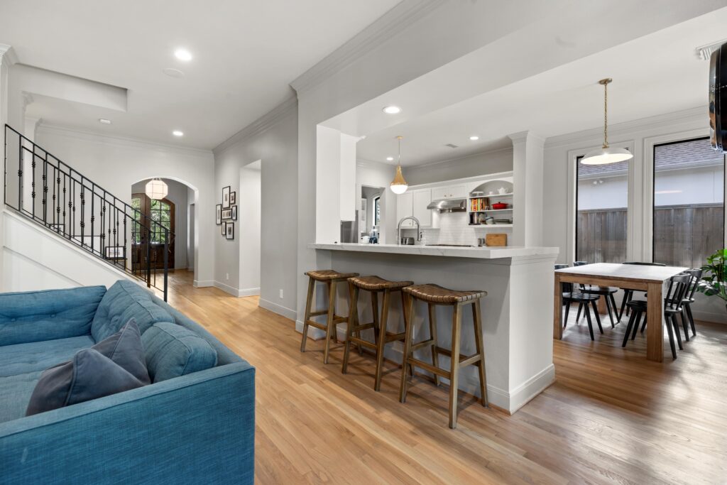 Light removal and replacement, refinished flooring, new cabinetry in select areas, updated kitchen countertops, refreshed living room built-ins, and an elevated powder room design.