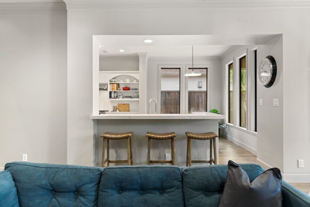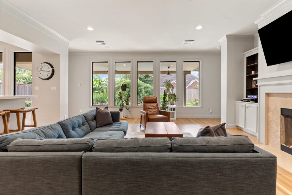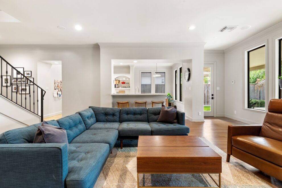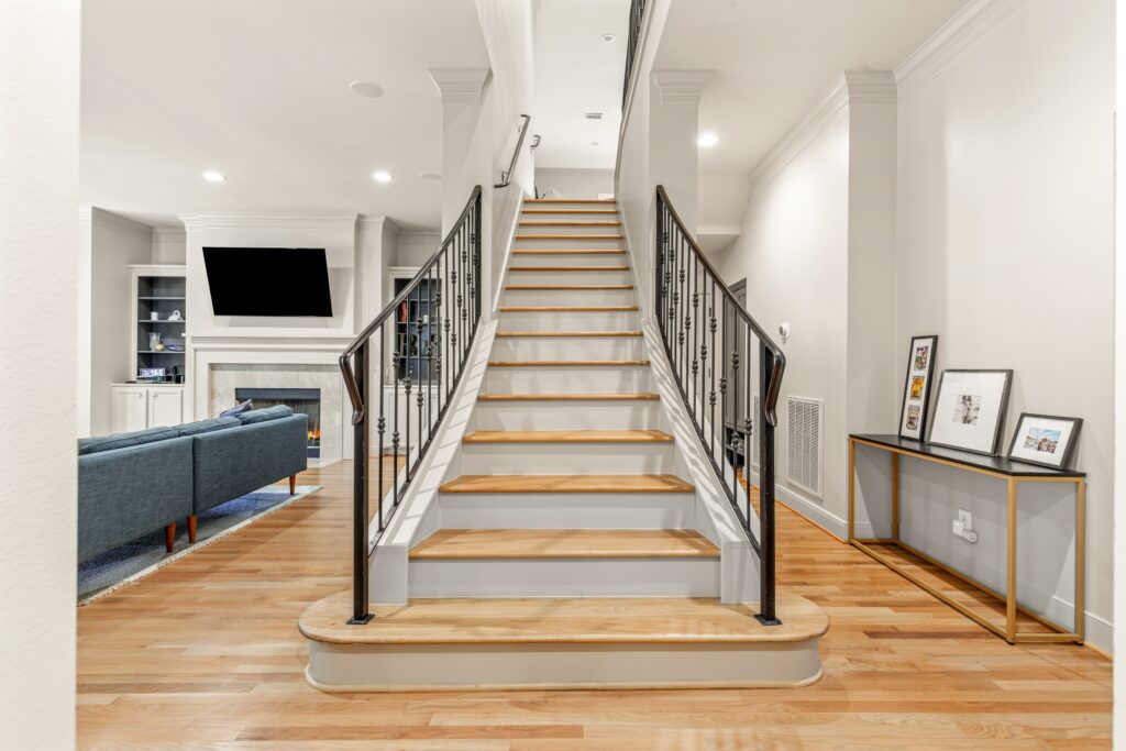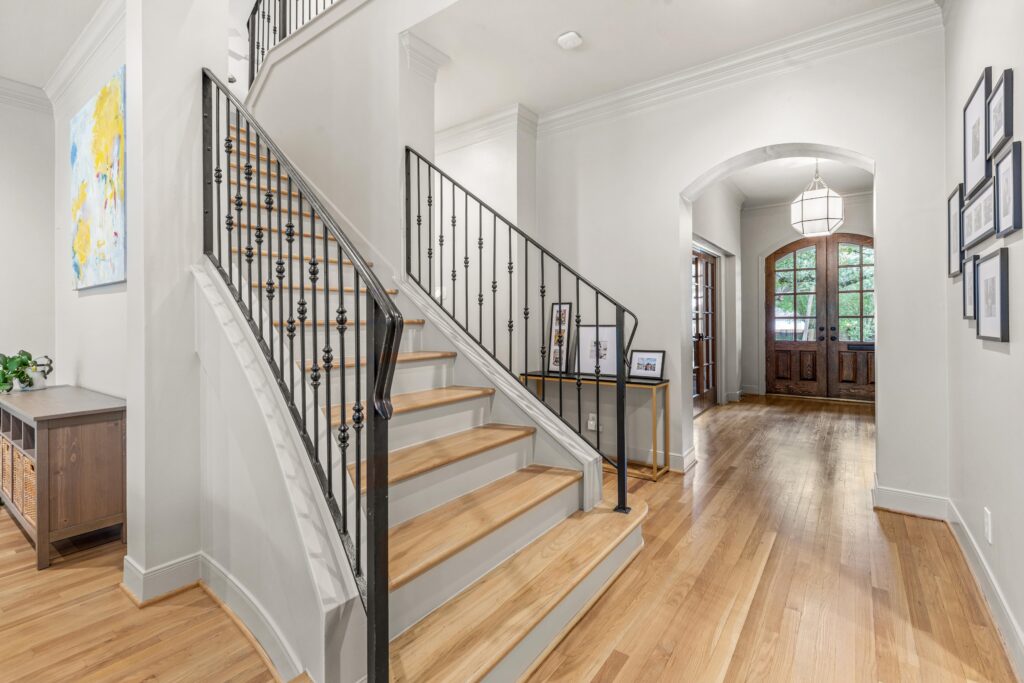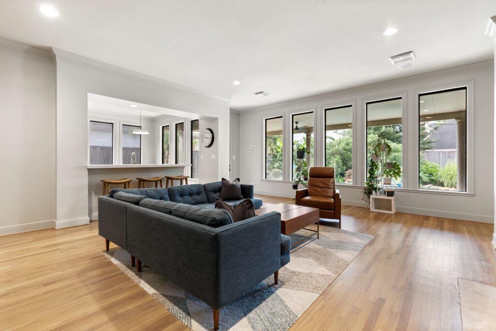 Light removal and replacement, refinished flooring, new cabinetry in select areas, updated kitchen countertops, refreshed living room built-ins, and an elevated powder room design.