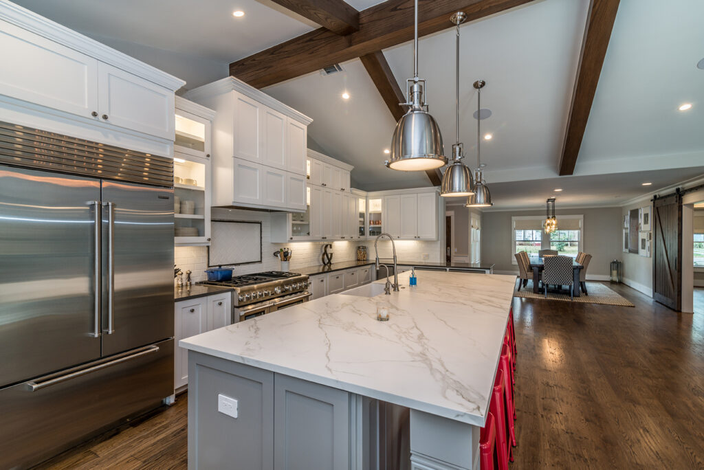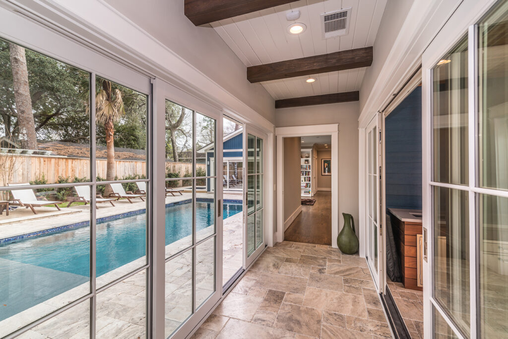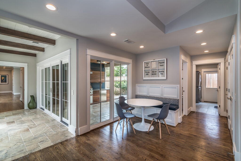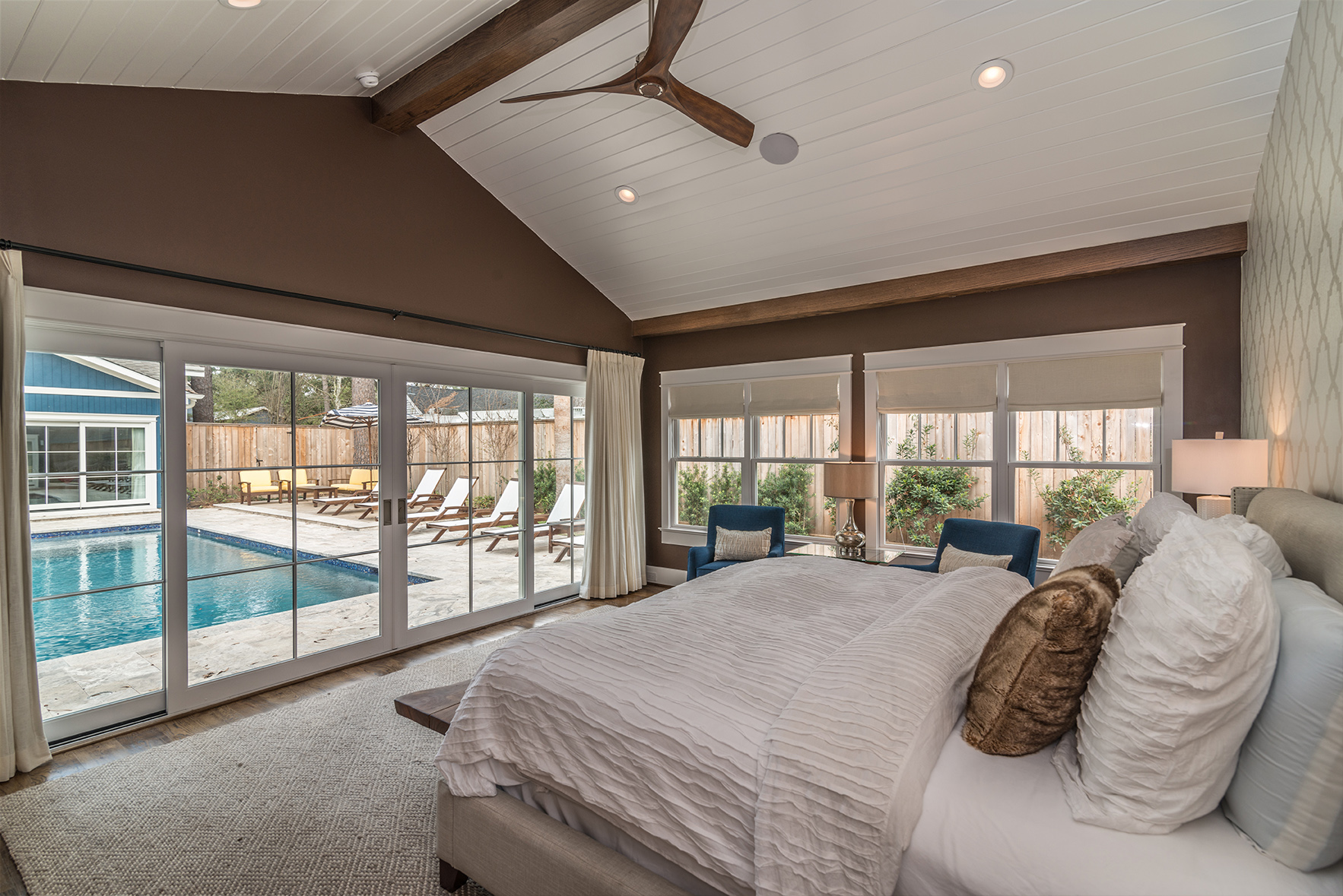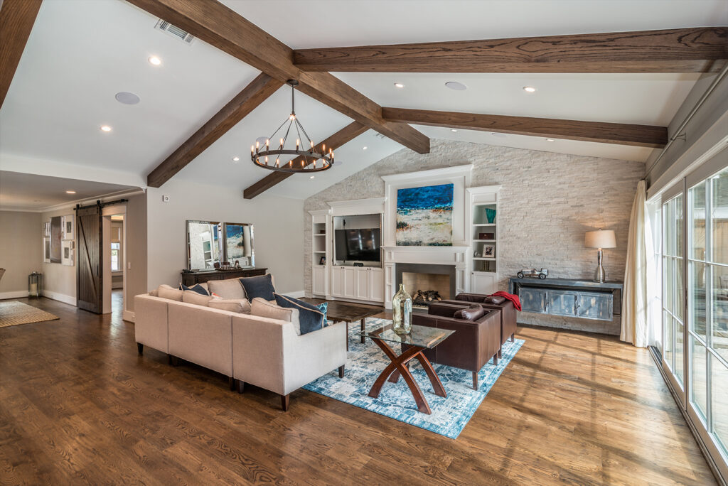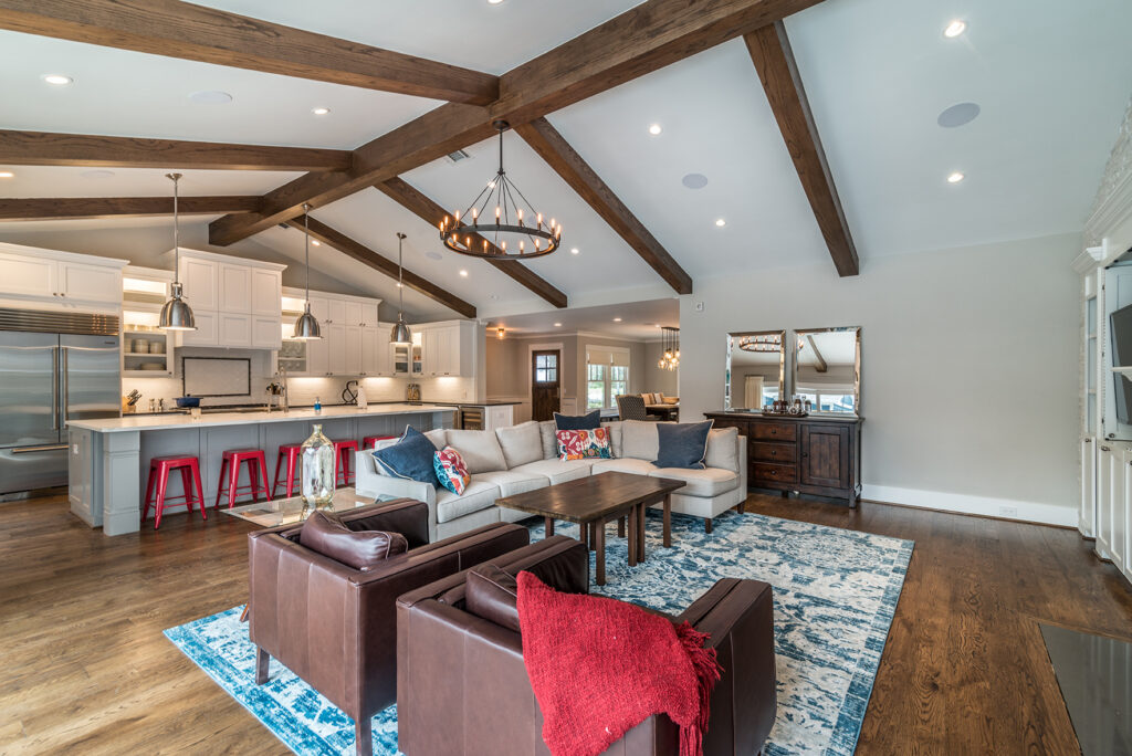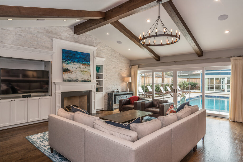 This one story modern take on a craftsman style home was created with an open-concept living space; built around the family patio/pool area to create a more fluid layout focused on an indoor/outdoor living style. Hardwood floors, vaulted ceilings with wood beams and bright windows give this space a nice airy feel on those warm summer days.