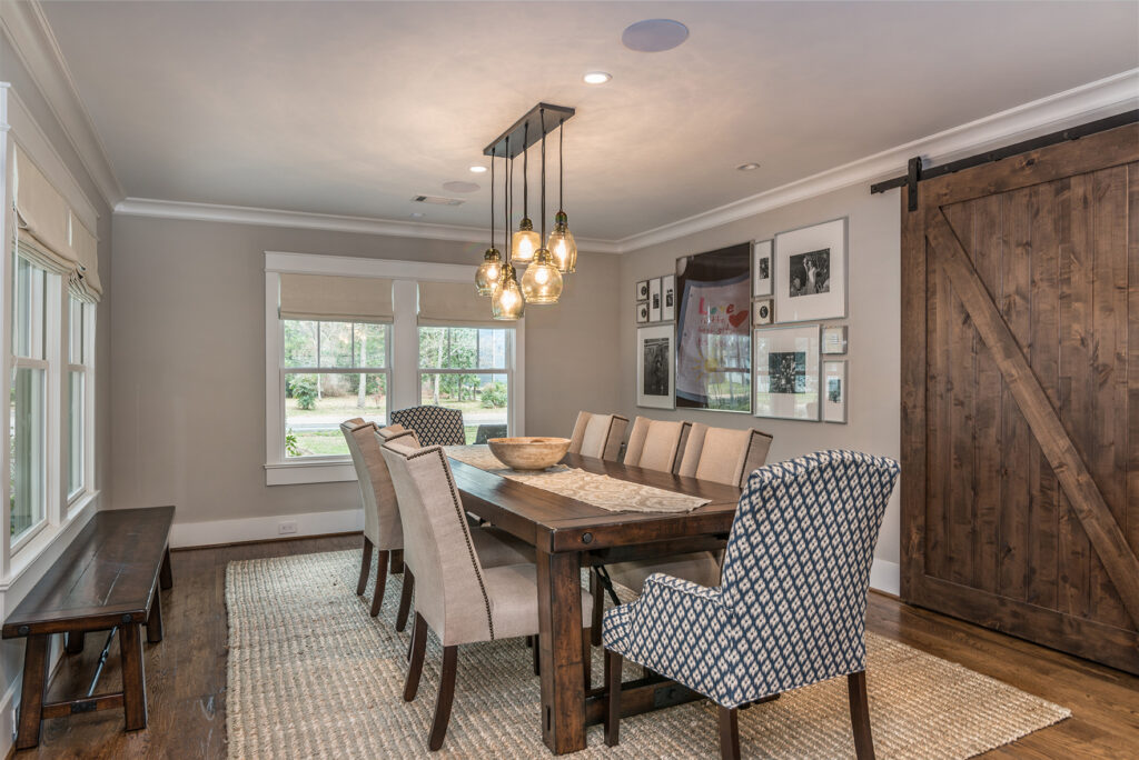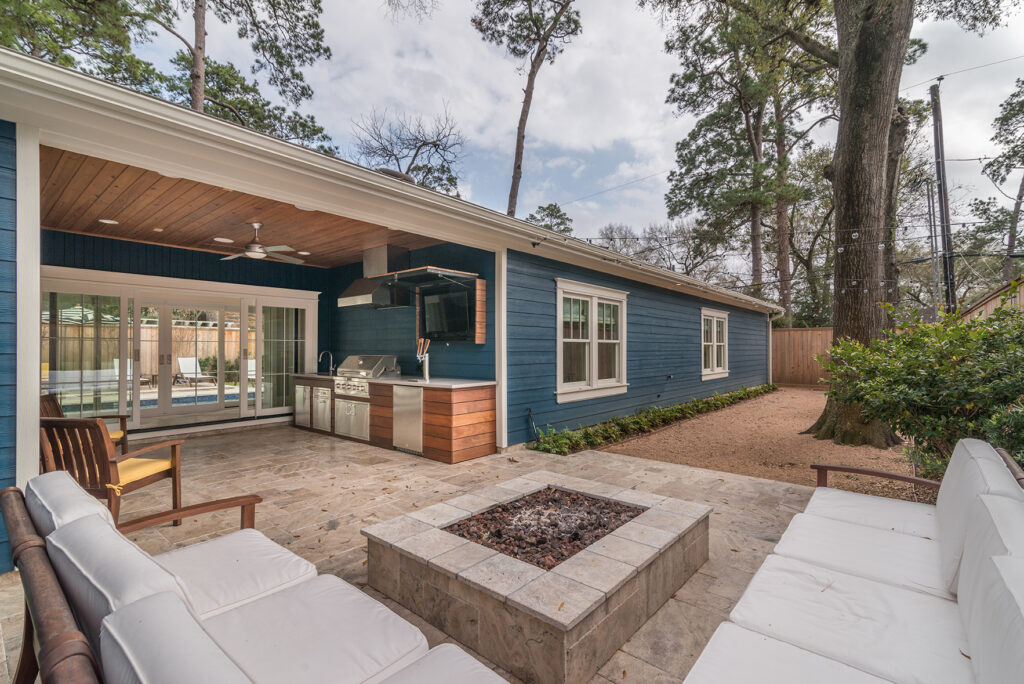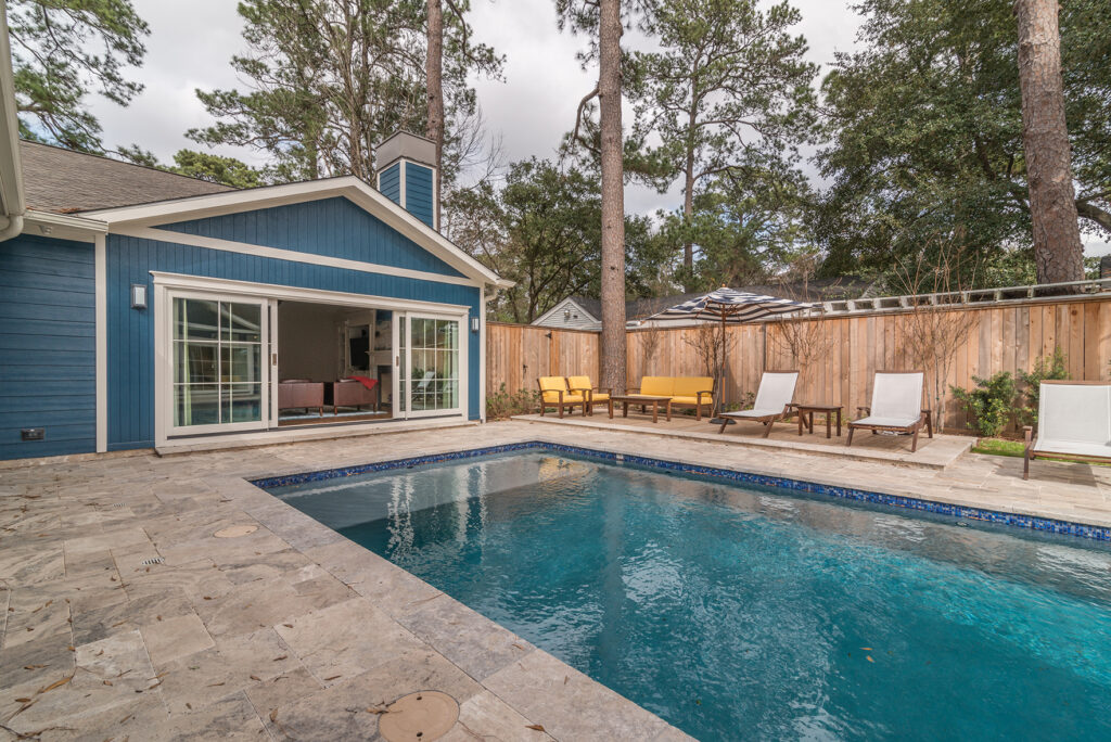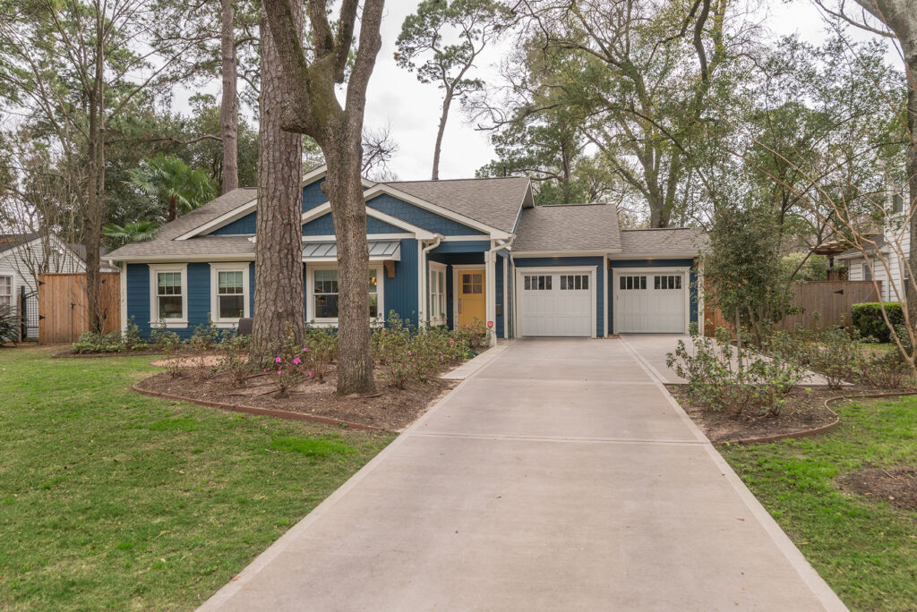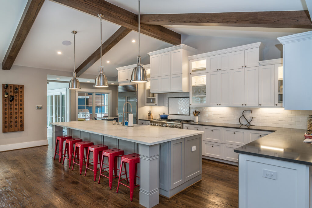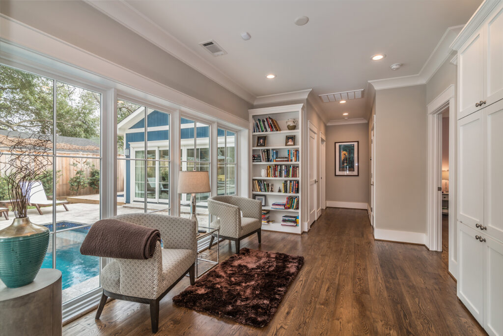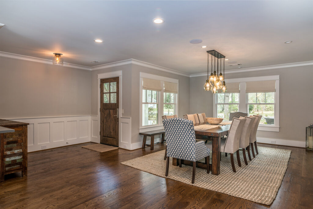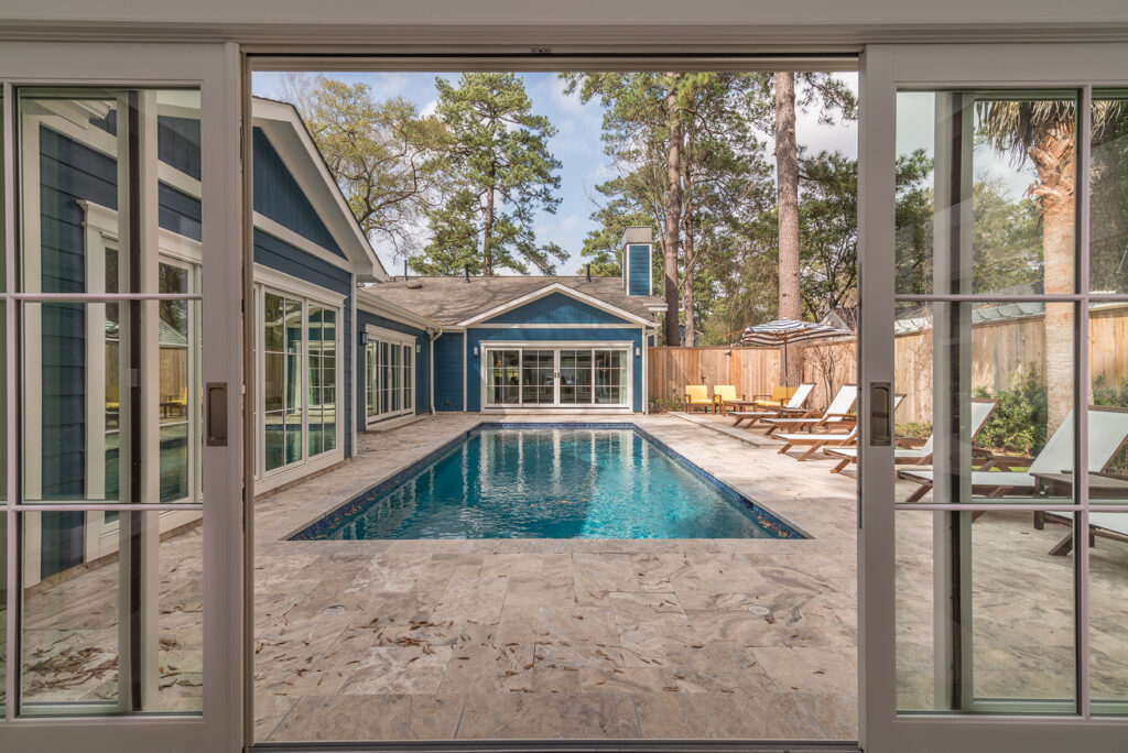 This one story modern take on a craftsman style home was created with an open-concept living space; built around the family patio/pool area to create a more fluid layout focused on an indoor/outdoor living style. Hardwood floors, vaulted ceilings with wood beams and bright windows give this space a nice airy feel on those warm summer days.
