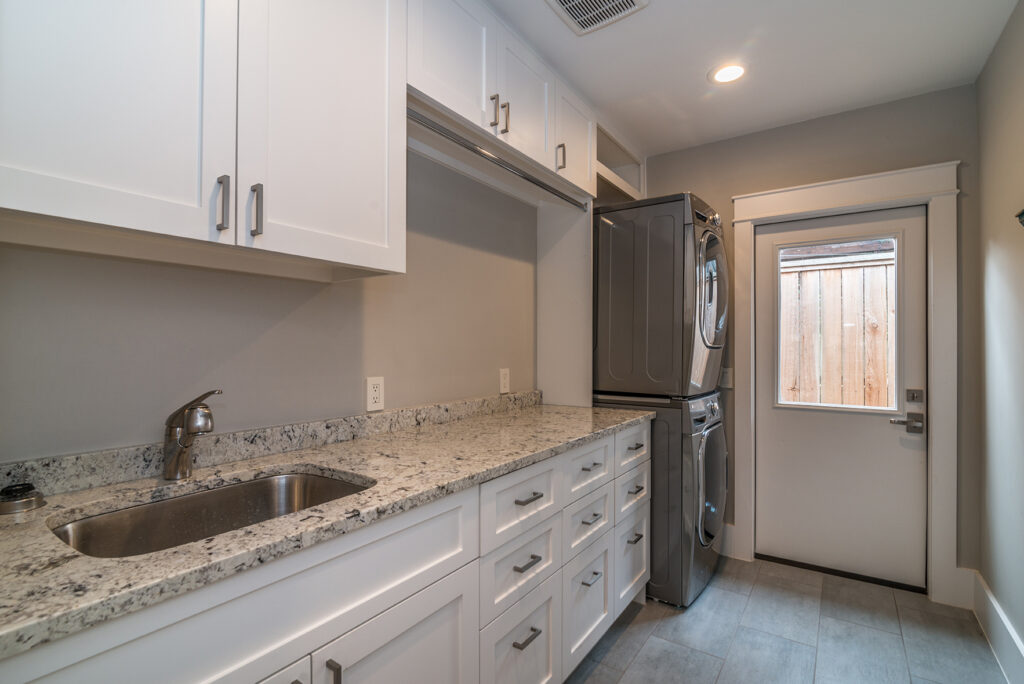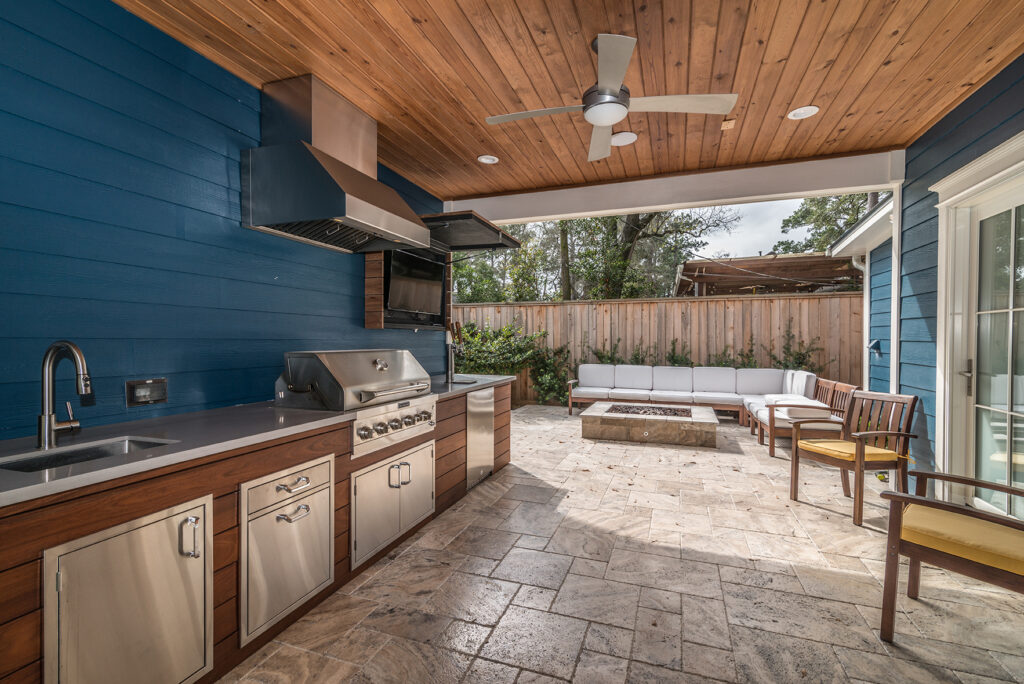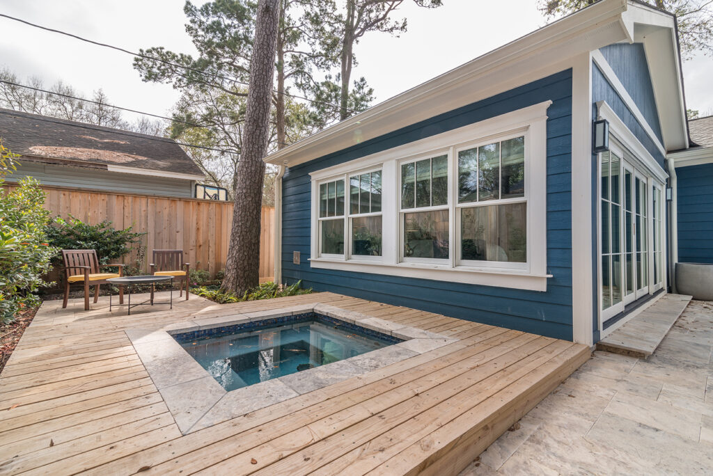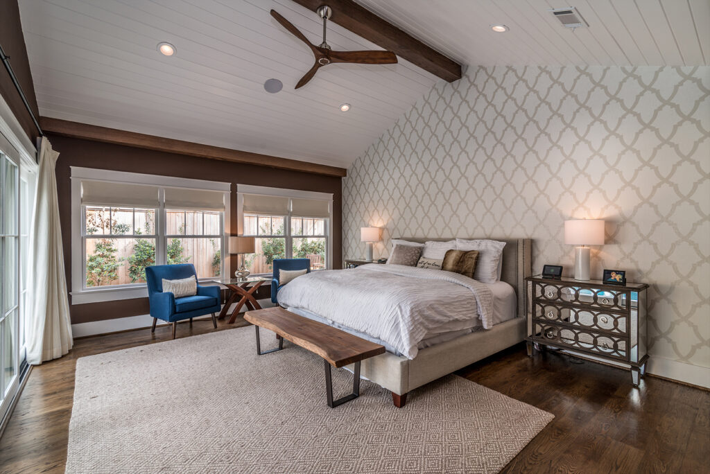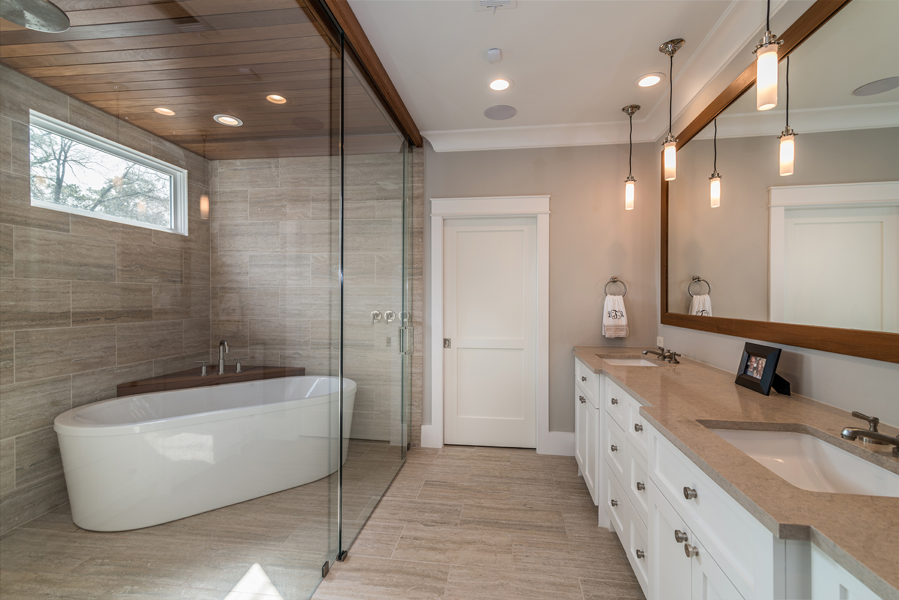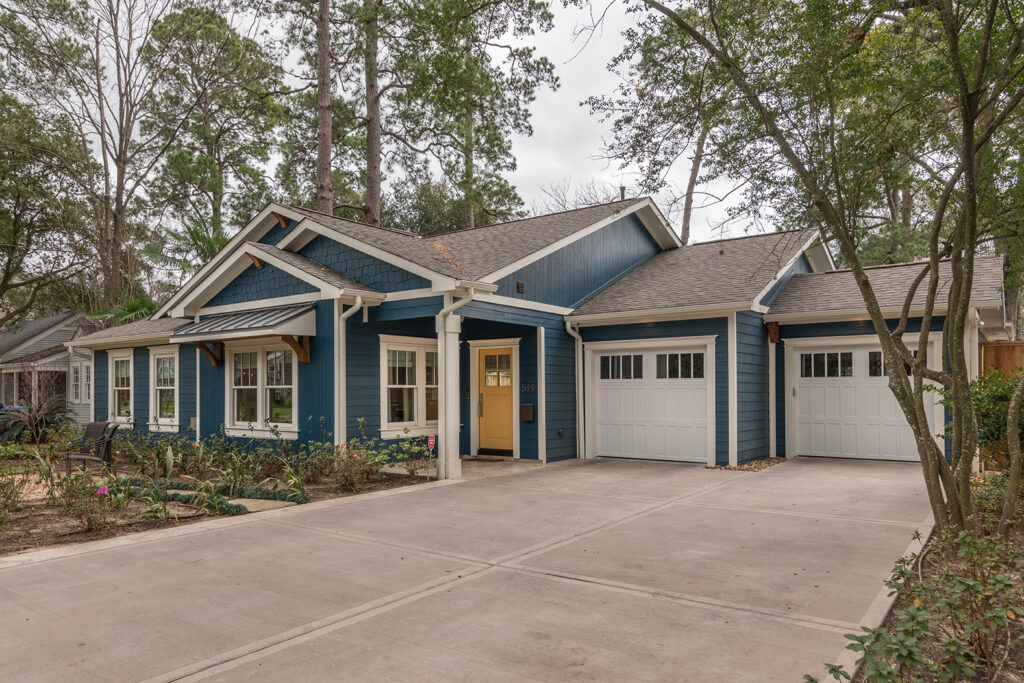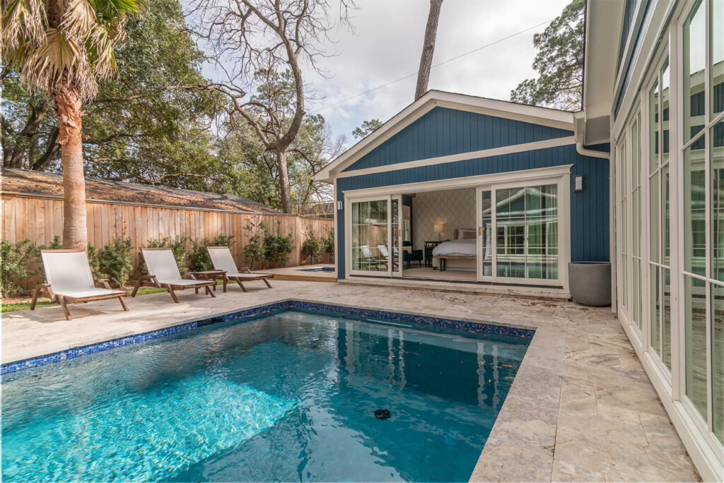 This one story modern take on a craftsman style home was created with an open-concept living space; built around the family patio/pool area to create a more fluid layout focused on an indoor/outdoor living style. Hardwood floors, vaulted ceilings with wood beams and bright windows give this space a nice airy feel on those warm summer days.