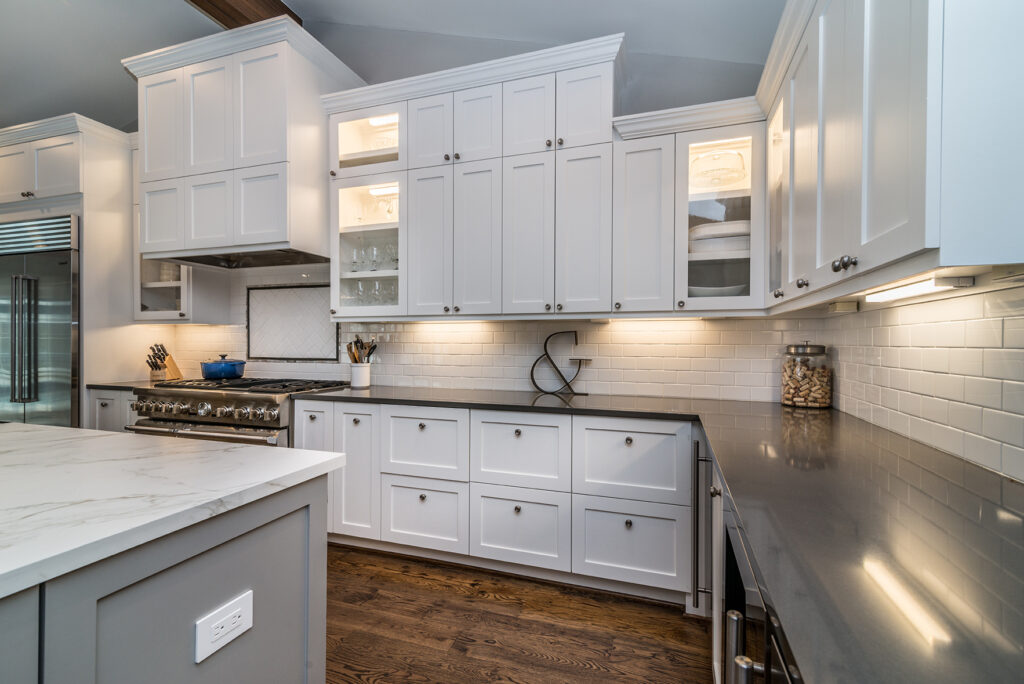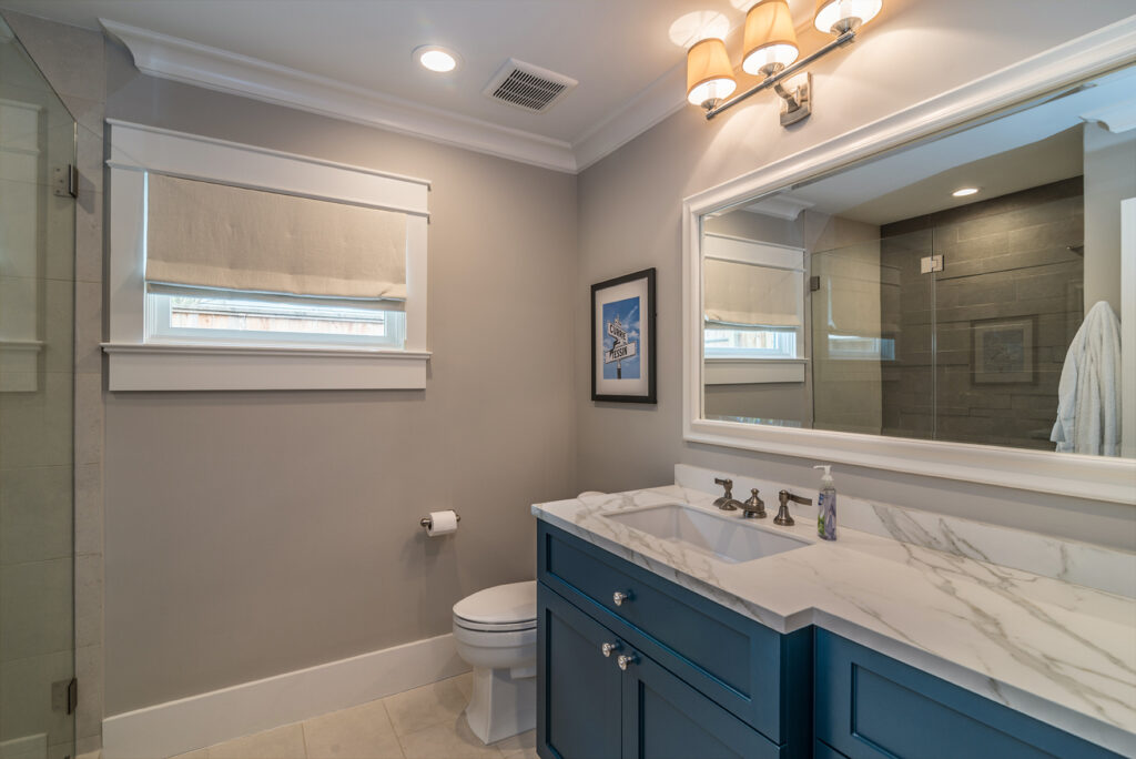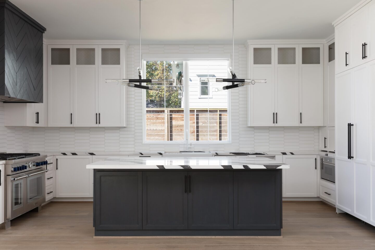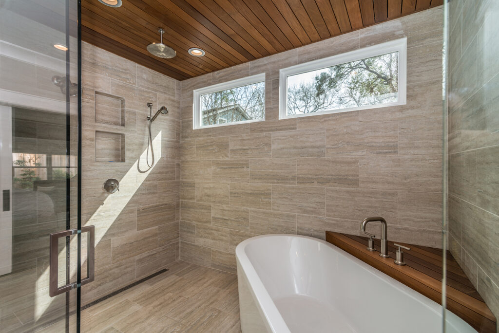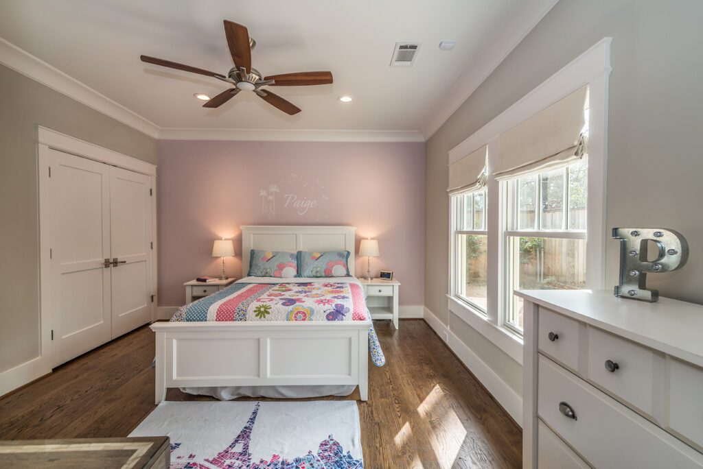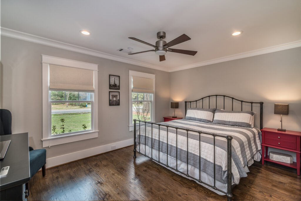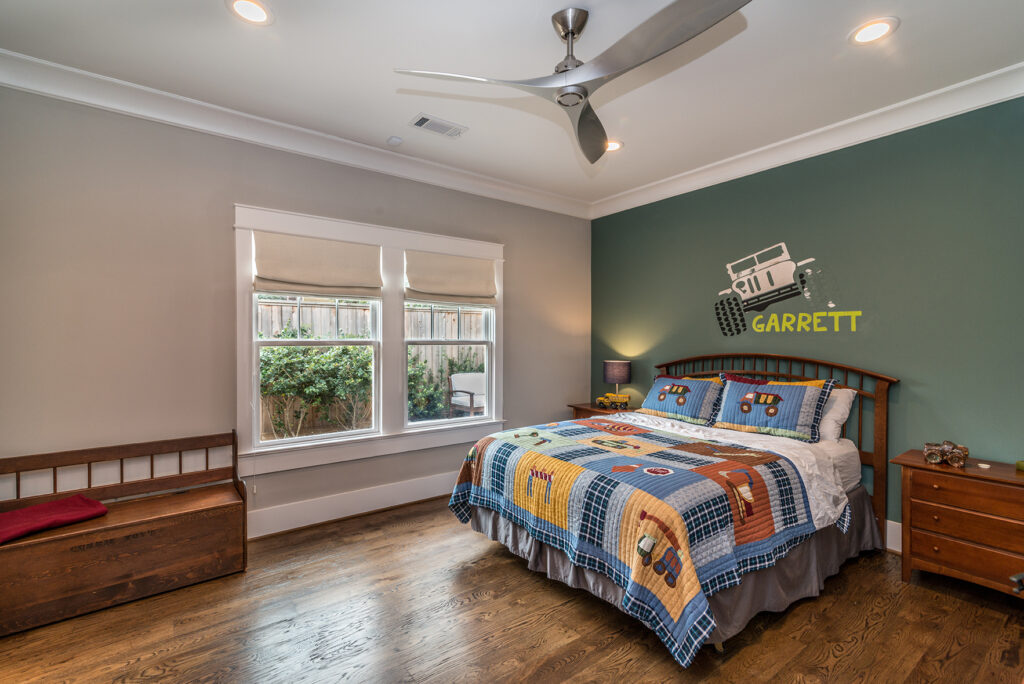 This one story modern take on a craftsman style home was created with an open-concept living space; built around the family patio/pool area to create a more fluid layout focused on an indoor/outdoor living style. Hardwood floors, vaulted ceilings with wood beams and bright windows give this space a nice airy feel on those warm summer days.