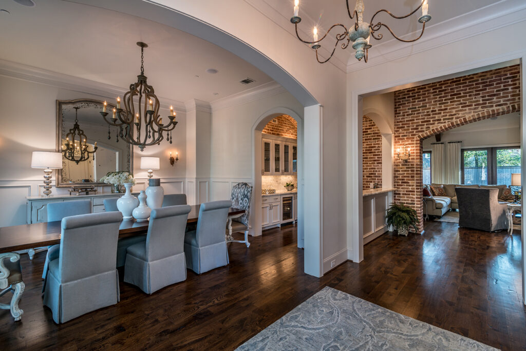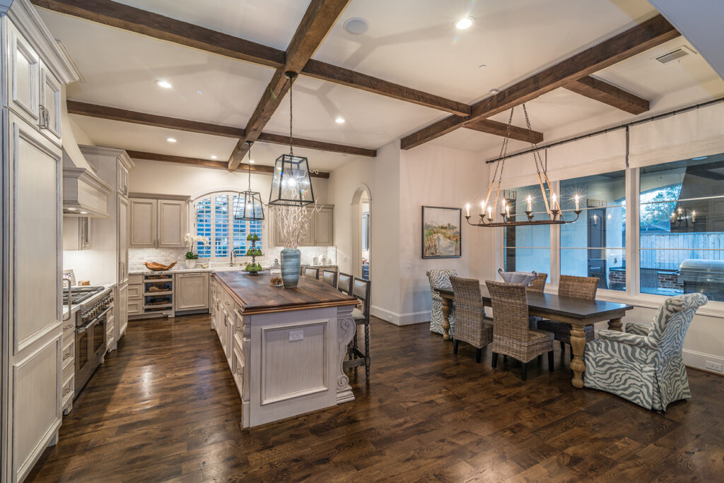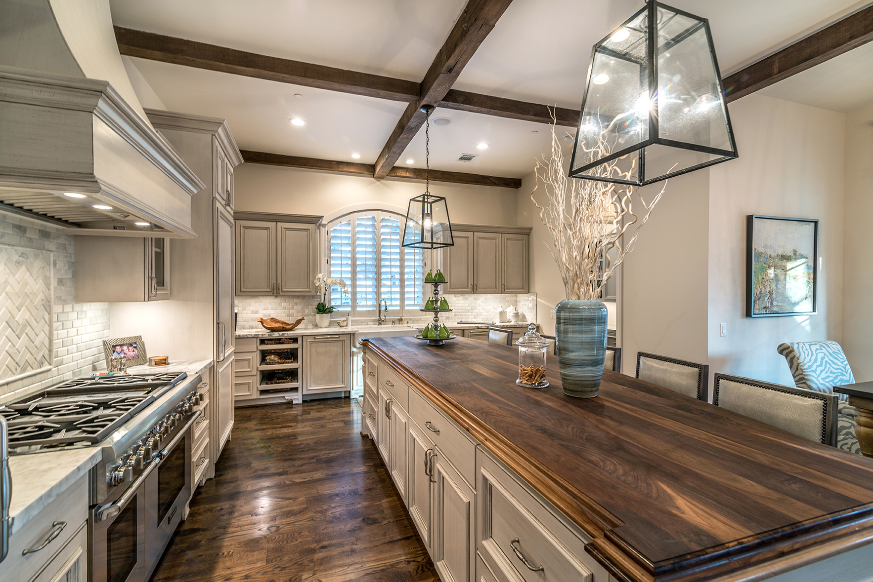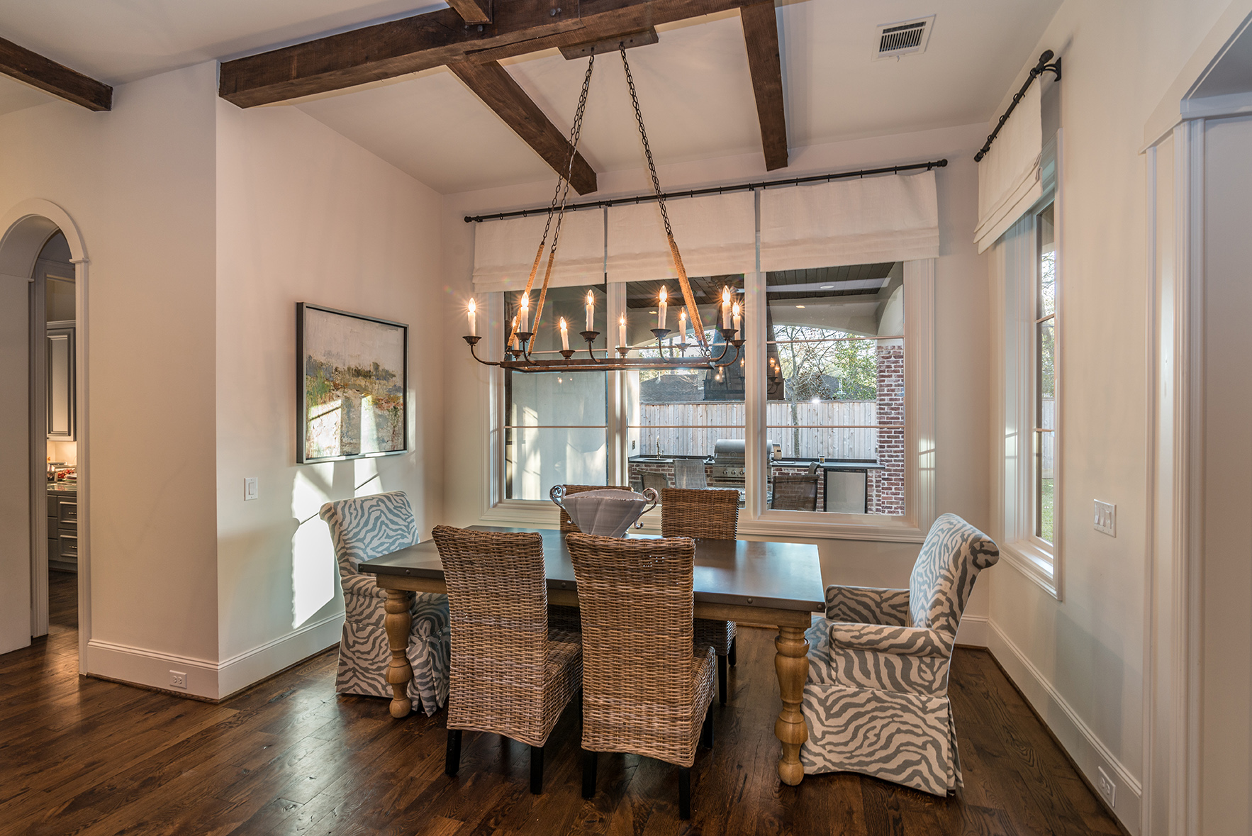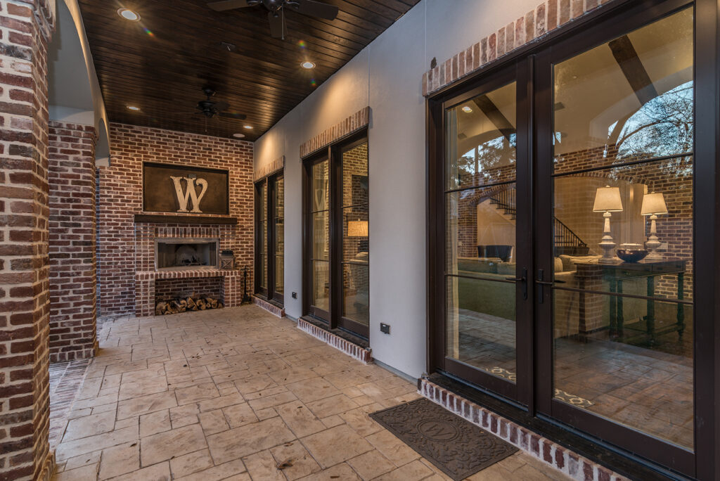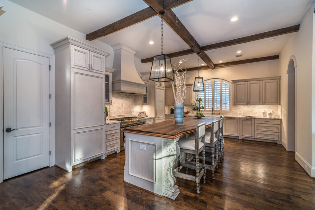 An elegant european country style home featuring high ceilings, dark wood floors and classic french doors that are complimented with rustic wood beams. Custom brickwork runs throughout the interior and exterior of the home that brings a unique old world feel.