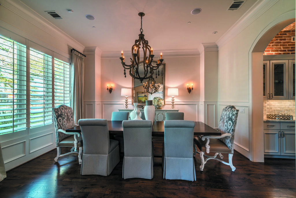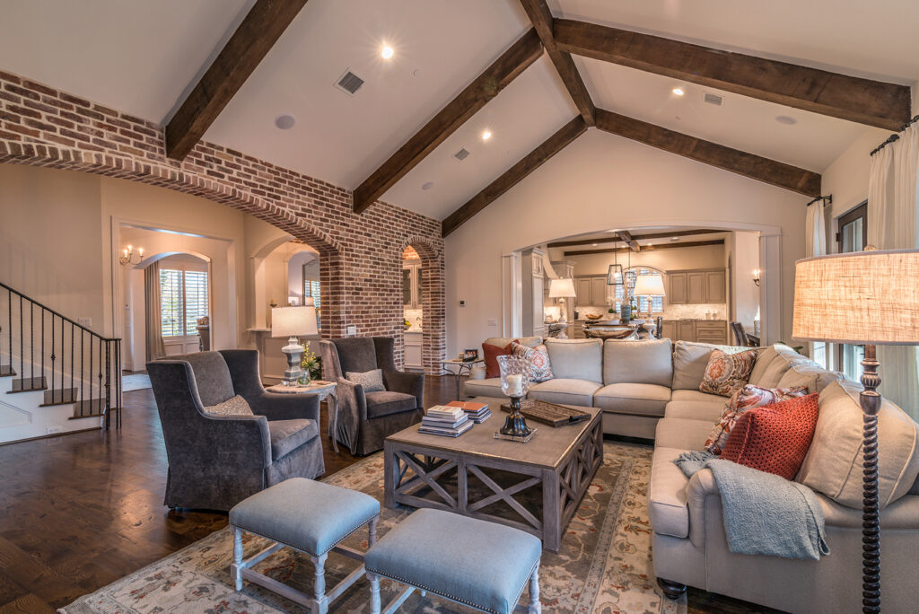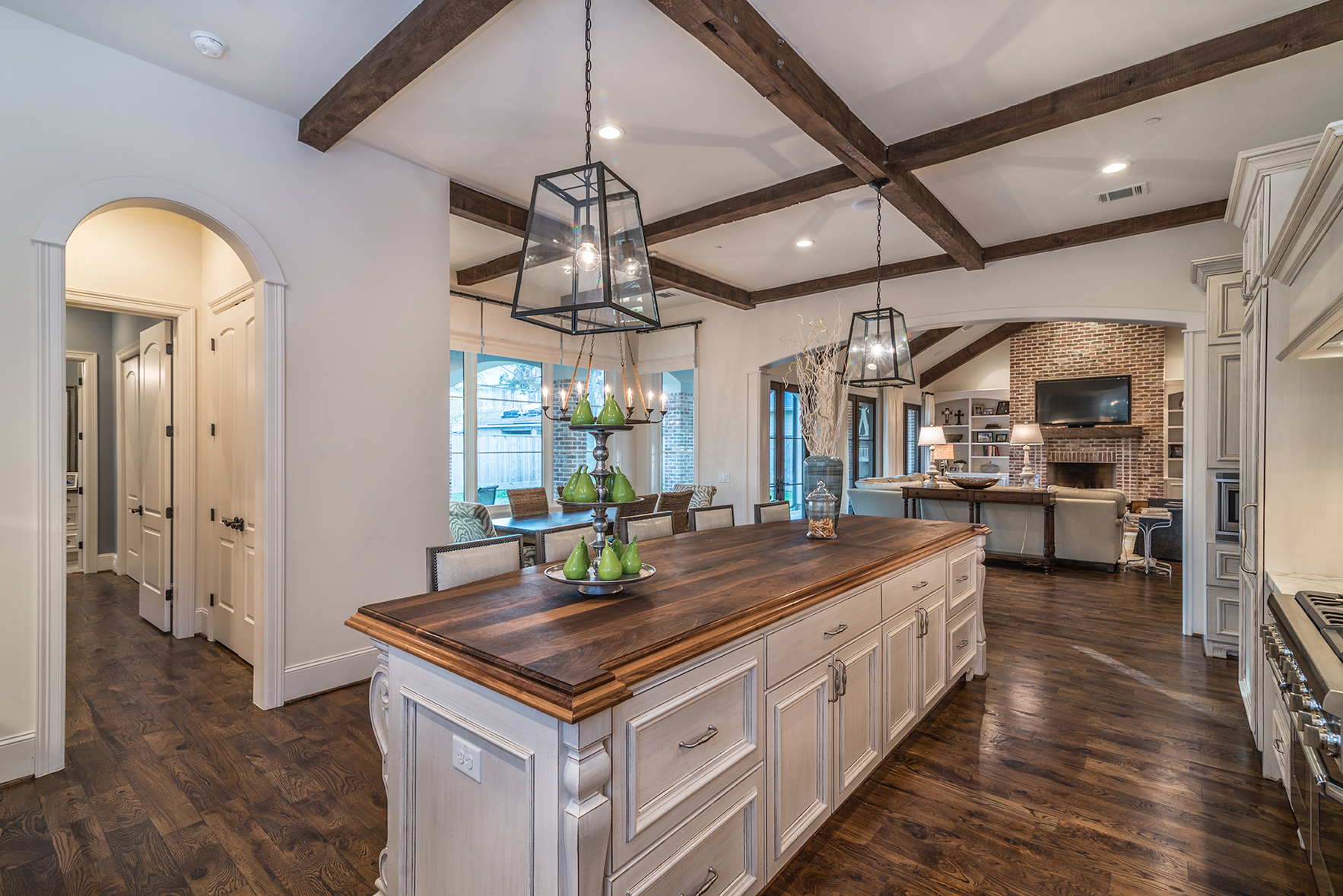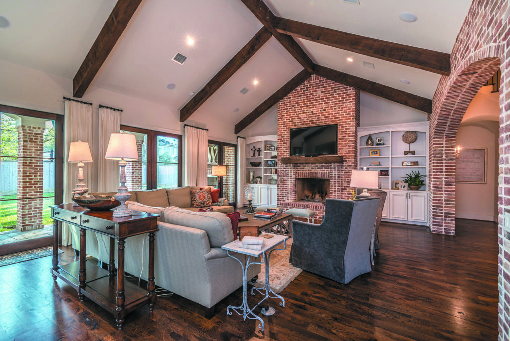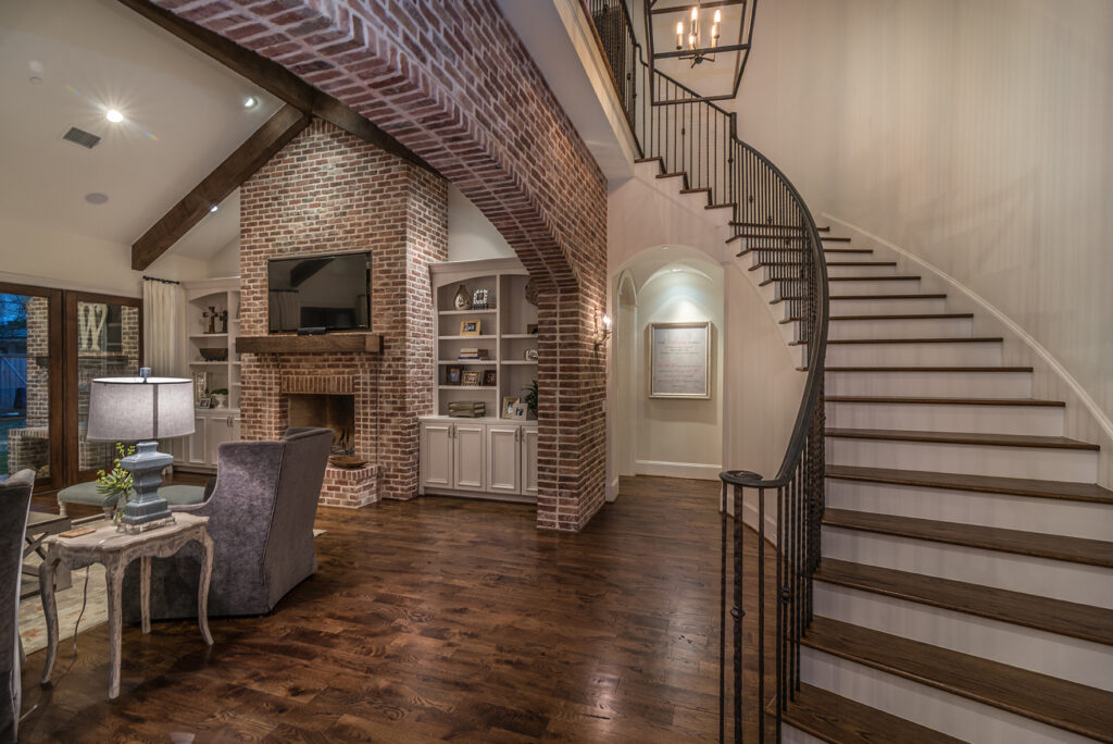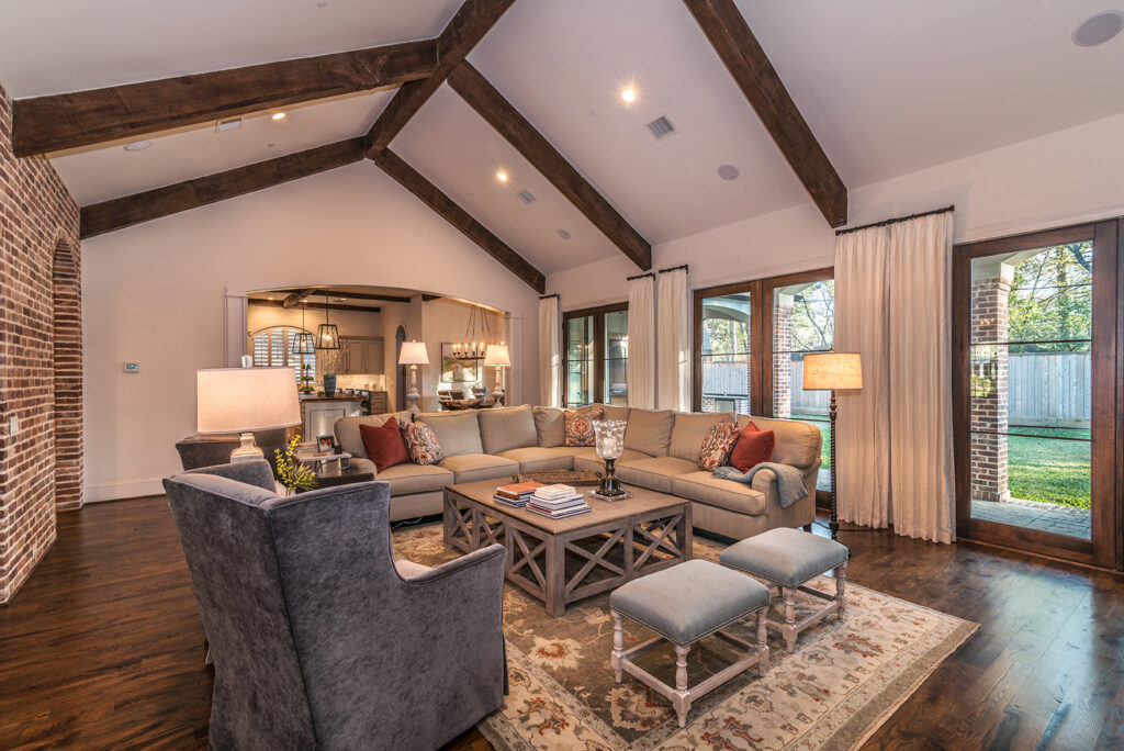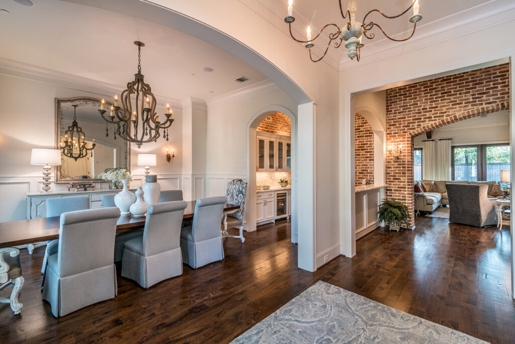 An elegant european country style home featuring high ceilings, dark wood floors and classic french doors that are complimented with rustic wood beams. Custom brickwork runs throughout the interior and exterior of the home that brings a unique old world feel.