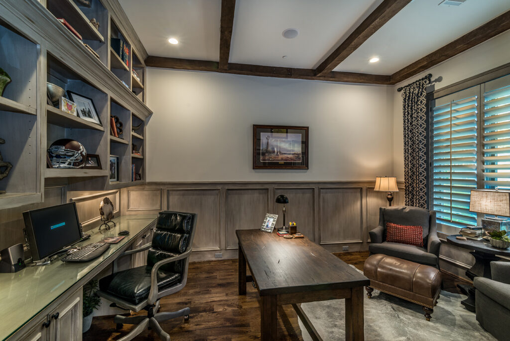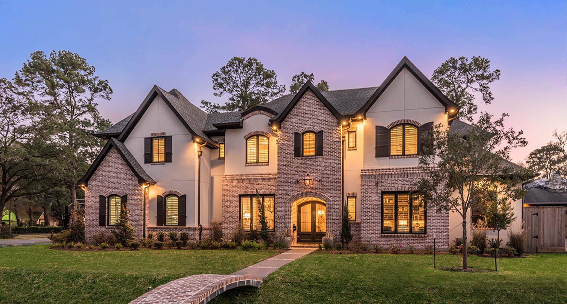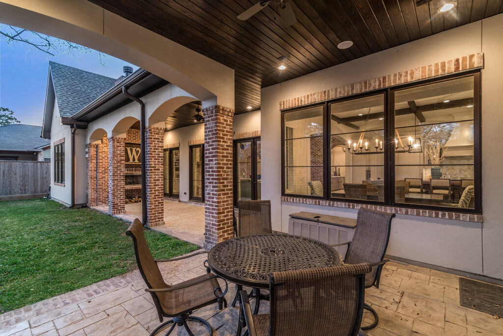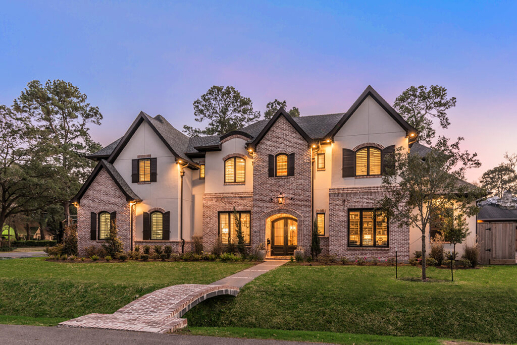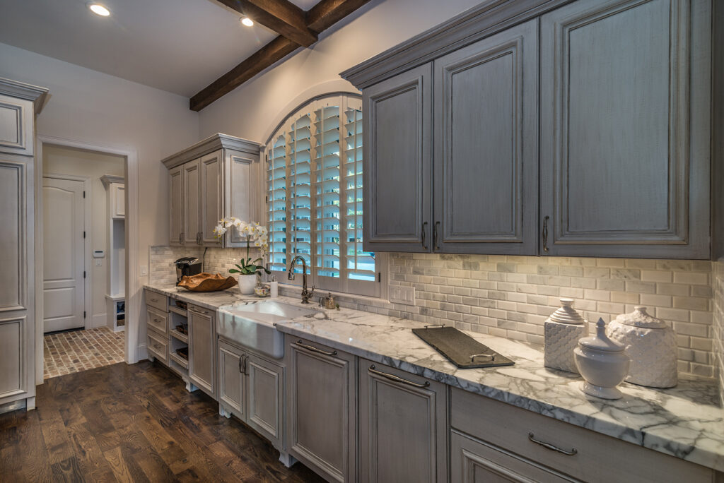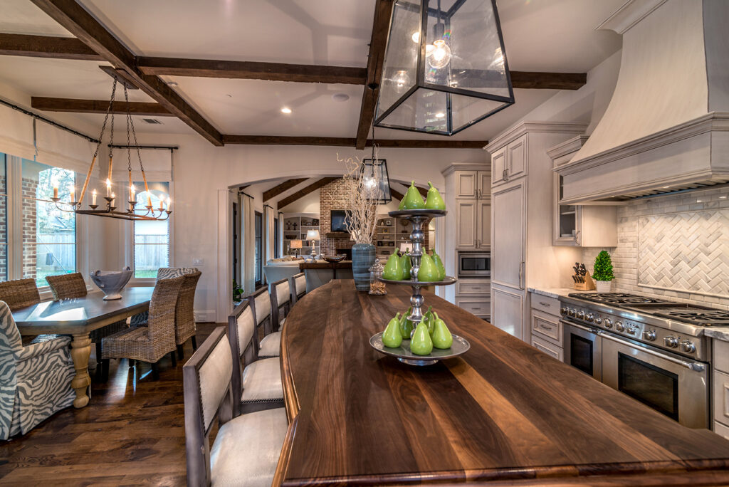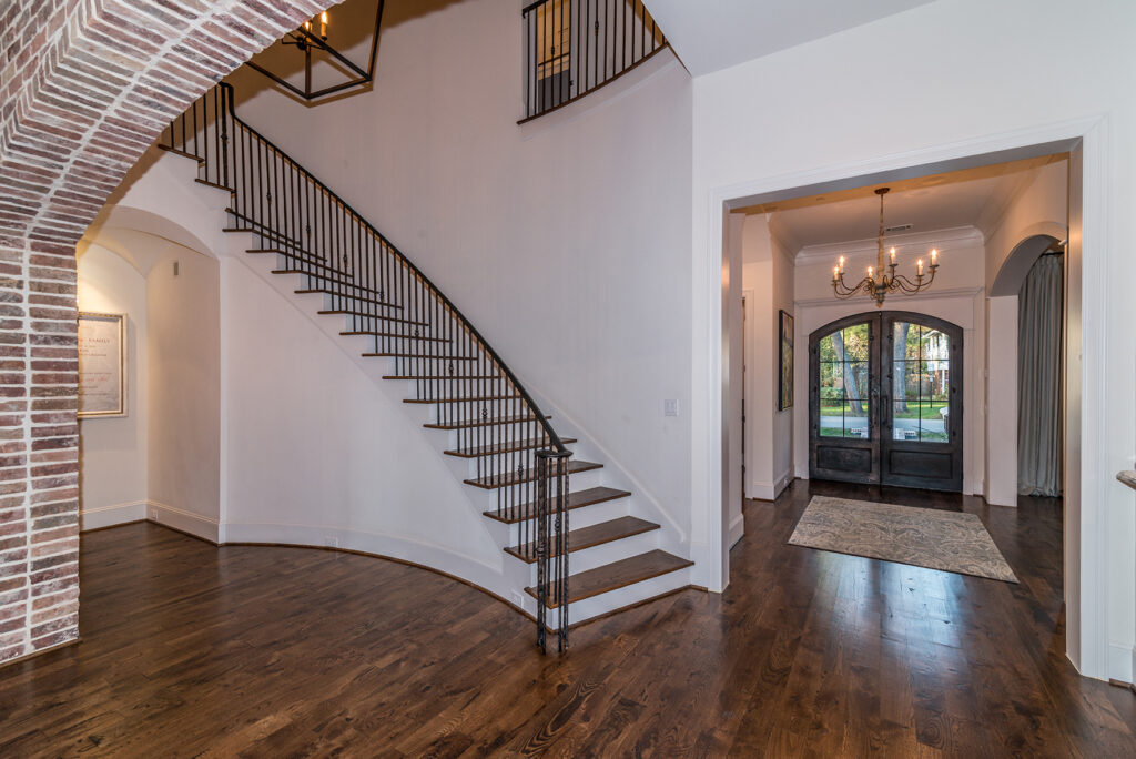 An elegant european country style home featuring high ceilings, dark wood floors and classic french doors that are complimented with rustic wood beams. Custom brickwork runs throughout the interior and exterior of the home that brings a unique old world feel.