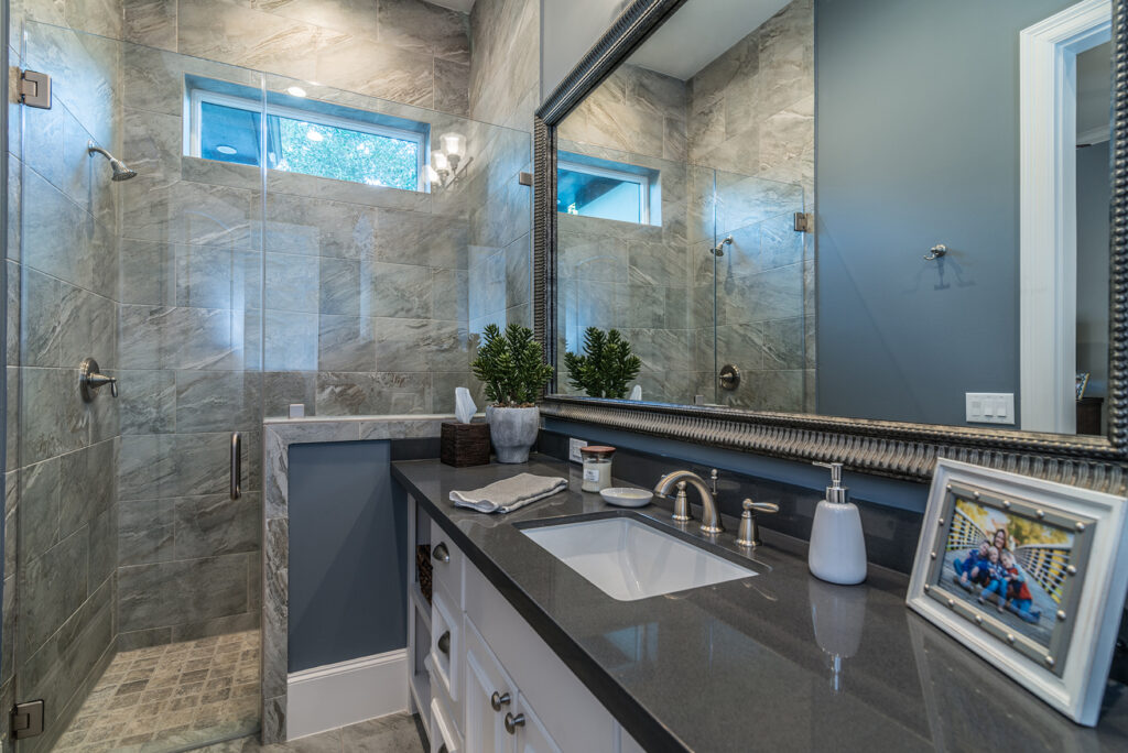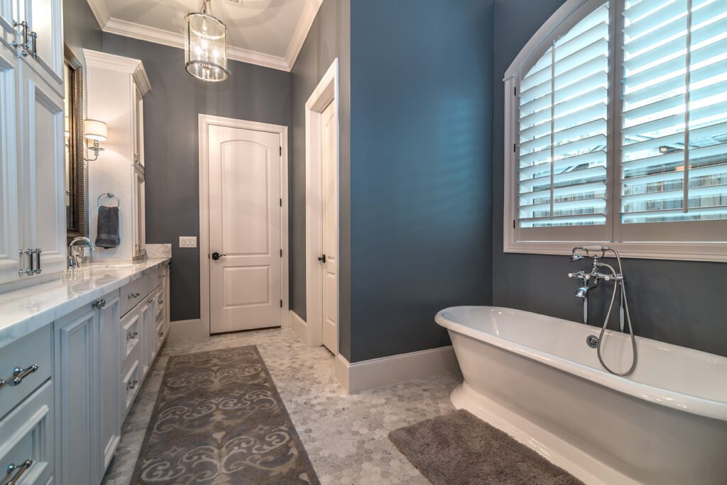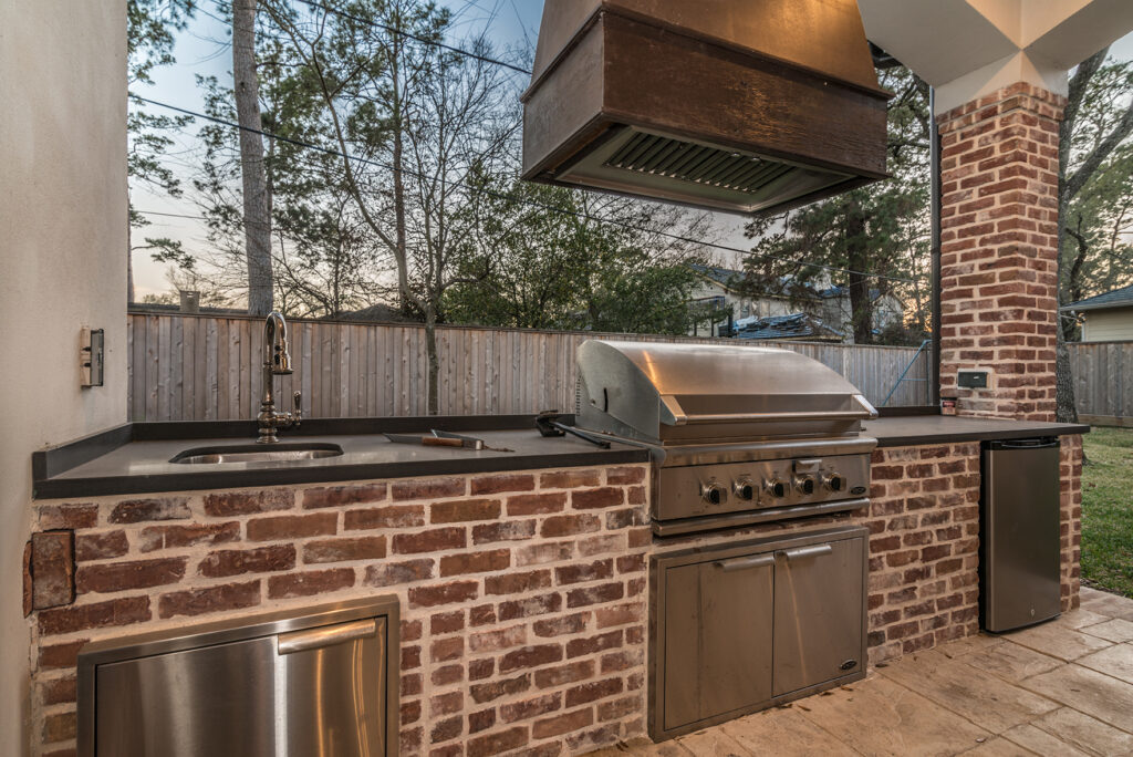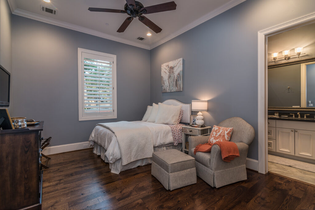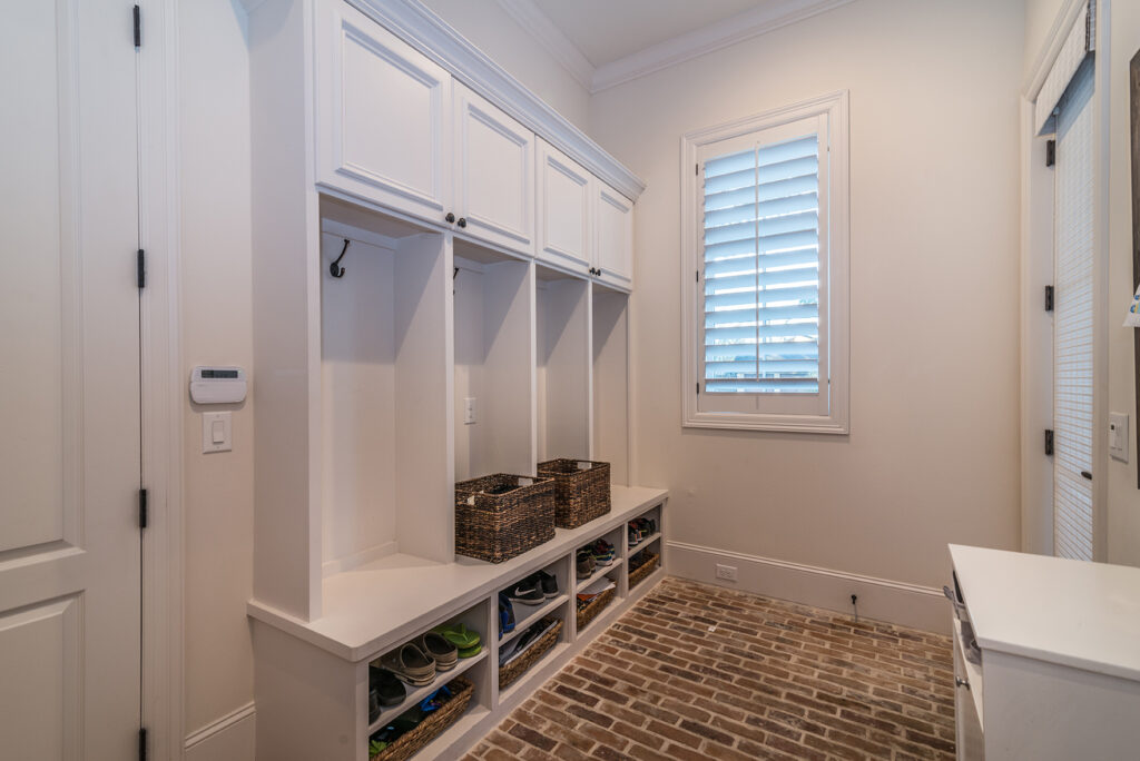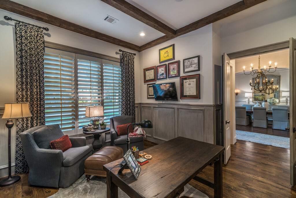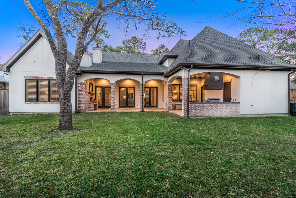 An elegant european country style home featuring high ceilings, dark wood floors and classic french doors that are complimented with rustic wood beams. Custom brickwork runs throughout the interior and exterior of the home that brings a unique old world feel.