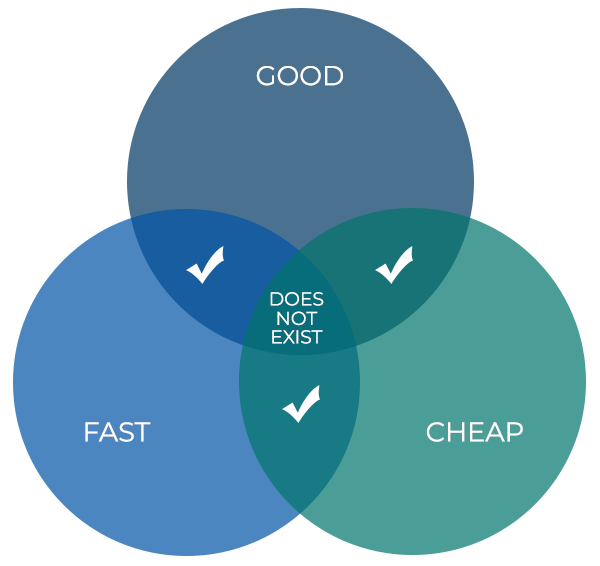 When it comes to timelines and schedules, keep this idea in mind; there are three attributes to every project: good, fast, and cheap. And unfortunately, you can only ever choose two. So if you pick fast + cheap, then you’re sacrificing quality. On the other hand, a good + cheap project is going to take a long, long time to complete. And finally, good + fast is going to cost you a premium.
