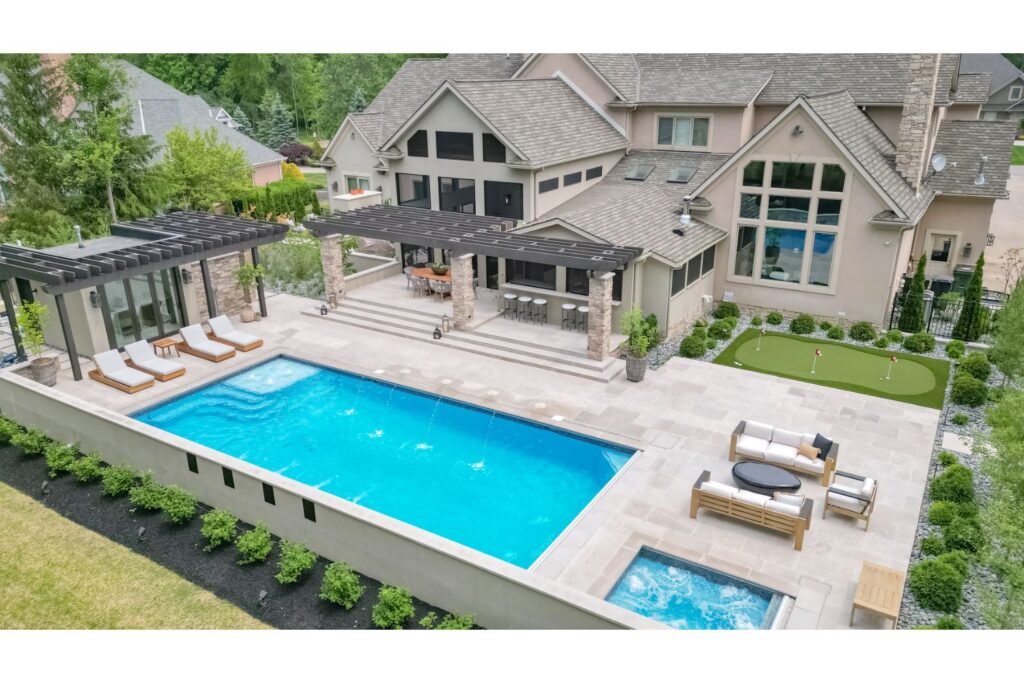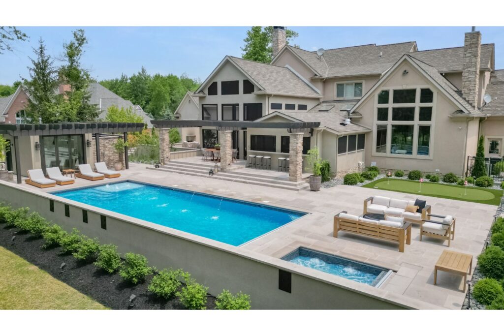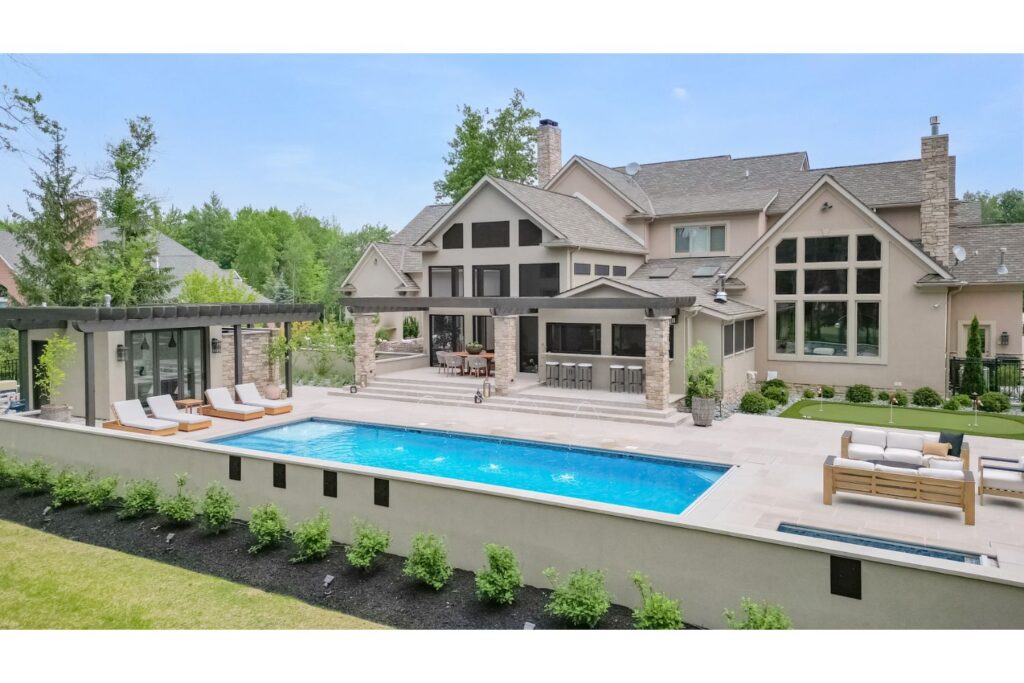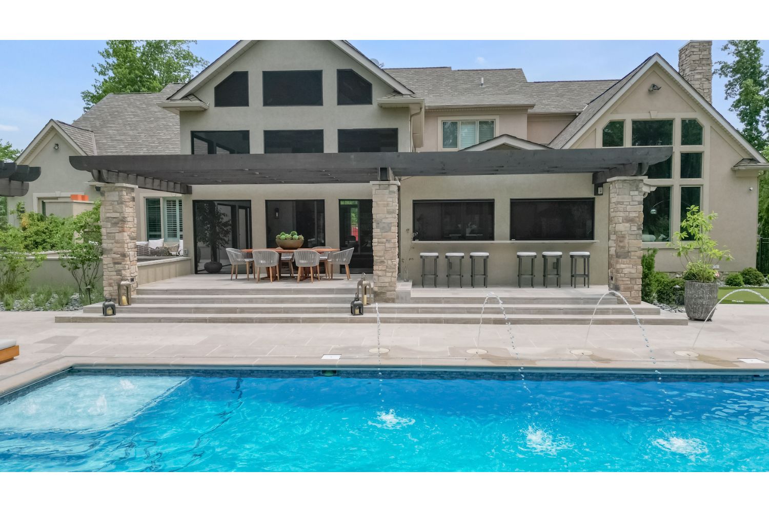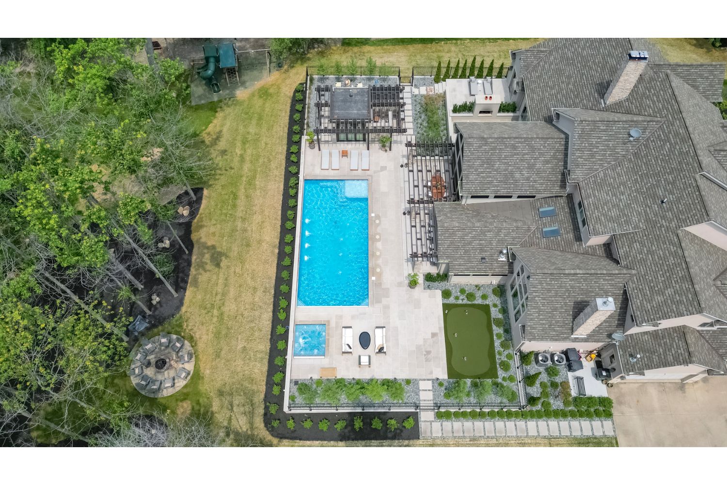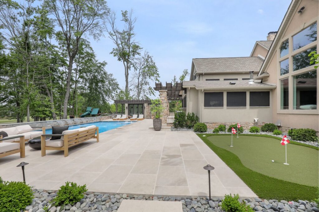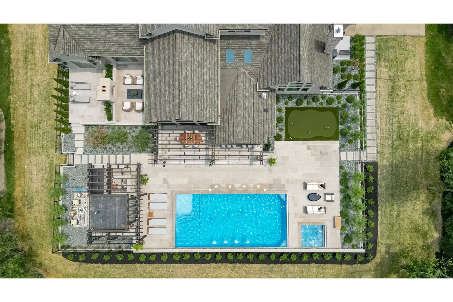 Exterior project with outdoor kitchen, screen porch with a sunken fireplace and custom-made benches, multi-level patios, putting green, pool with waterfalls and fountains, hot tub, pool house with full bath, bar, and outside shower.