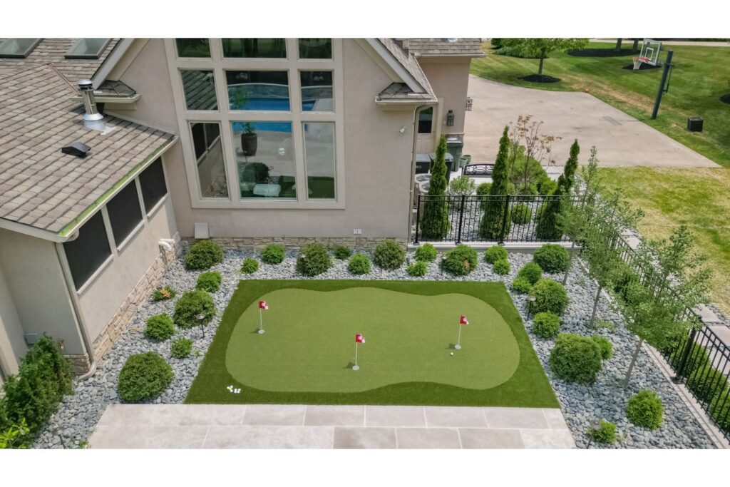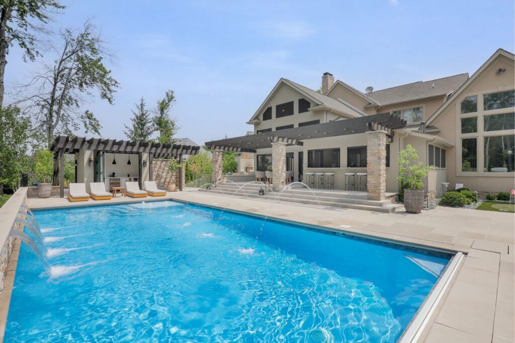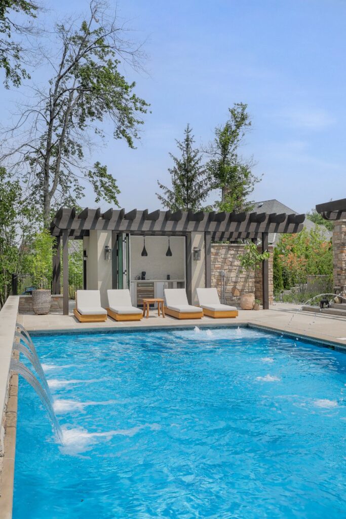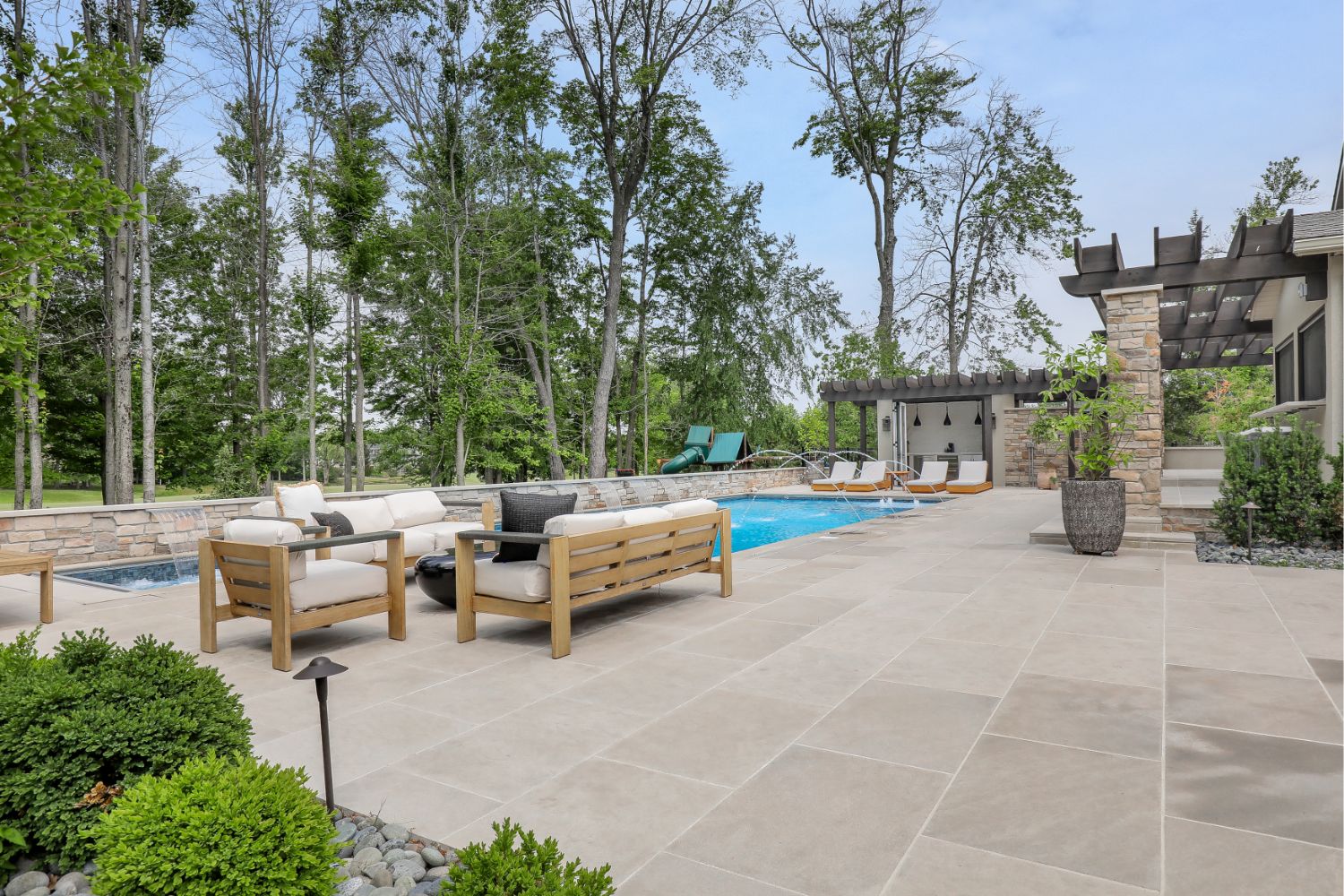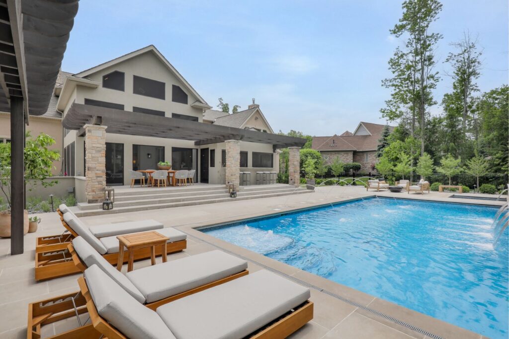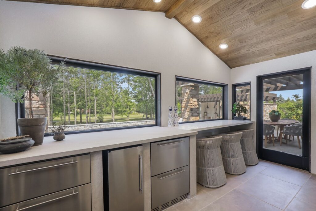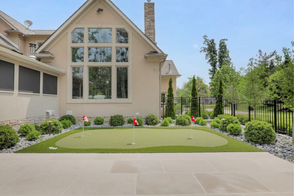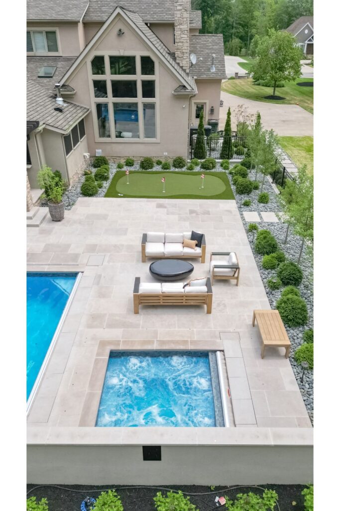 Exterior project with outdoor kitchen, screen porch with a sunken fireplace and custom-made benches, multi-level patios, putting green, pool with waterfalls and fountains, hot tub, pool house with full bath, bar, and outside shower.