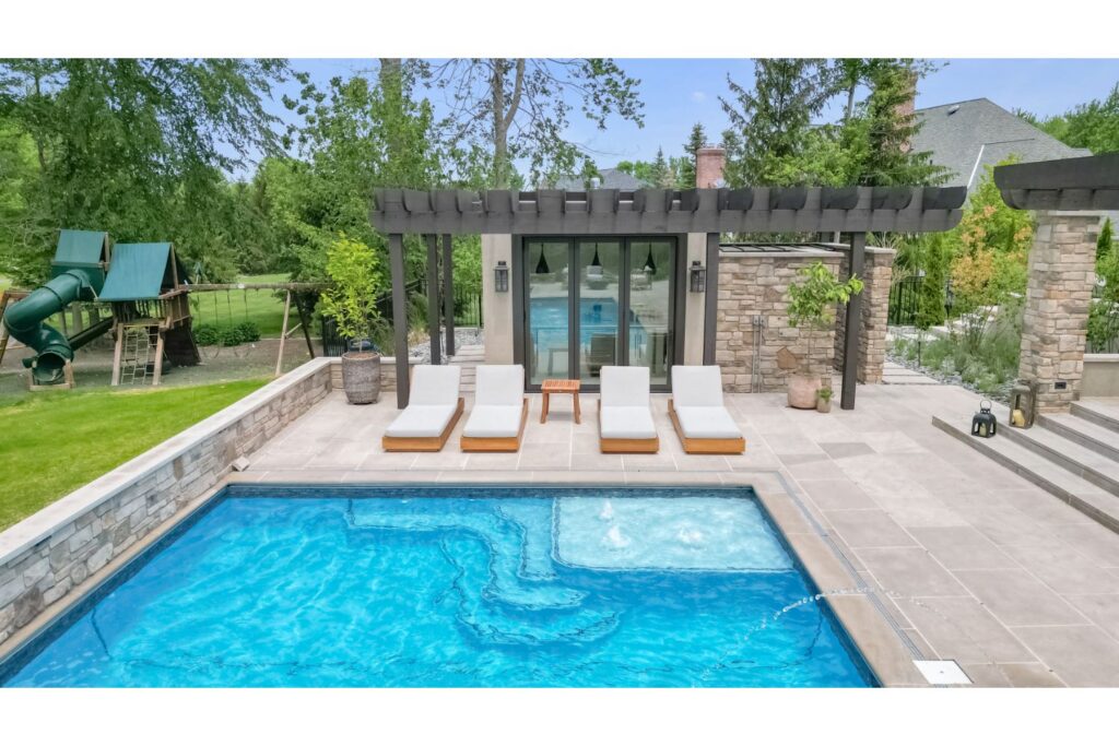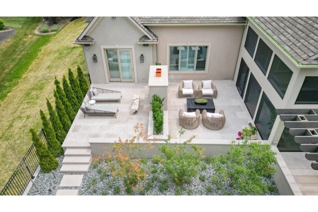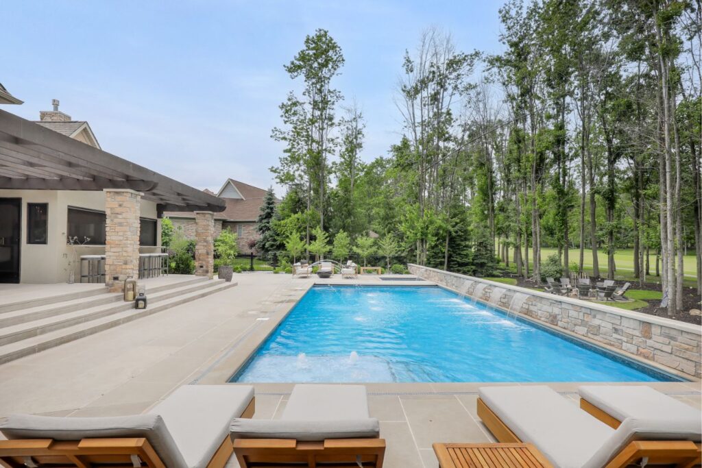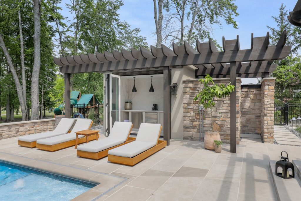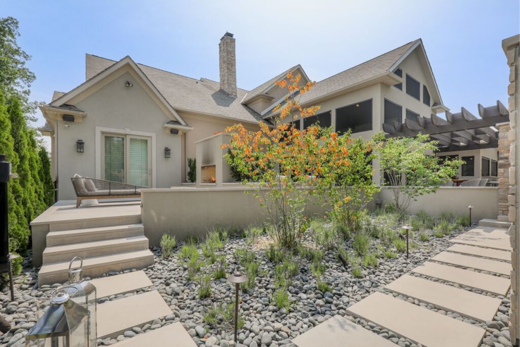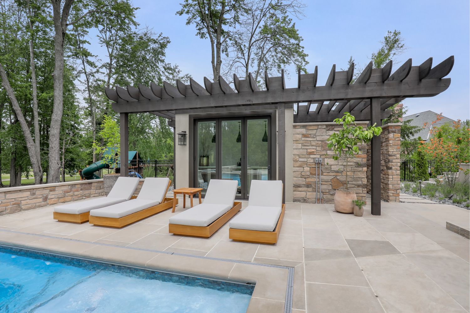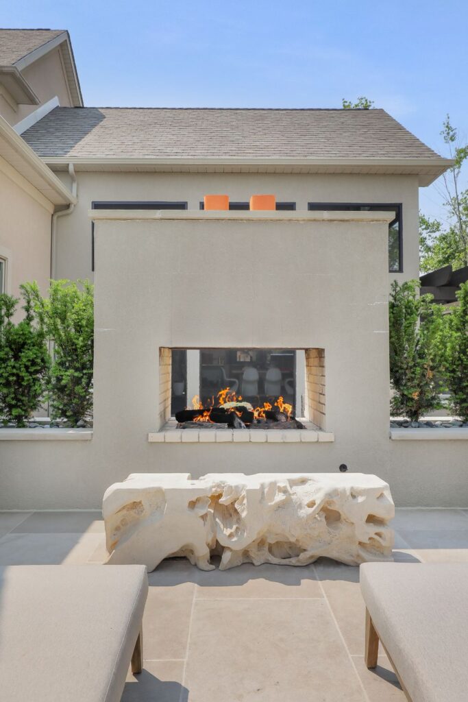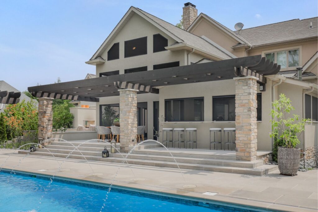 Exterior project with outdoor kitchen, screen porch with a sunken fireplace and custom-made benches, multi-level patios, putting green, pool with waterfalls and fountains, hot tub, pool house with full bath, bar, and outside shower.