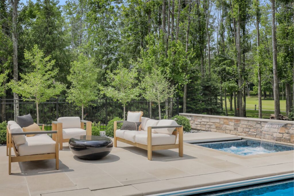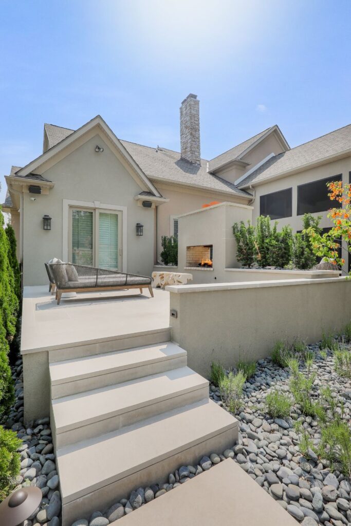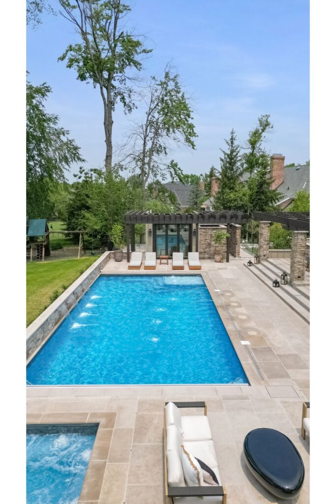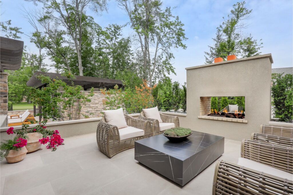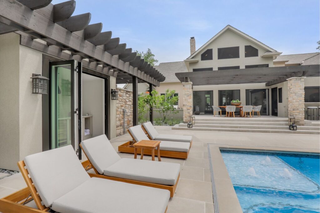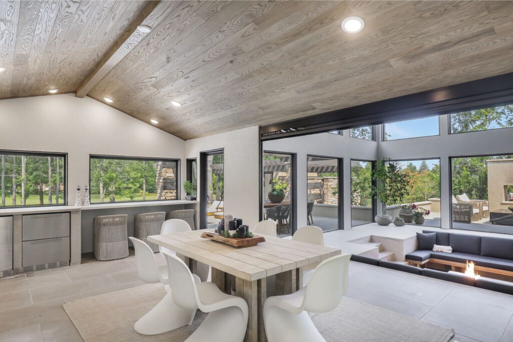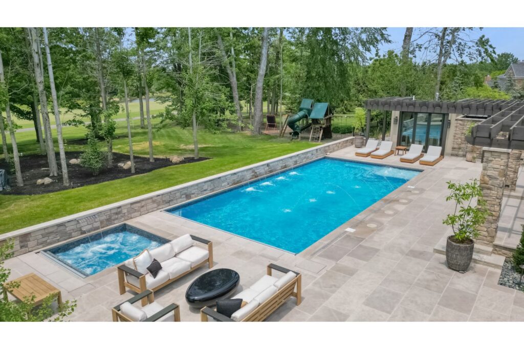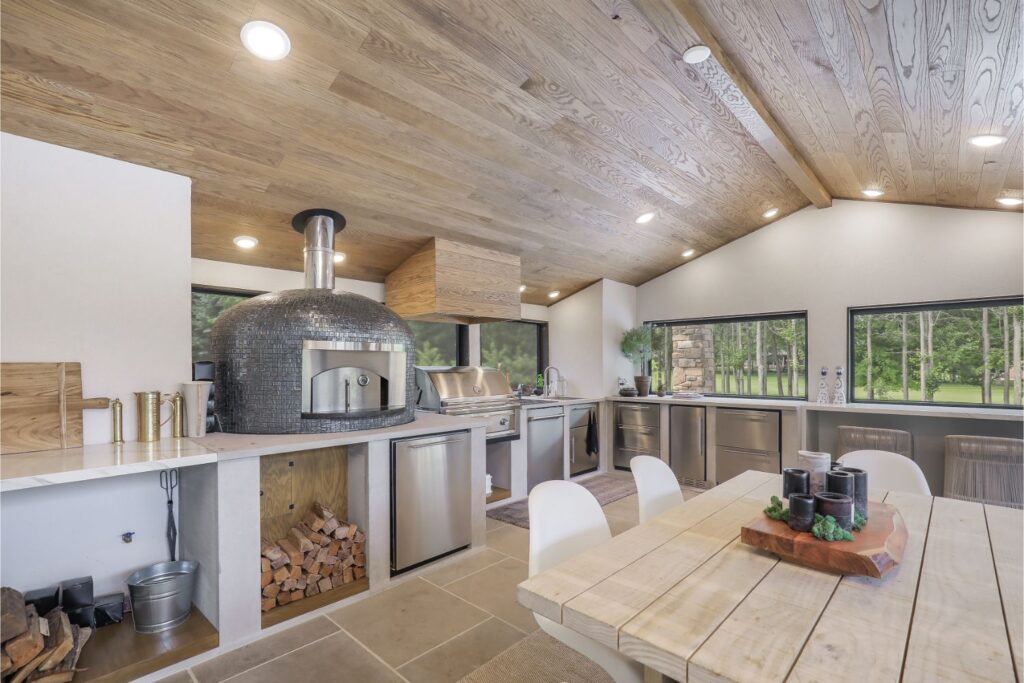 Exterior project with outdoor kitchen, screen porch with a sunken fireplace and custom-made benches, multi-level patios, putting green, pool with waterfalls and fountains, hot tub, pool house with full bath, bar, and outside shower.