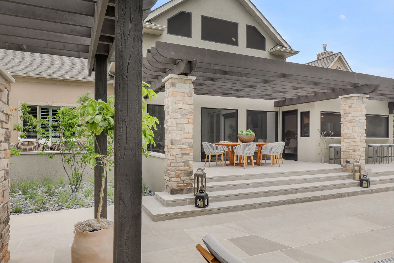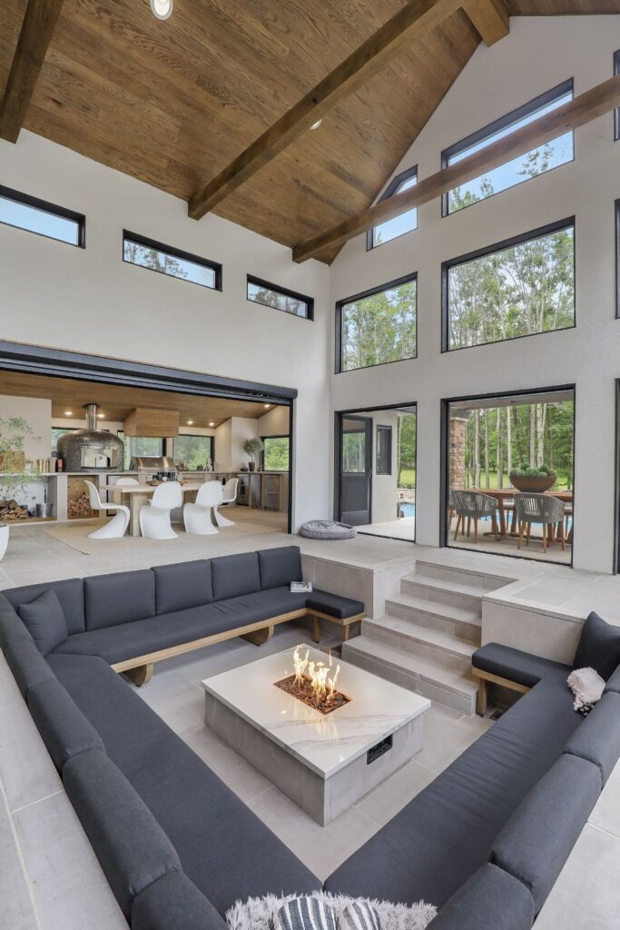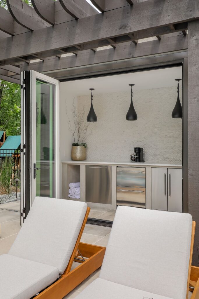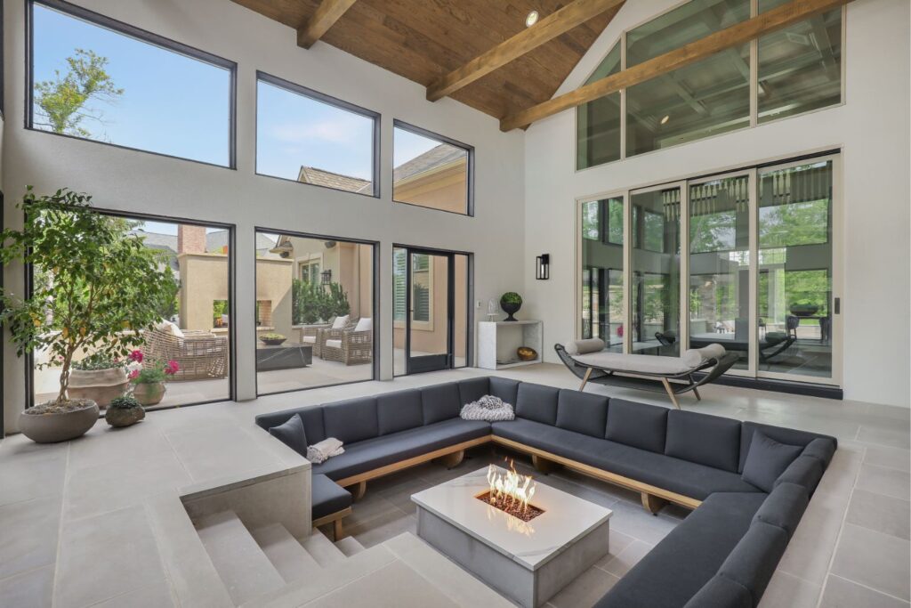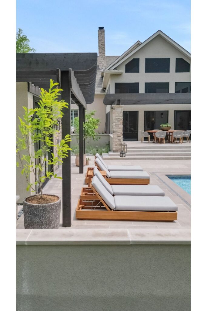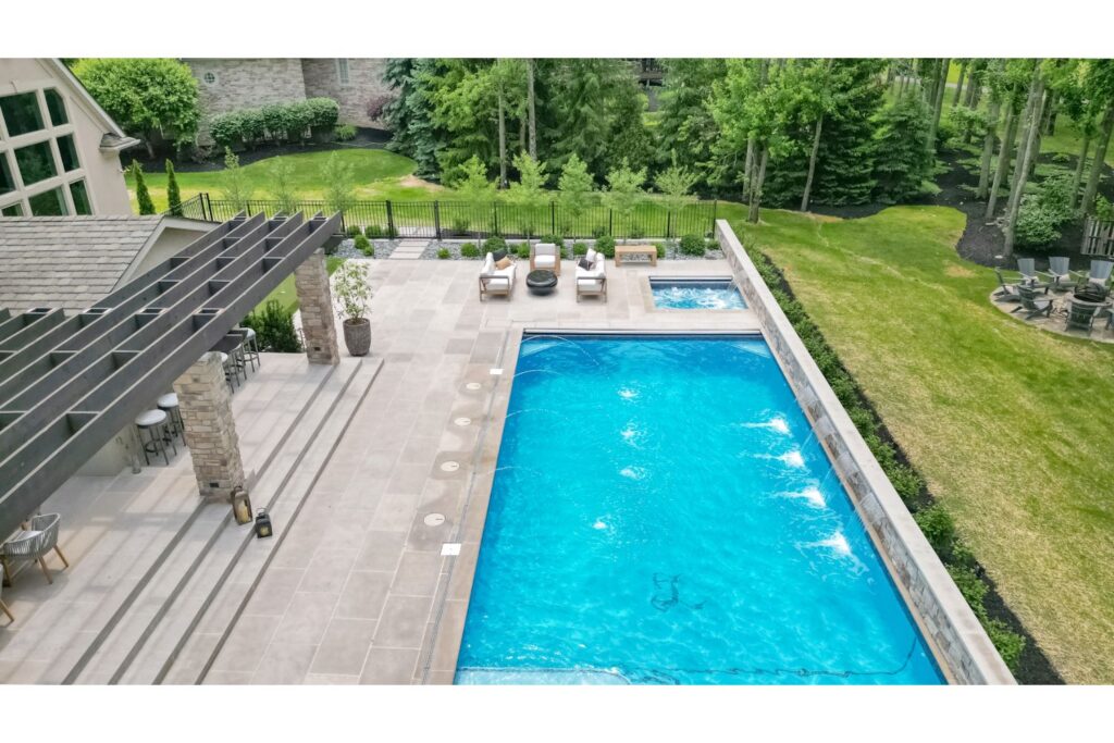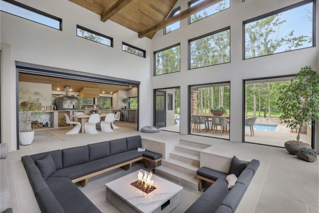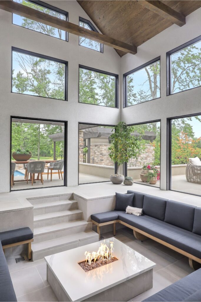 Exterior project with outdoor kitchen, screen porch with a sunken fireplace and custom-made benches, multi-level patios, putting green, pool with waterfalls and fountains, hot tub, pool house with full bath, bar, and outside shower.