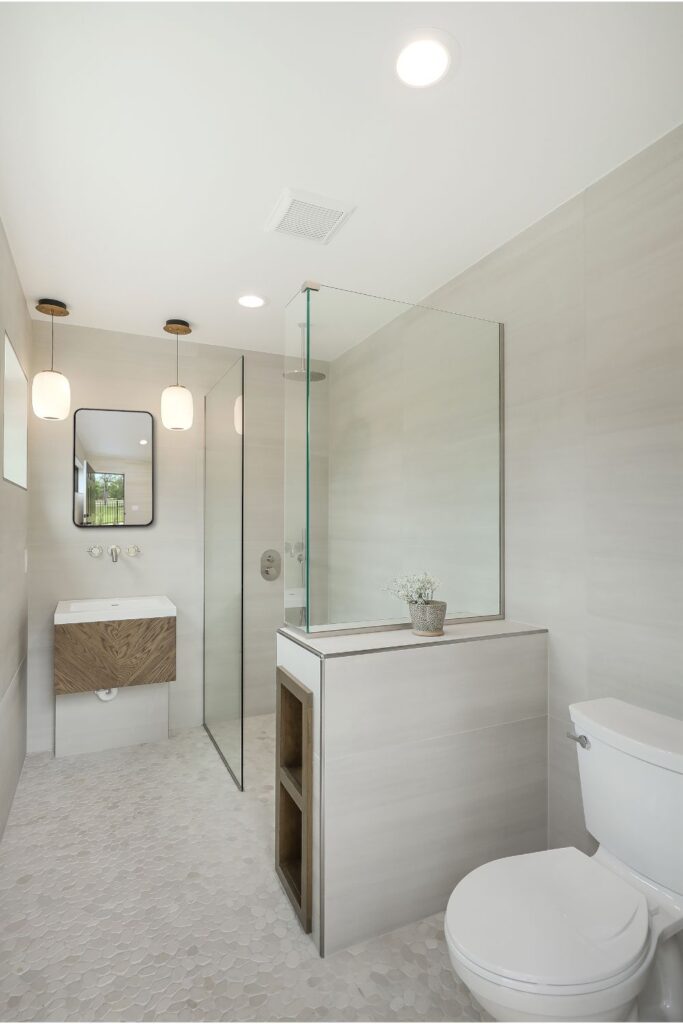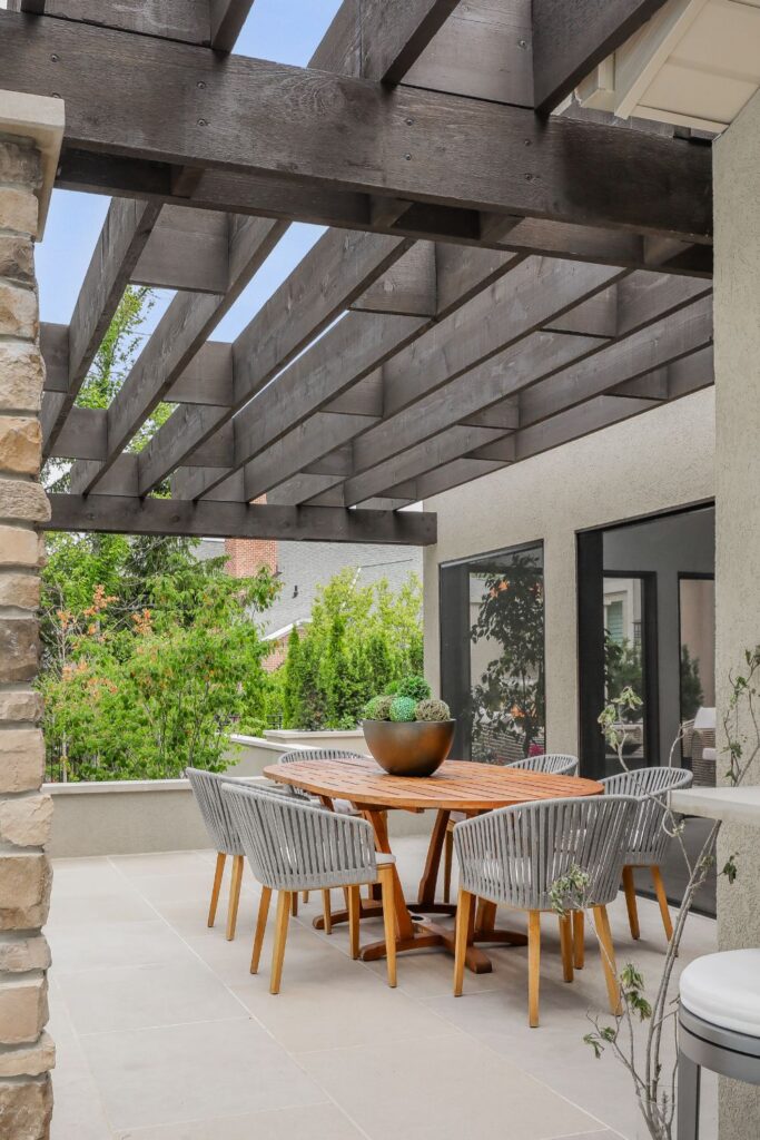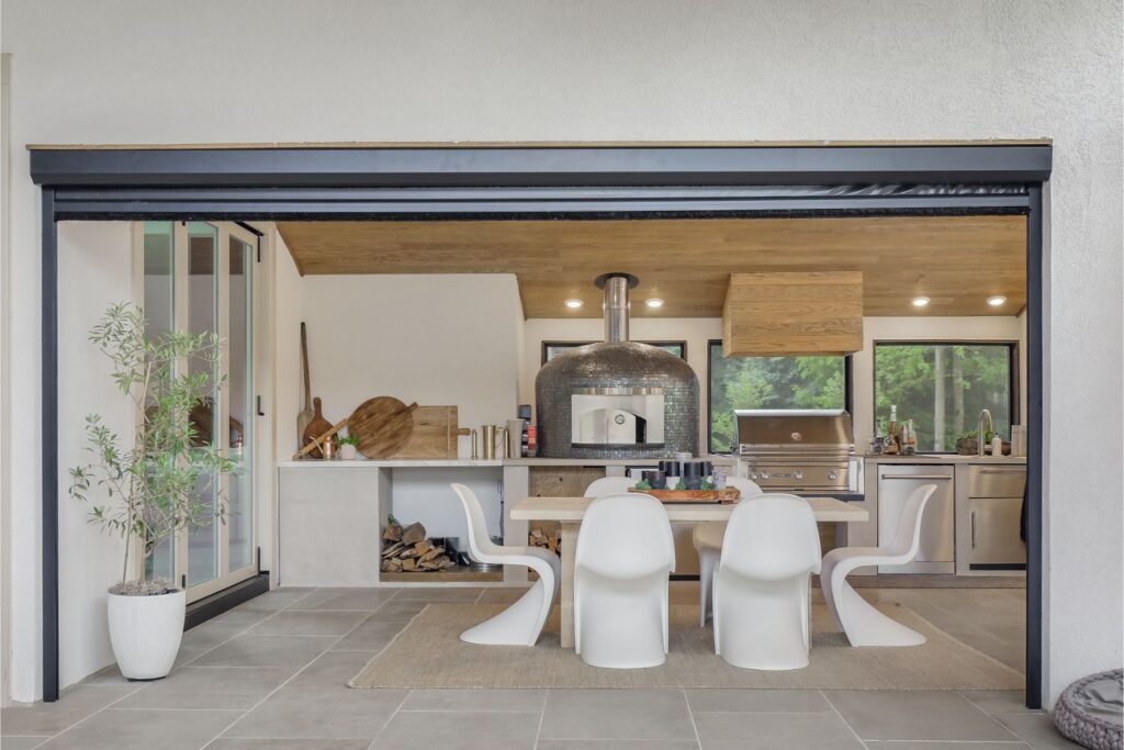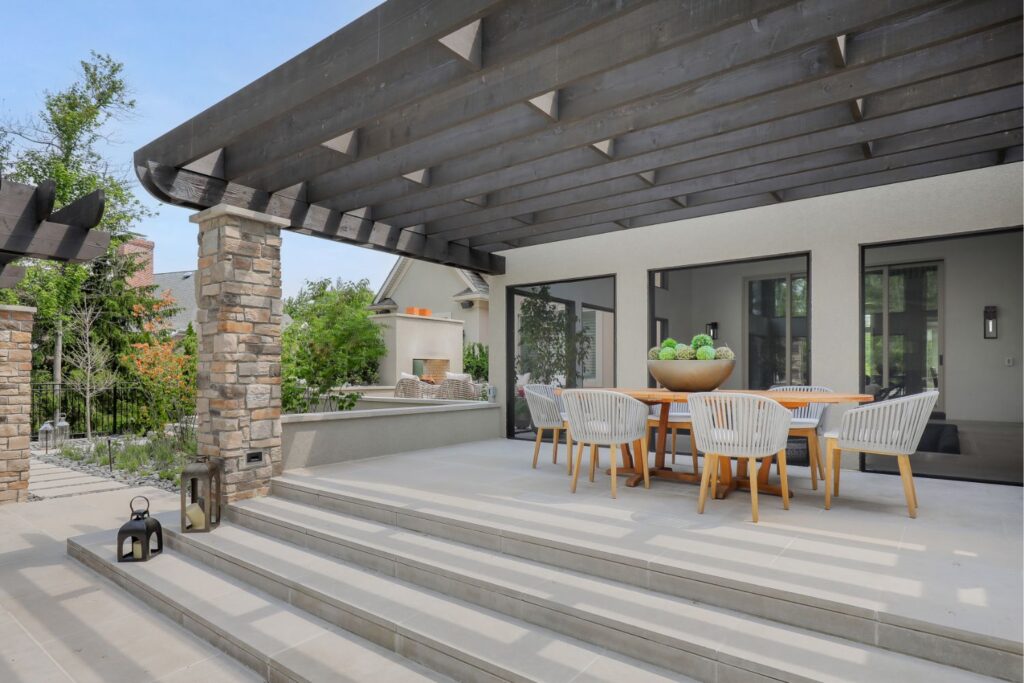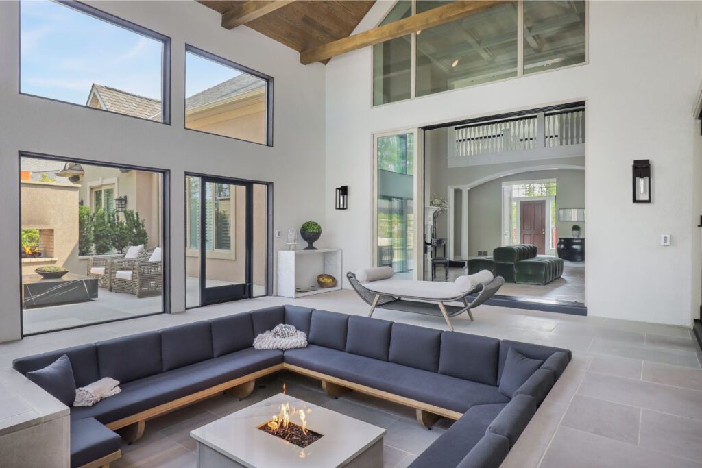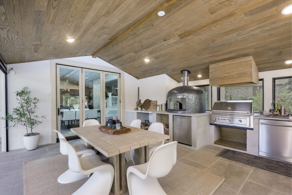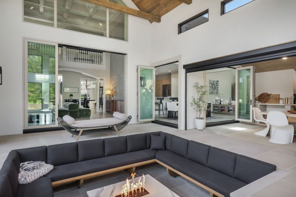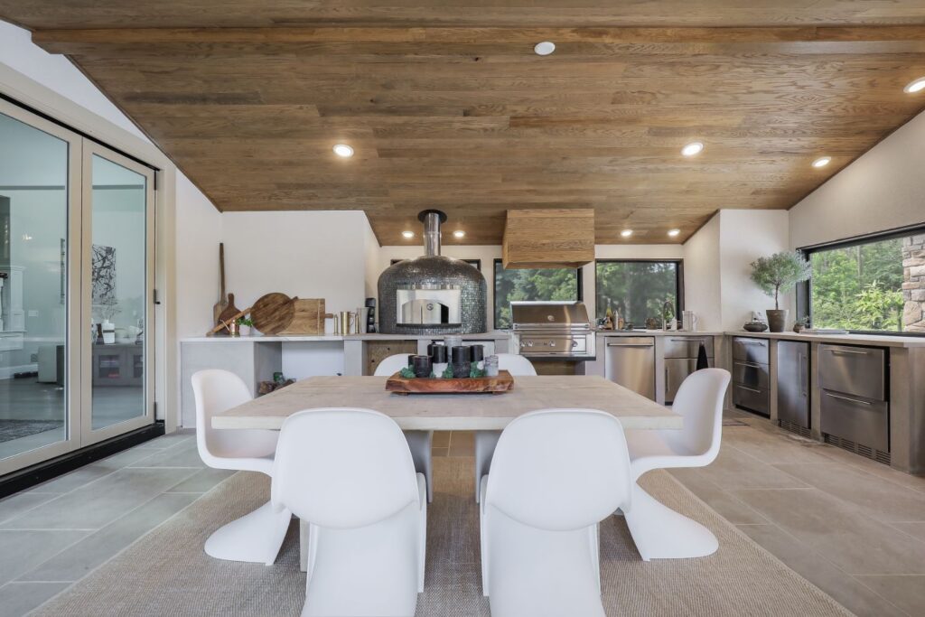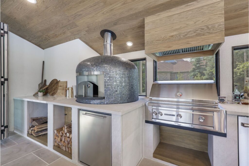 Exterior project with outdoor kitchen, screen porch with a sunken fireplace and custom-made benches, multi-level patios, putting green, pool with waterfalls and fountains, hot tub, pool house with full bath, bar, and outside shower.