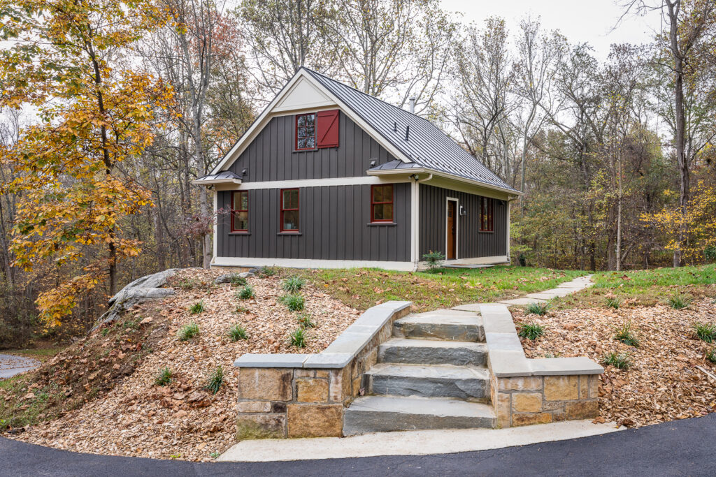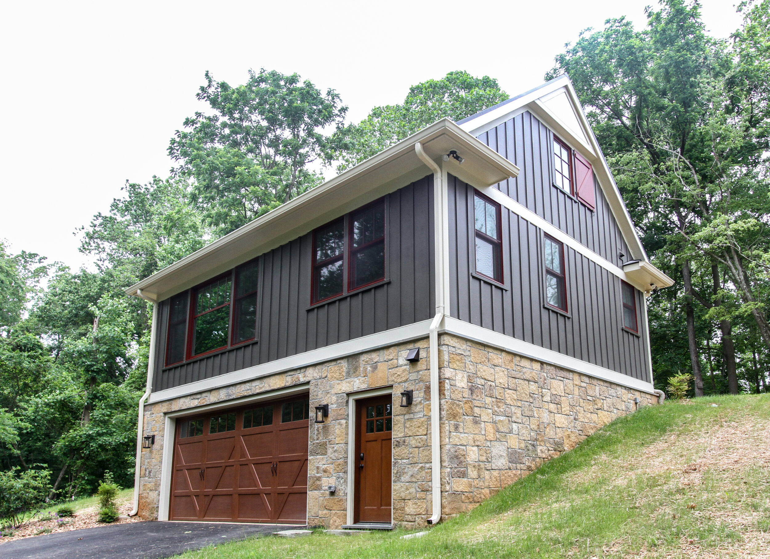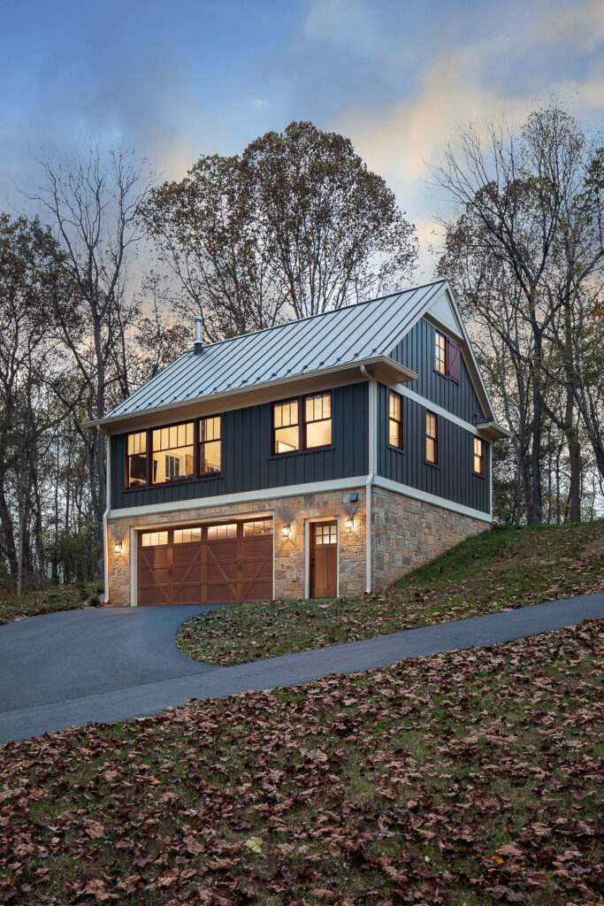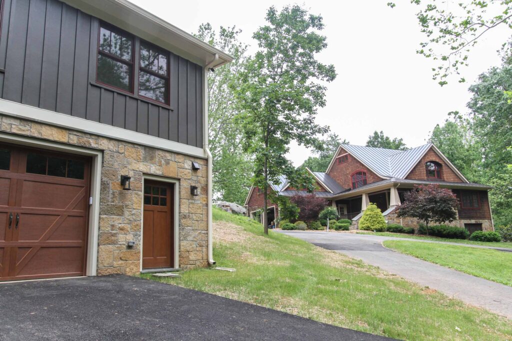 This beautifully designed carriage house in Middleburg, Virginia combines rustic charm with modern functionality, making it an inviting retreat and a versatile guest house. The exterior showcases a timeless combination of board-and-batten siding with natural stone accents, creating a structure that blends seamlessly with its surroundings. Rich wood tones on the garage doors and trim add warmth and depth, while the pitched roof and decorative gable details lend a classic, architectural elegance.