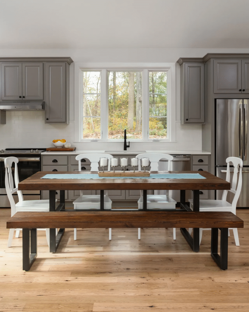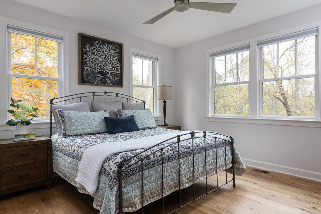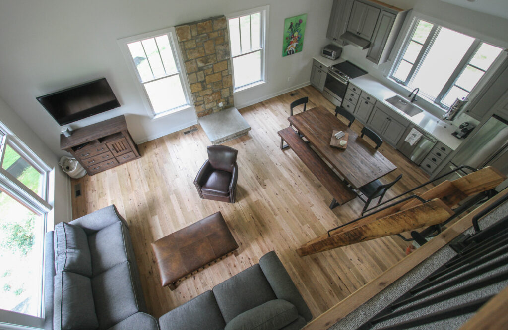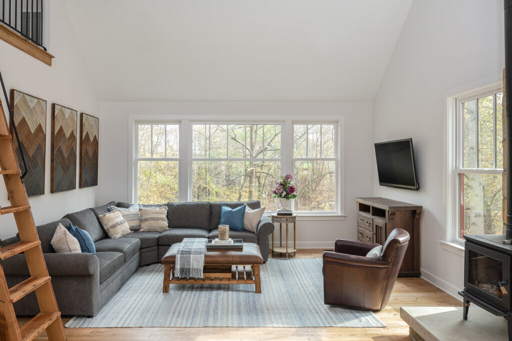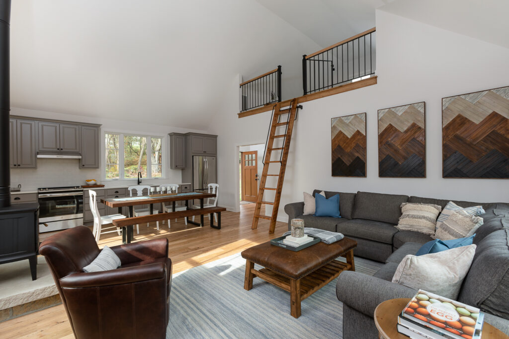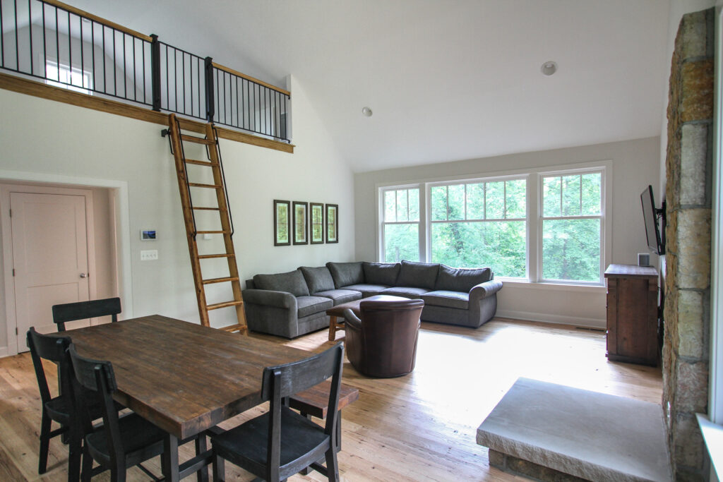Inside, the carriage house features an open-concept design with a soaring vaulted ceiling in the living space, creating a bright and airy atmosphere. The great room boasts large windows that frame serene views of the outdoors, while a stone fireplace anchors the space and provides a cozy focal point. The adjacent kitchen is thoughtfully designed with shaker-style cabinetry, quartz countertops, and a rustic farmhouse dining table, seamlessly blending style and practicality.