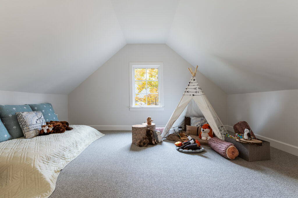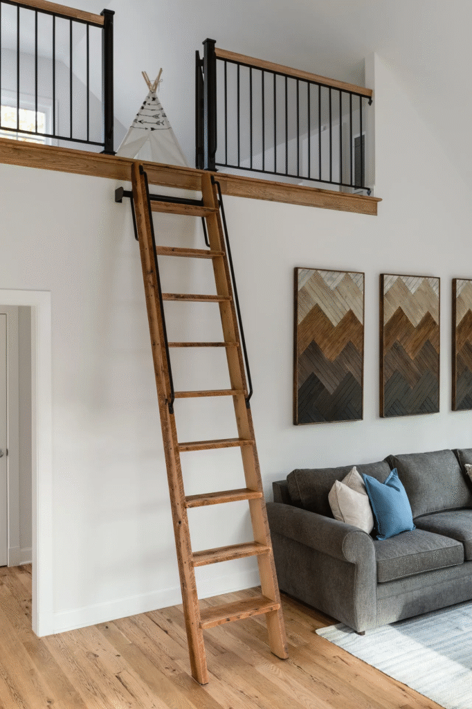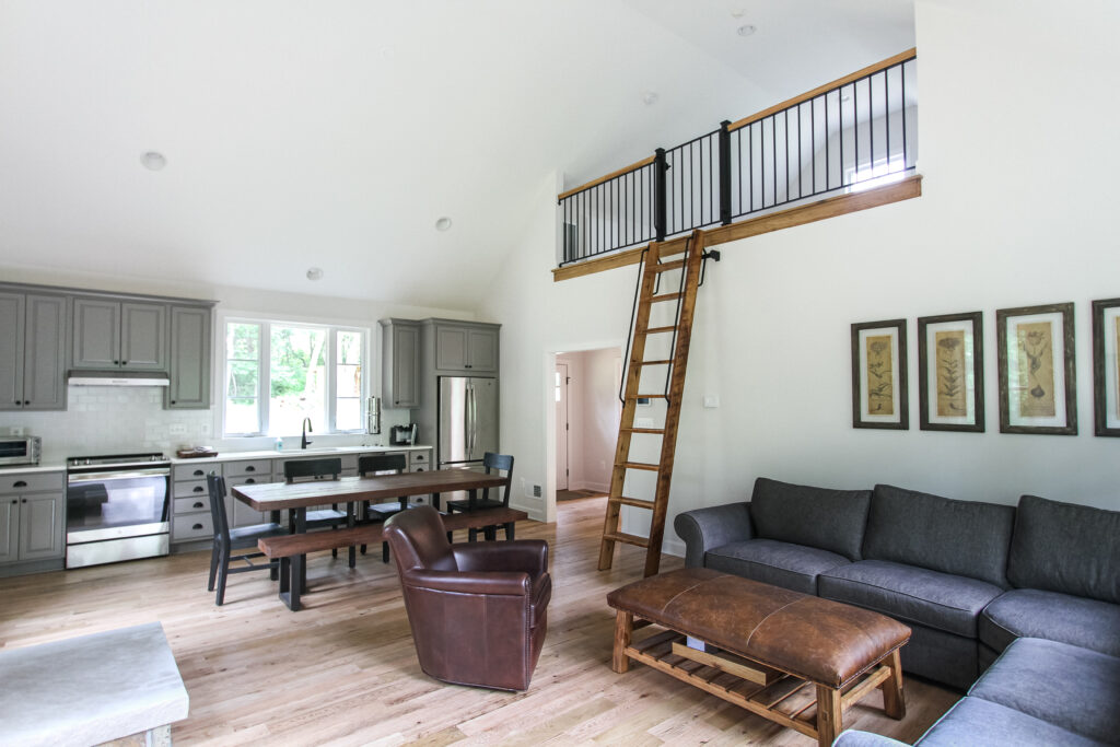 The loft area offers flexible living quarters, perfect for guests or as a private retreat, with ample natural light and clean, modern finishes. The space is accented with exposed wood beams and rustic barn-style railings, enhancing the farmhouse-inspired aesthetic. With energy-efficient systems and careful attention to detail throughout, this carriage house is both charming and sustainable, offering comfort, beauty, and functionality in equal measure.