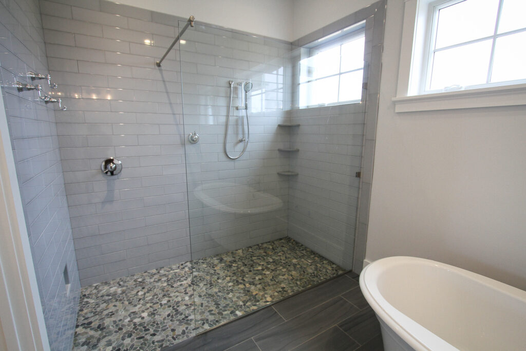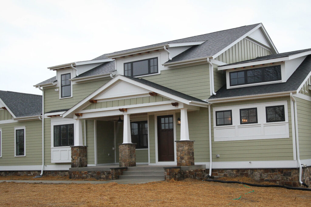 This custom-designed modern craftsman home sits on a picturesque lake in Purcellville, Virginia, offering serene views and a perfect blend of modern craftsmanship and timeless charm. The front elevation features an inviting front porch with tapered white columns, stone base pillars, and a double gable roofline that adds architectural interest. Energy-efficient green siding paired with crisp white trim and dark accent windows creates a warm yet contemporary exterior palette.