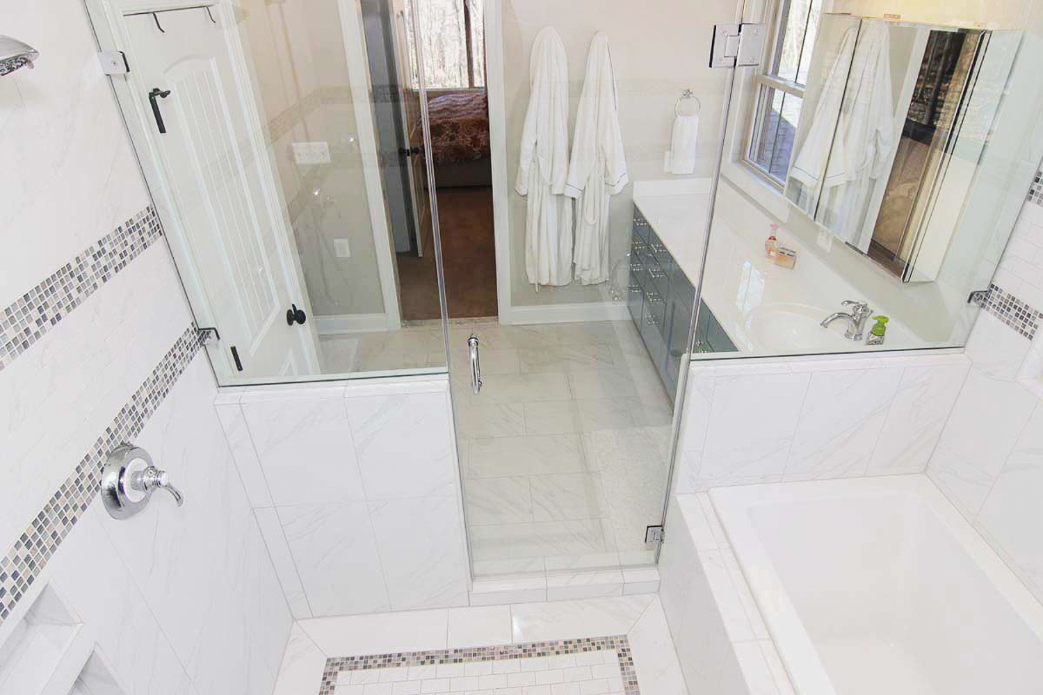Luxury wet room with freestanding tub and walk-in shower enclosed by glass steam room walls