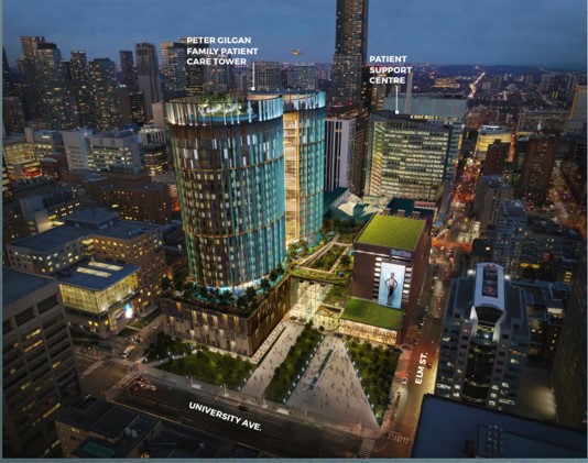 A total redevelopment of the current campus will include one net new building, The Patient Support Centre, which will house the administrative and educational/training functions (that is almost ready to be topped off!), and a significant expansion to The Peter Gilgan Family Patient Care Tower, where a portion of the hospital currently resides which houses clinical functions, learning, and research.