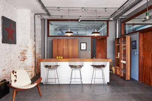 An industrial kitchen needs a rustic element to help complete the look and also warm up the space. An island surround fitted with reclaimed wood can be a great finishing touch or a few wooden bar stools can help create a balance against the concrete and metal finishes.