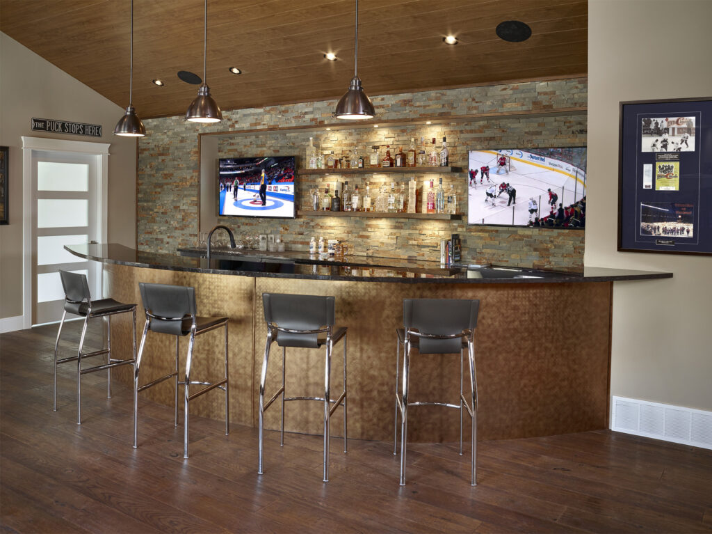  A Man Cave with an NHL themed sports bar overlooking the homeowner’s impressive car collection in the garage below.