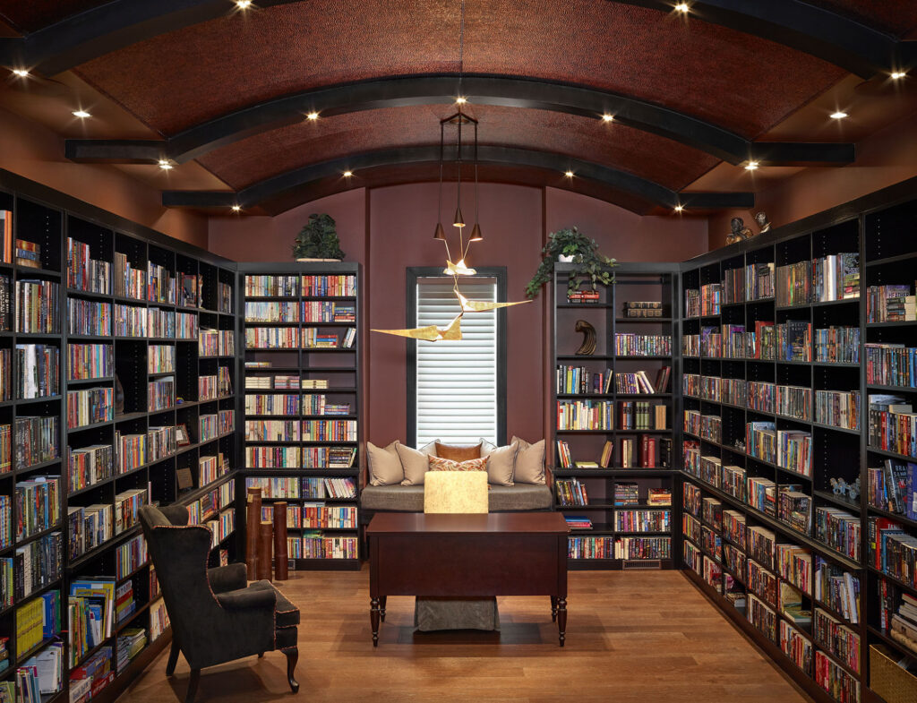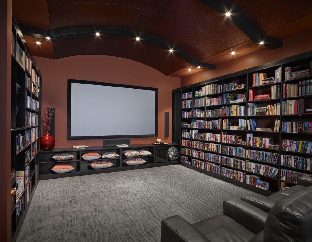  A dual-purpose theatre room and library that holds 10,000 books with beautiful custom wood work on the oak barn library door and custom shelving.