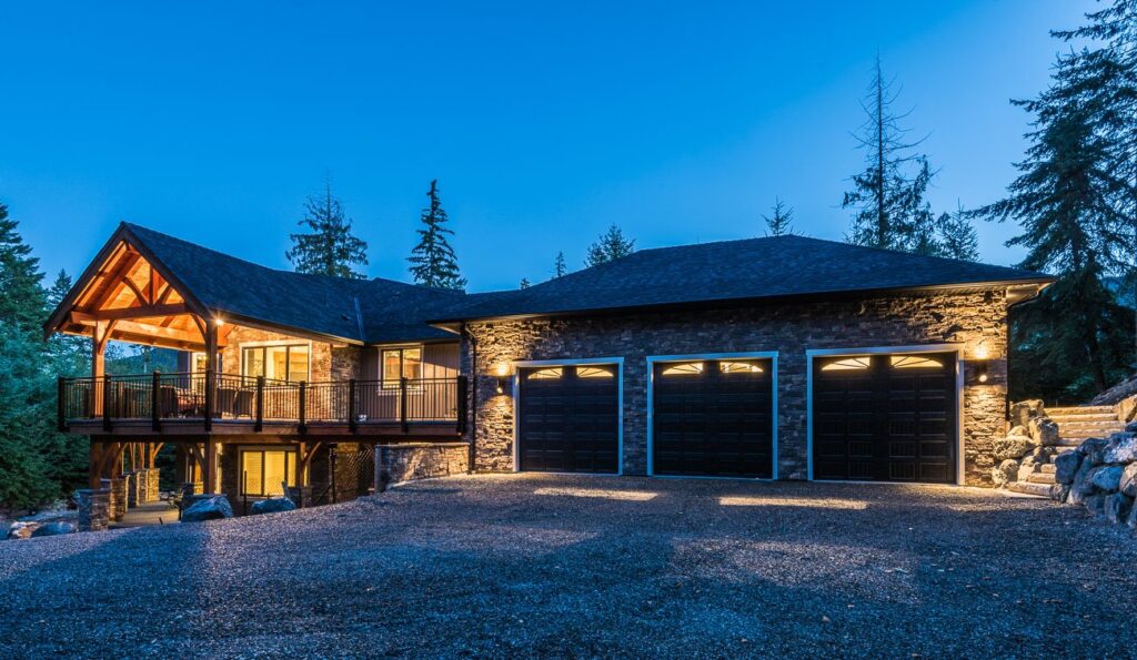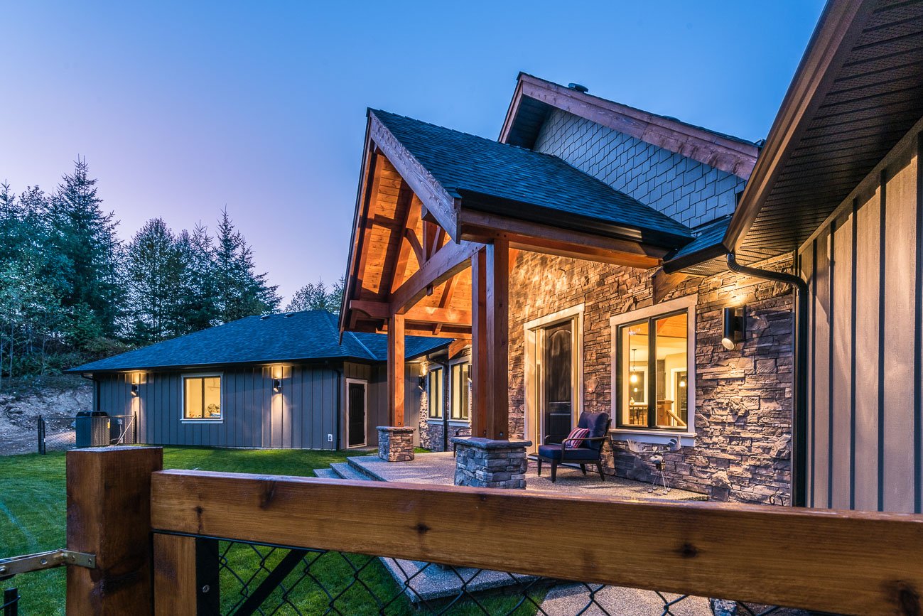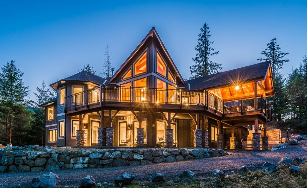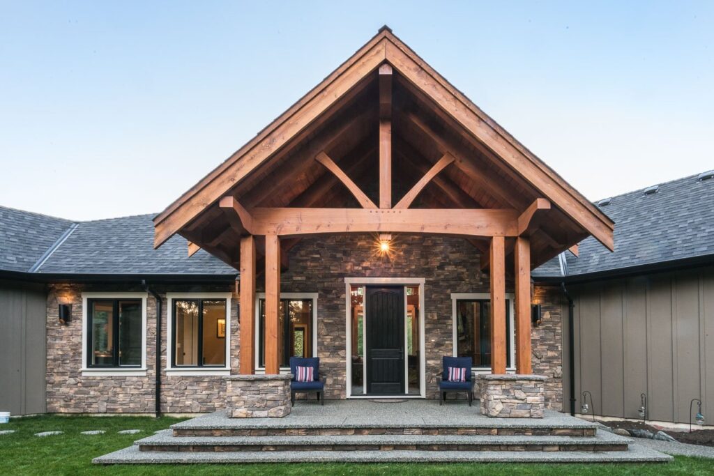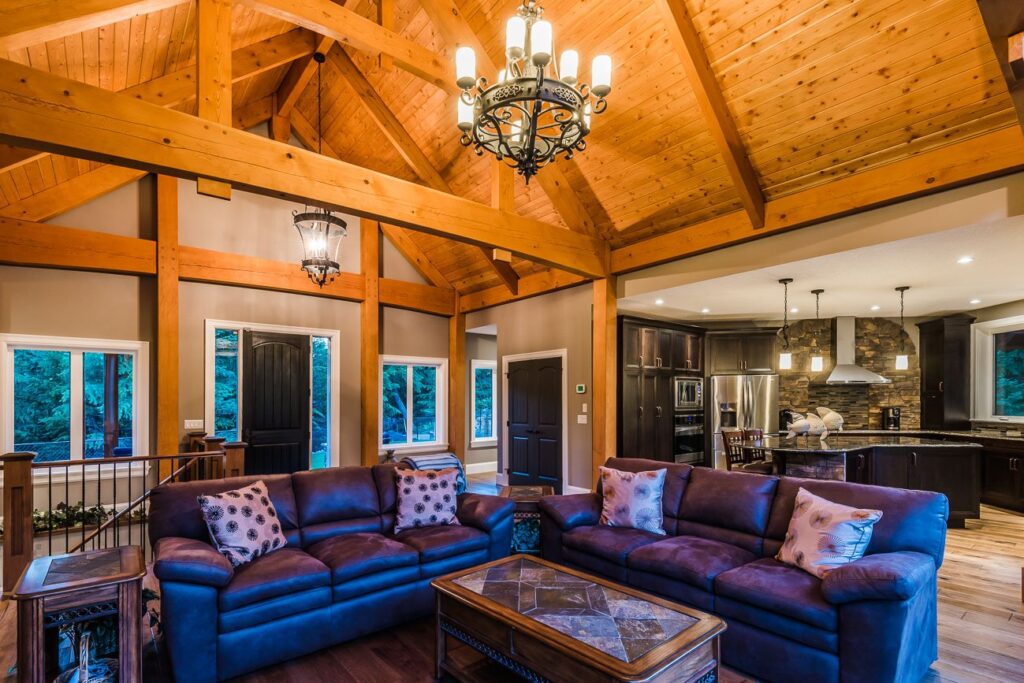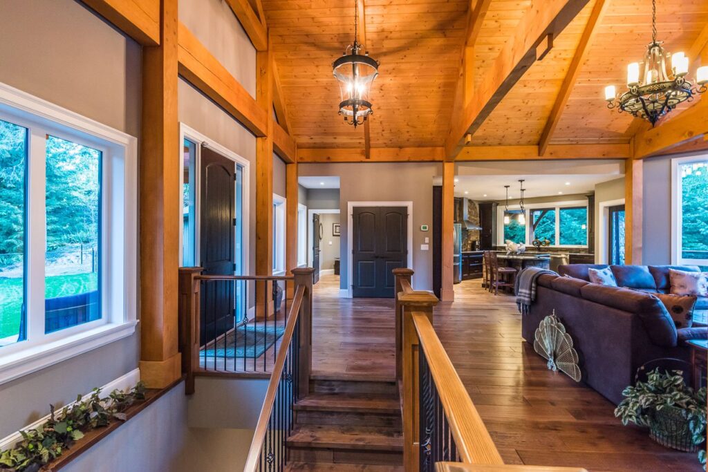 The finishes throughout the home are high end but rustic, including K2 Stone, Alder cabinetry, granite countertops, oil-rubbed bronze hardware, free-standing soaker tubs in the bathrooms, hickory hardwood flooring, timber framing inside and out, and Hardie plank siding with cedar shingles.
