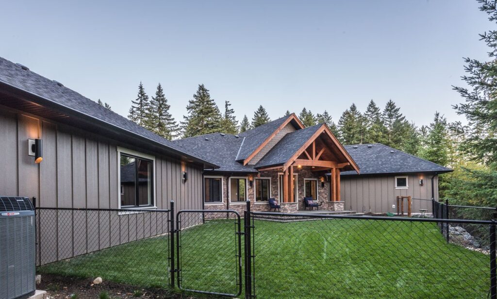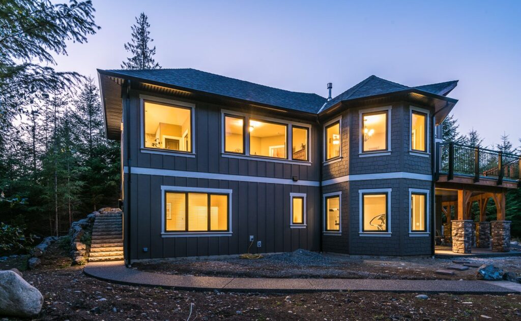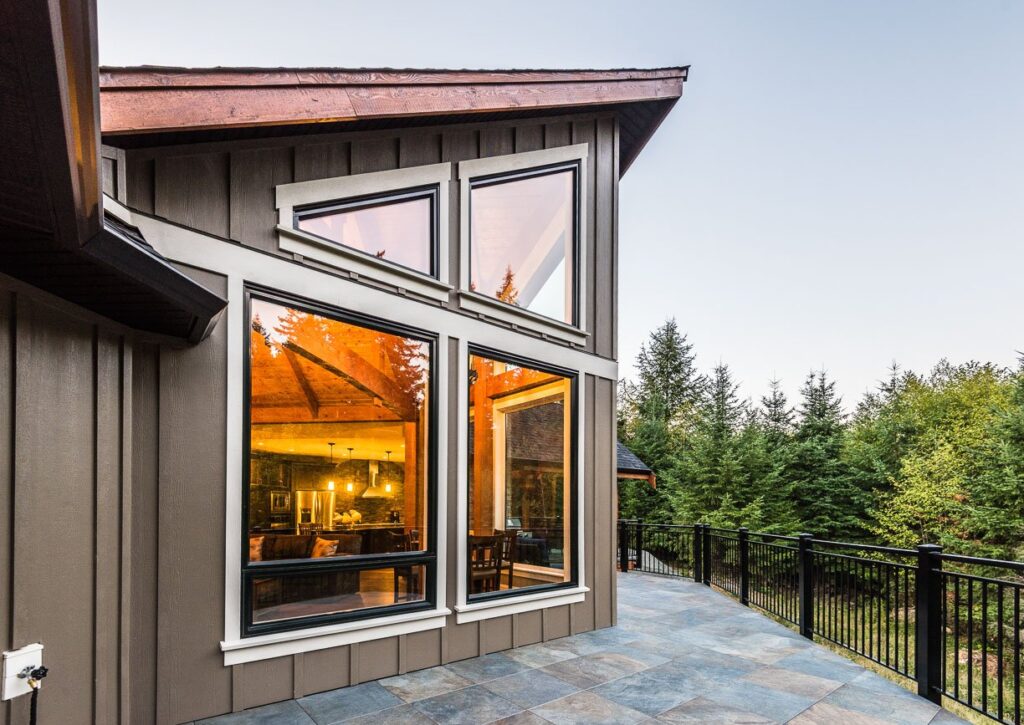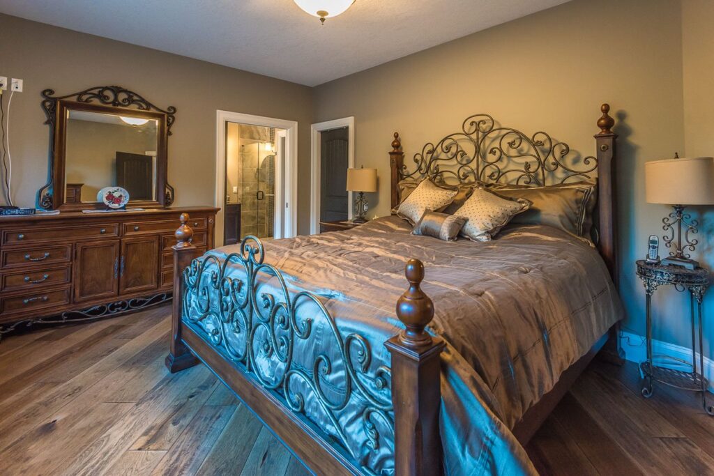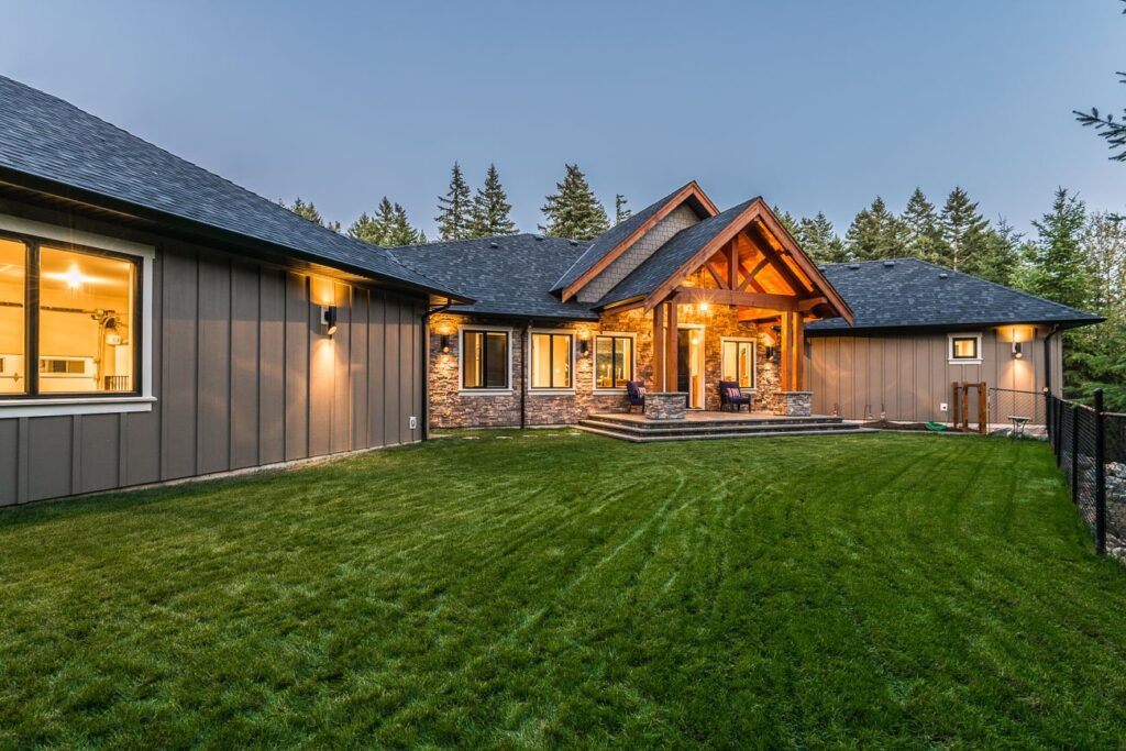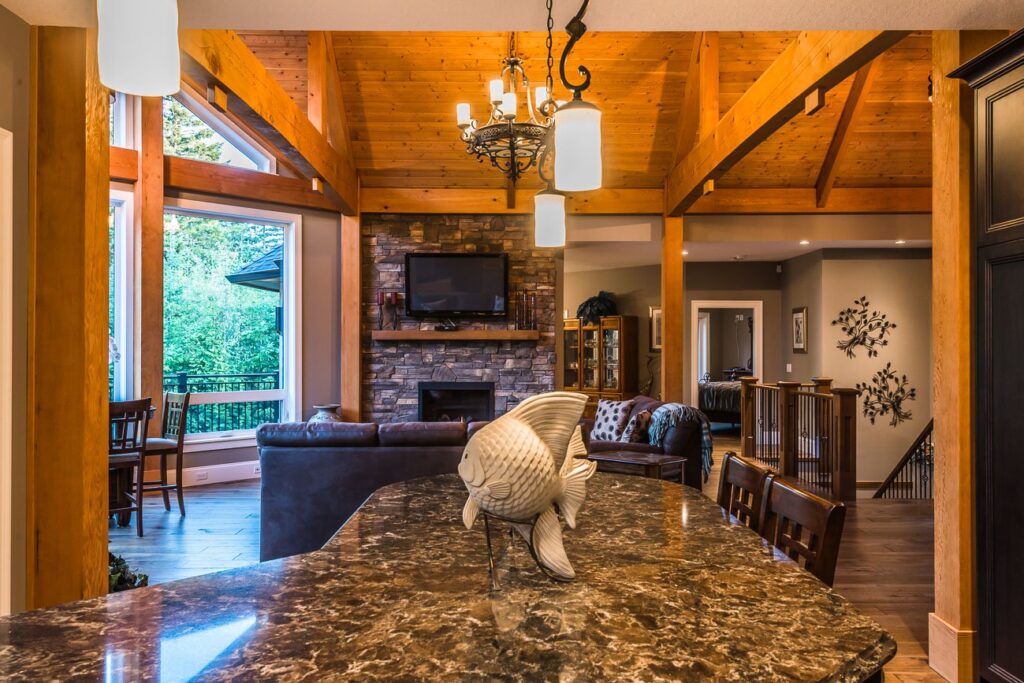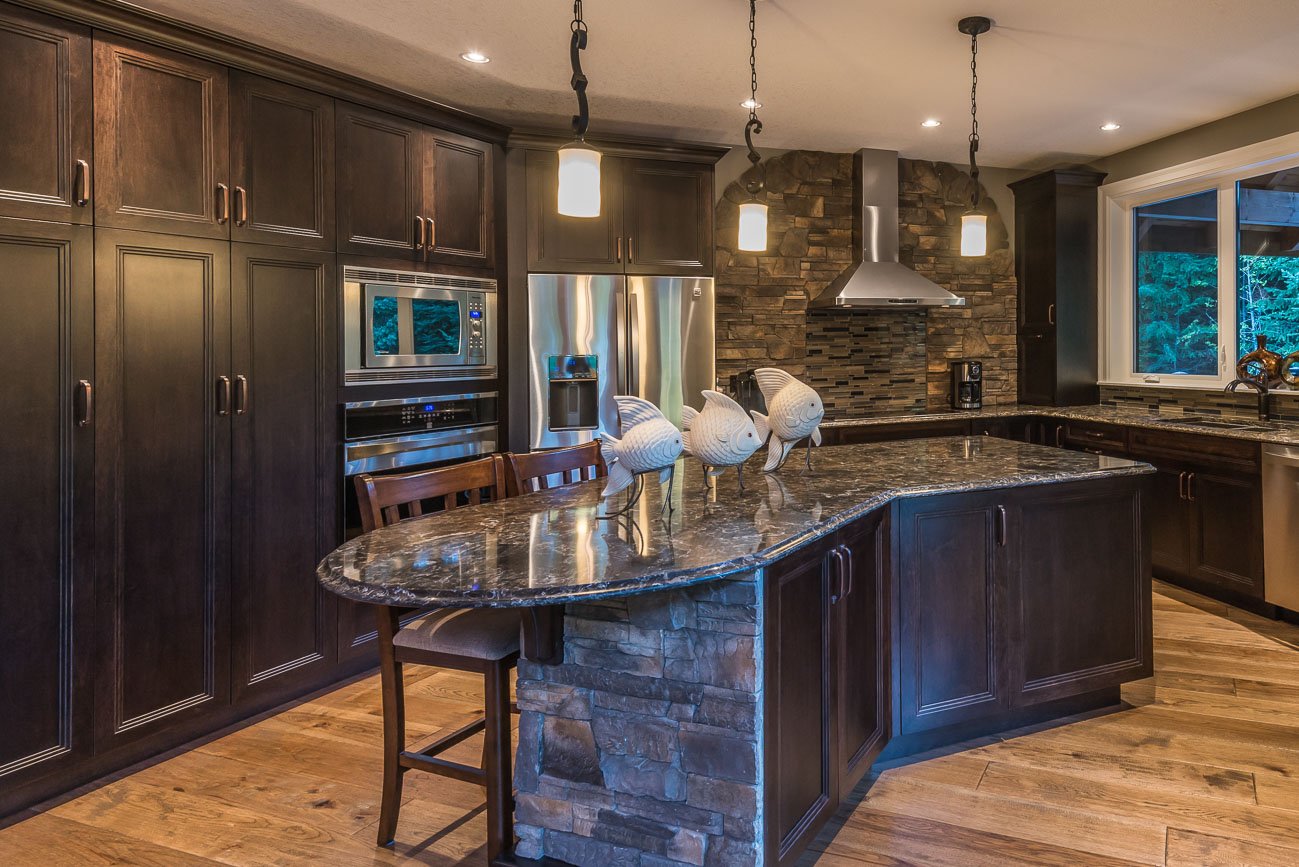 The finishes throughout the home are high end but rustic, including K2 Stone, Alder cabinetry, granite countertops, oil-rubbed bronze hardware, free-standing soaker tubs in the bathrooms, hickory hardwood flooring, timber framing inside and out, and Hardie plank siding with cedar shingles.