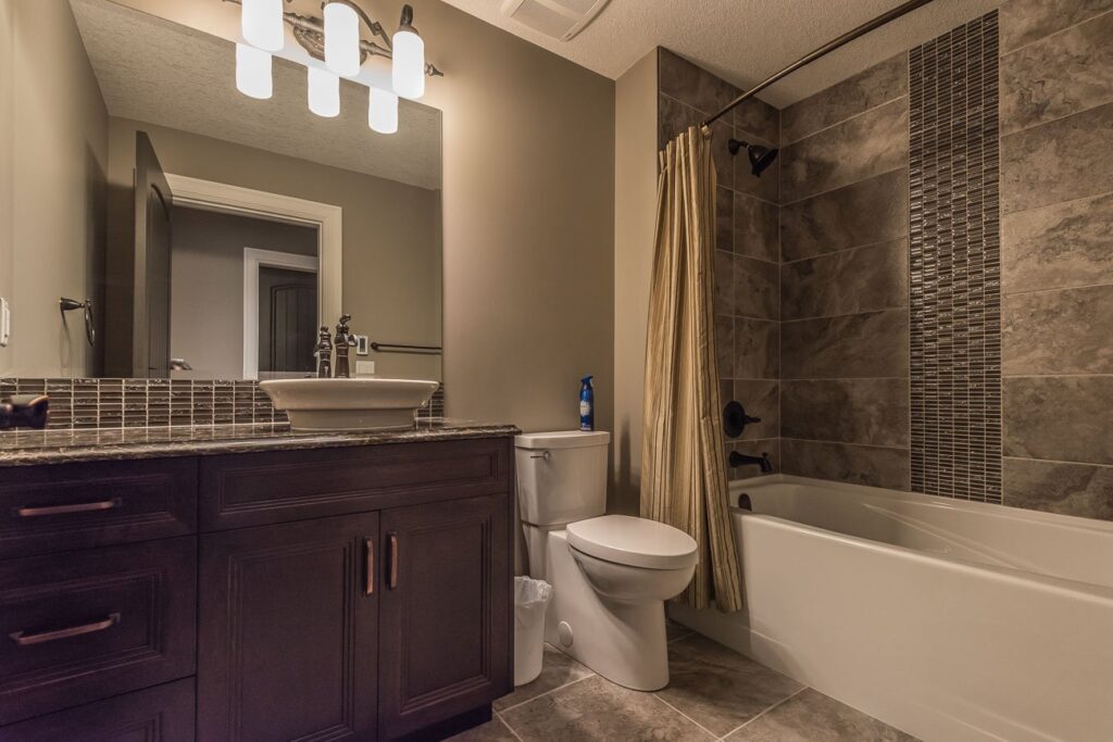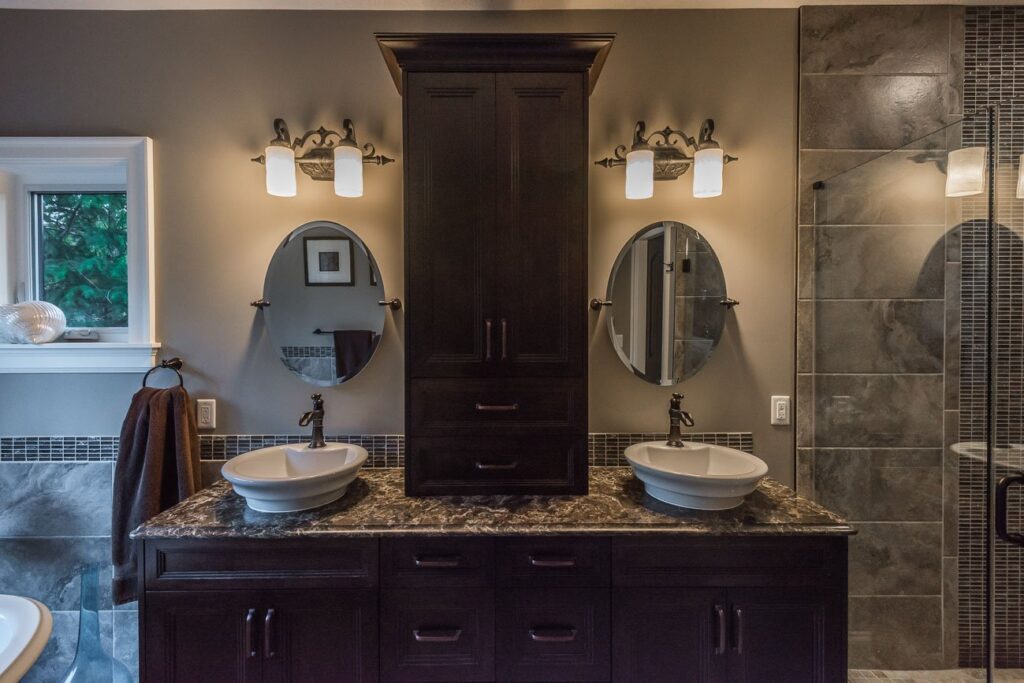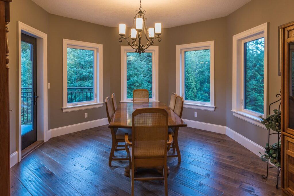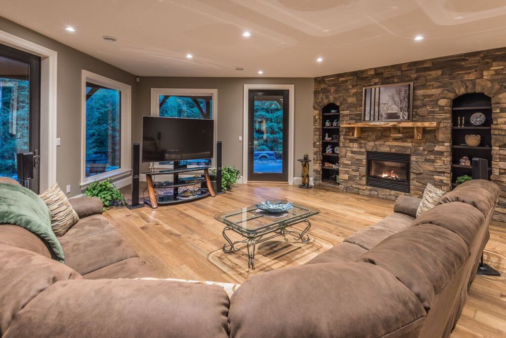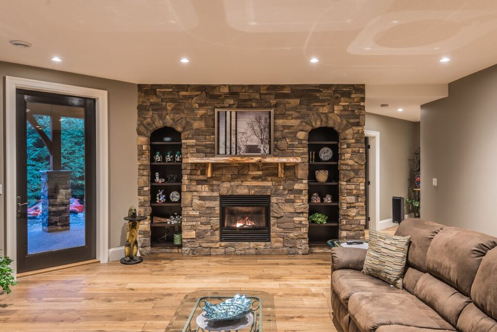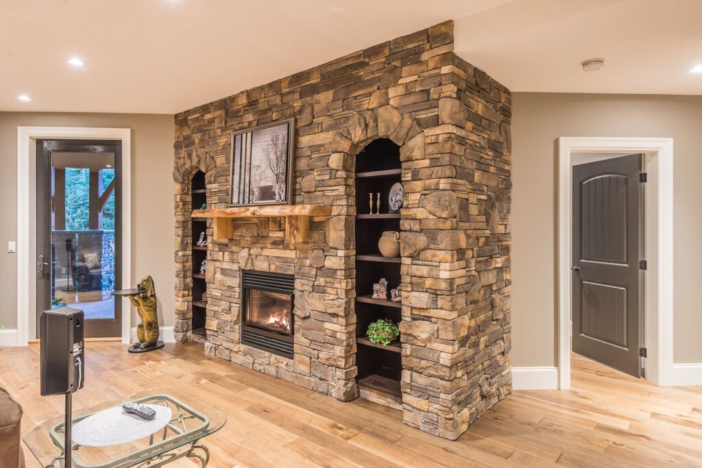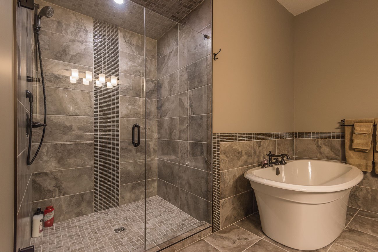 The finishes throughout the home are high end but rustic, including K2 Stone, Alder cabinetry, granite countertops, oil-rubbed bronze hardware, free-standing soaker tubs in the bathrooms, hickory hardwood flooring, timber framing inside and out, and Hardie plank siding with cedar shingles.