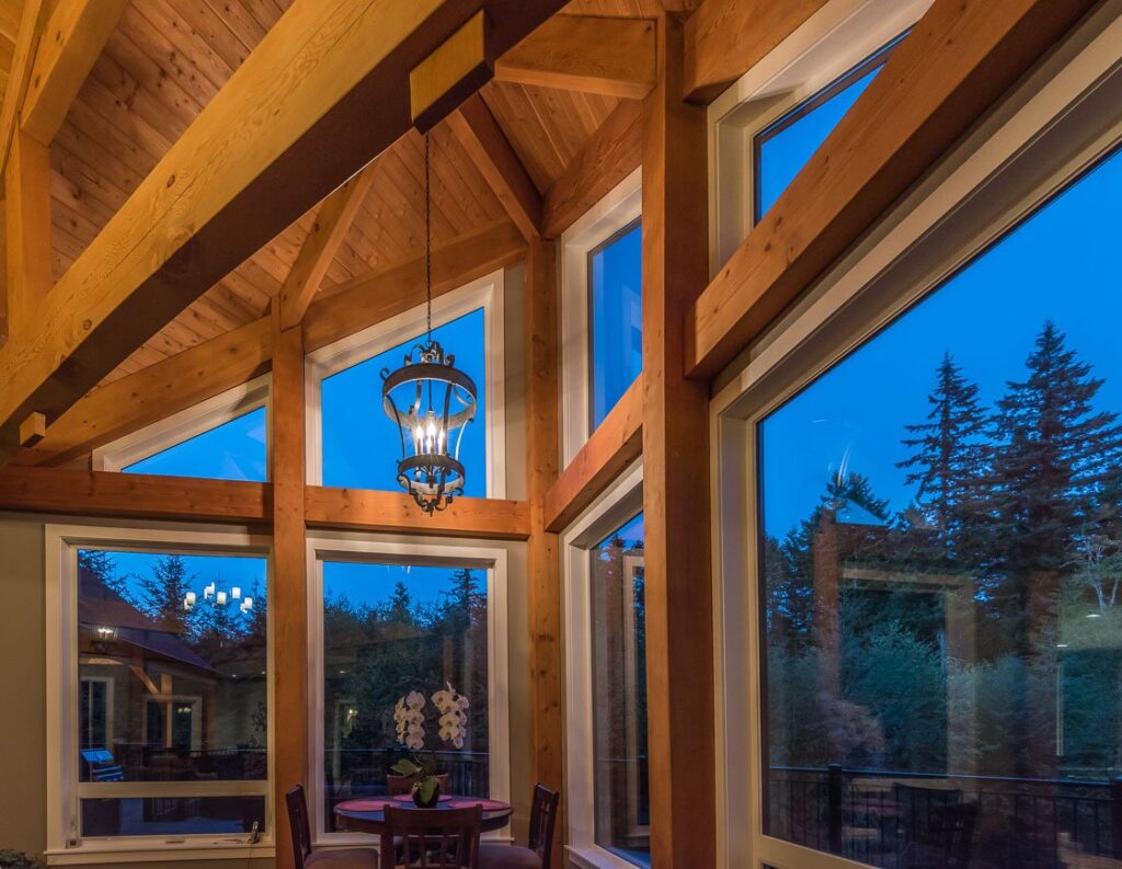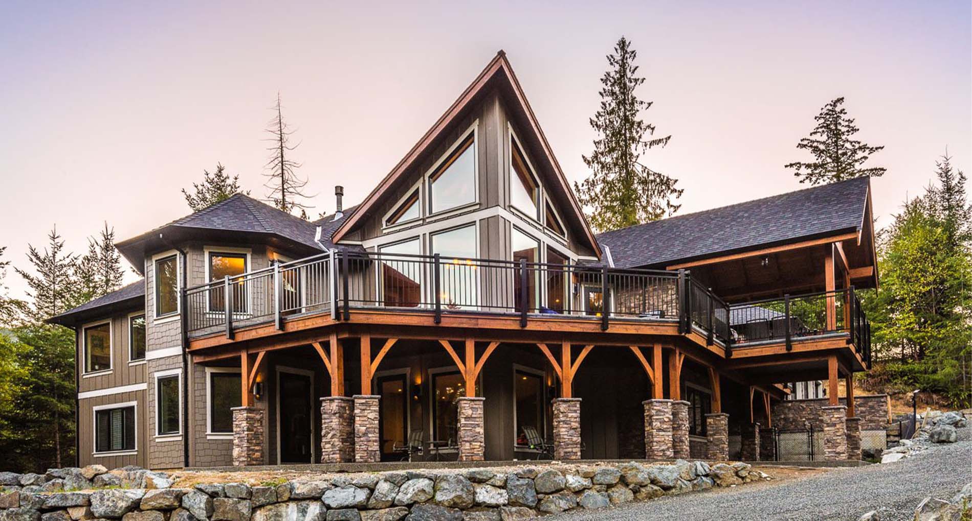This 3 bedroom, 3 ½ bath custom home has a great rustic in-the-woods feel, with spectacular timber frame beams, an a-frame open concept great room, and a focus on natural elements and materials throughout the home. The homeowners didn’t want to cut down any of the surrounding trees on the property and chose to orient the home so that the forest was the primary view. The end result is a true “cabin in the woods” experience.