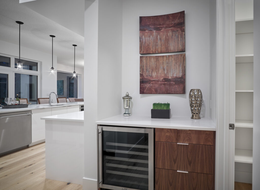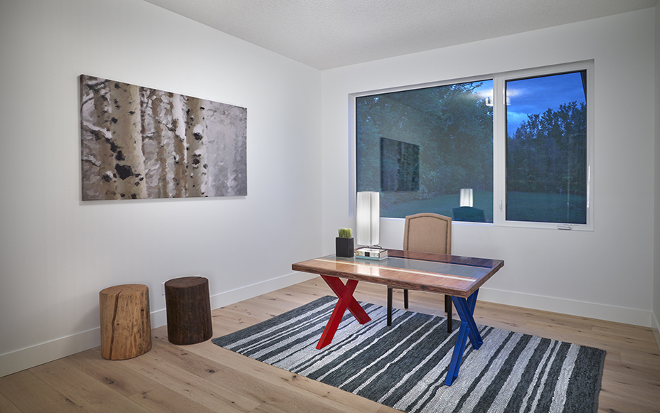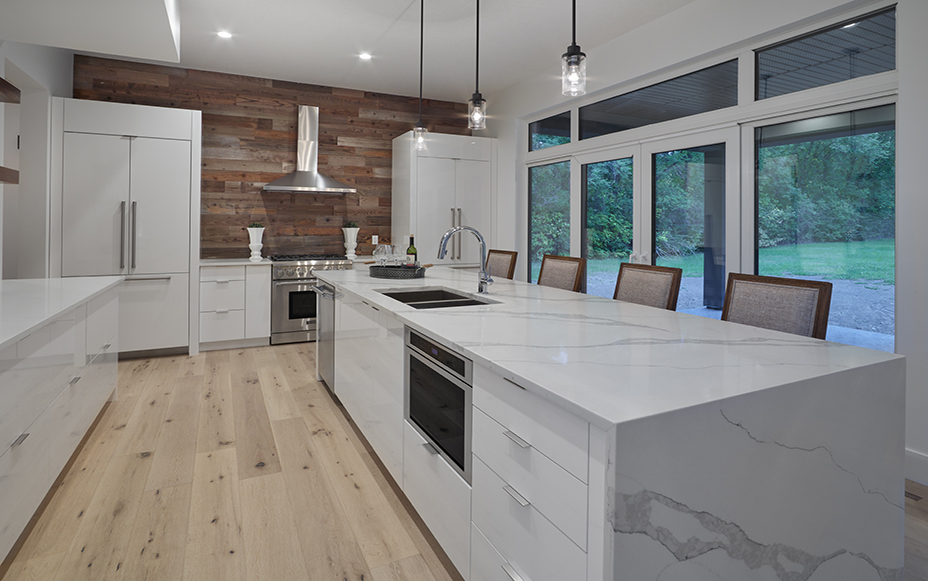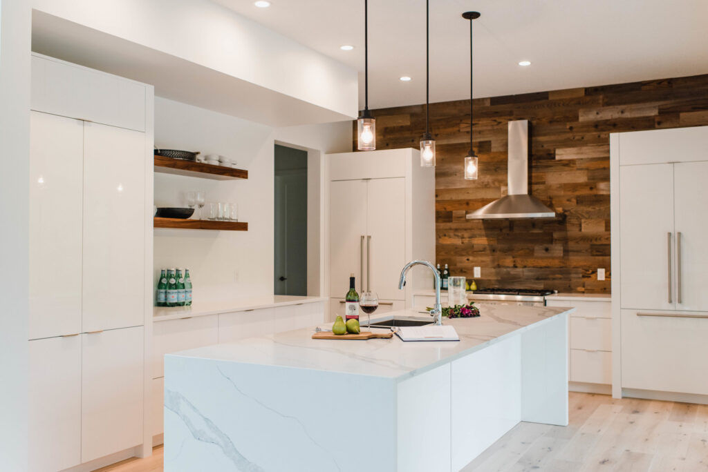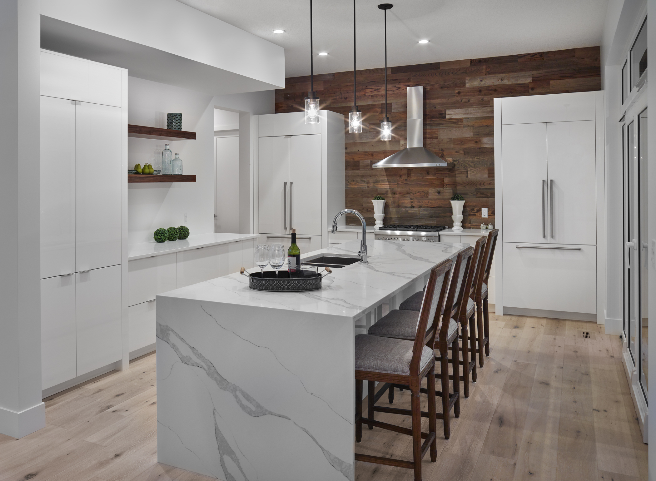 This contemporary custom home features and open concept layout, contemporary design, and luxurious finishes. The main living space has a unique, contemporary window layout that is nicely complimented by the high ceilings. The modern light wood floors and white walls bring a very bright and open feel that continues through to the kitchen/dining area. A unique element to this kitchen is the reclaimed wood feature wall. This adds a more rustic feel to the home that matches nicely to the dark tiled ribbon fireplace.