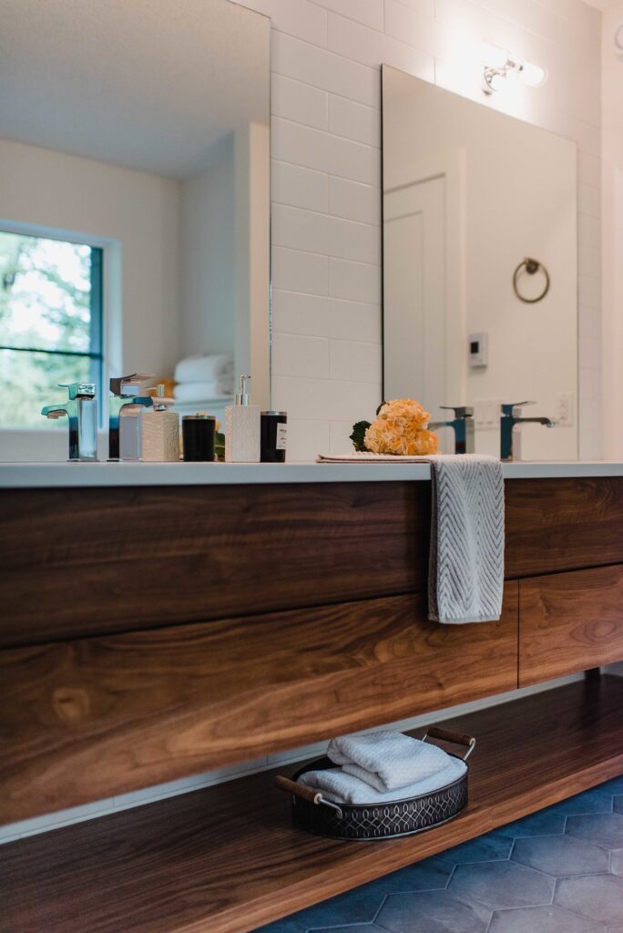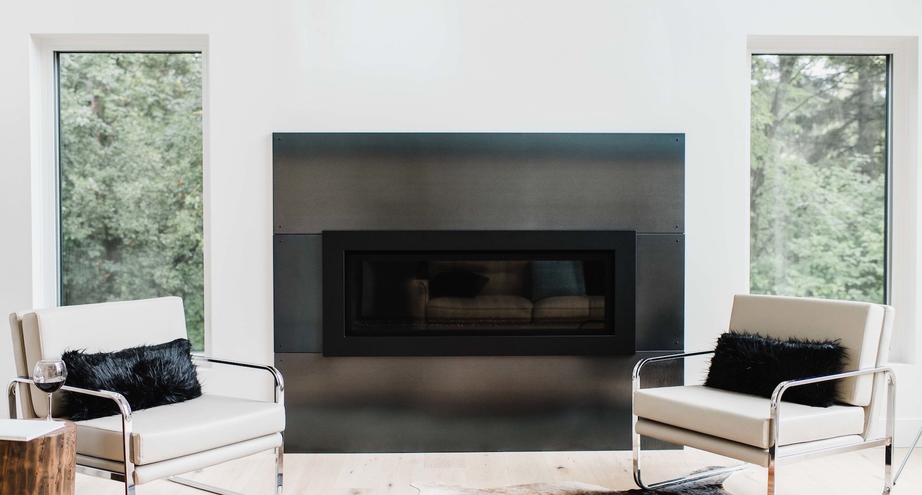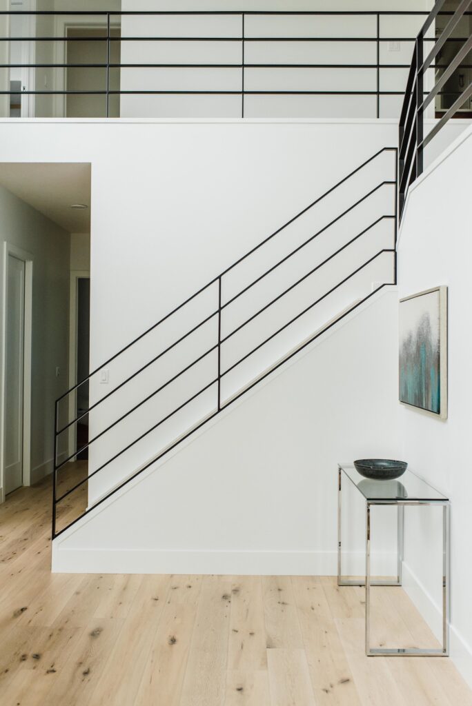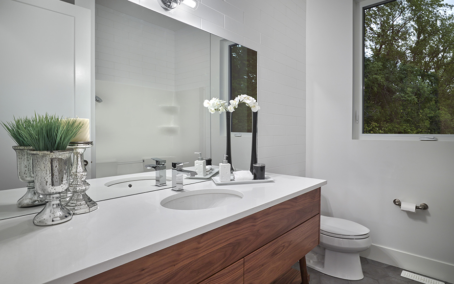 This contemporary custom home features and open concept layout, contemporary design, and luxurious finishes. The main living space has a unique, contemporary window layout that is nicely complimented by the high ceilings. The modern light wood floors and white walls bring a very bright and open feel that continues through to the kitchen/dining area. A unique element to this kitchen is the reclaimed wood feature wall. This adds a more rustic feel to the home that matches nicely to the dark tiled ribbon fireplace.
