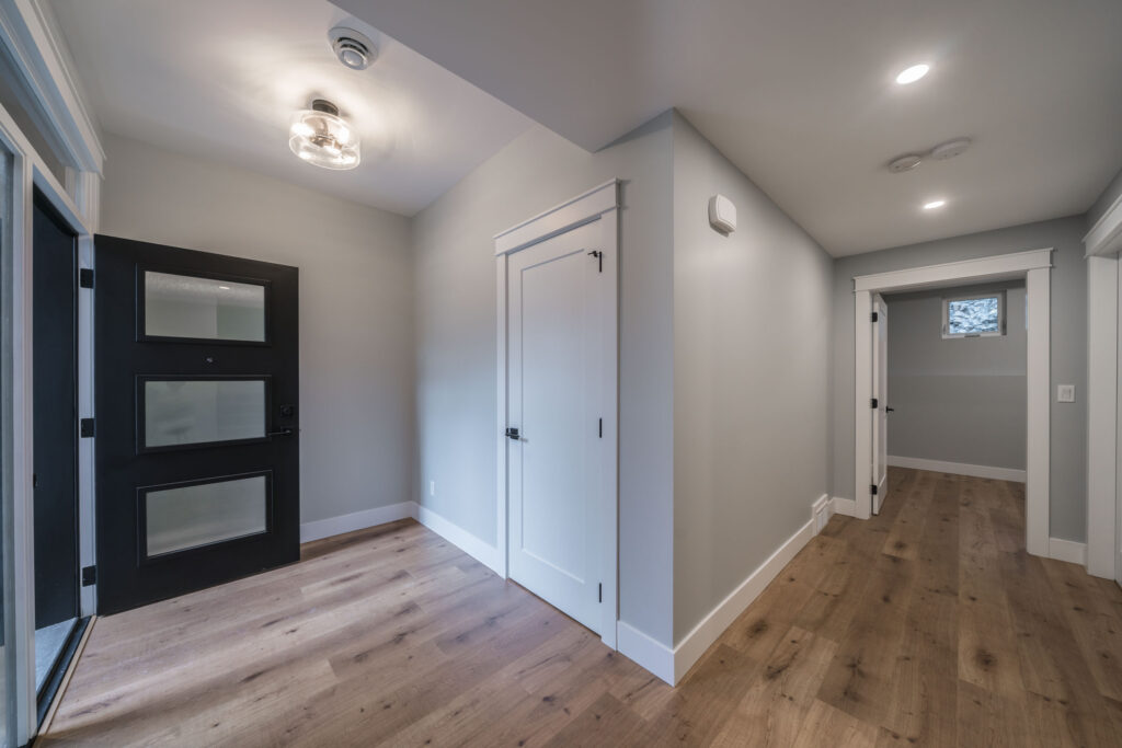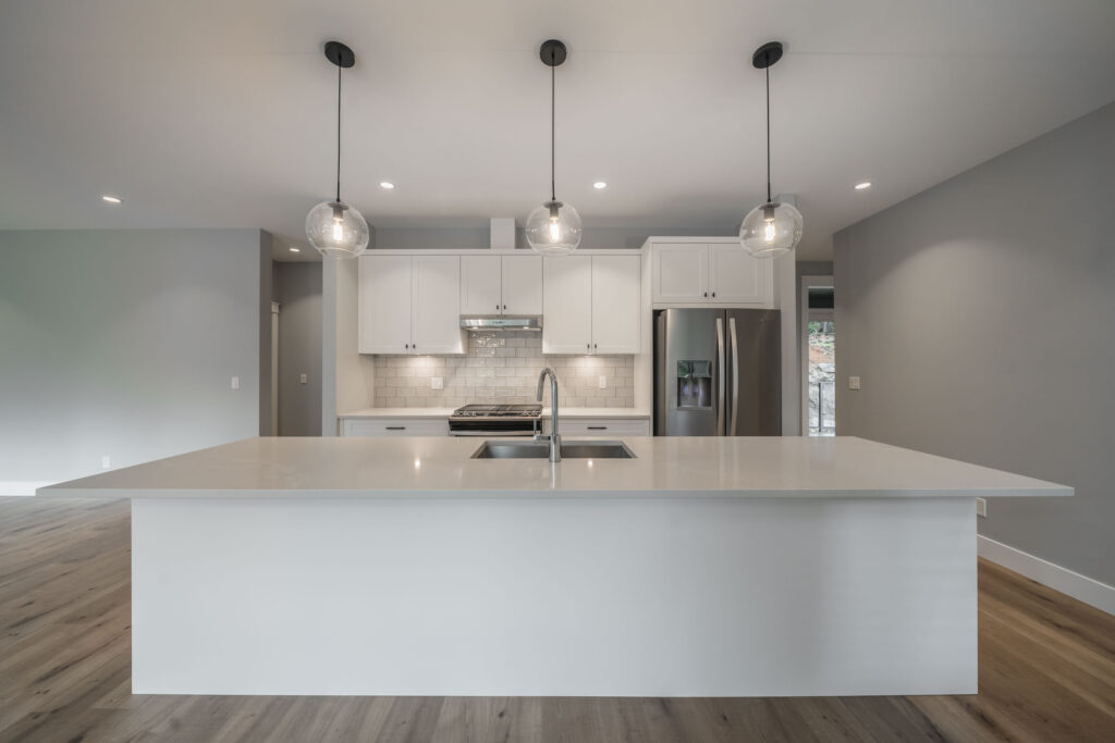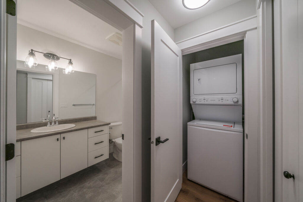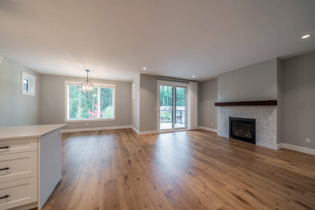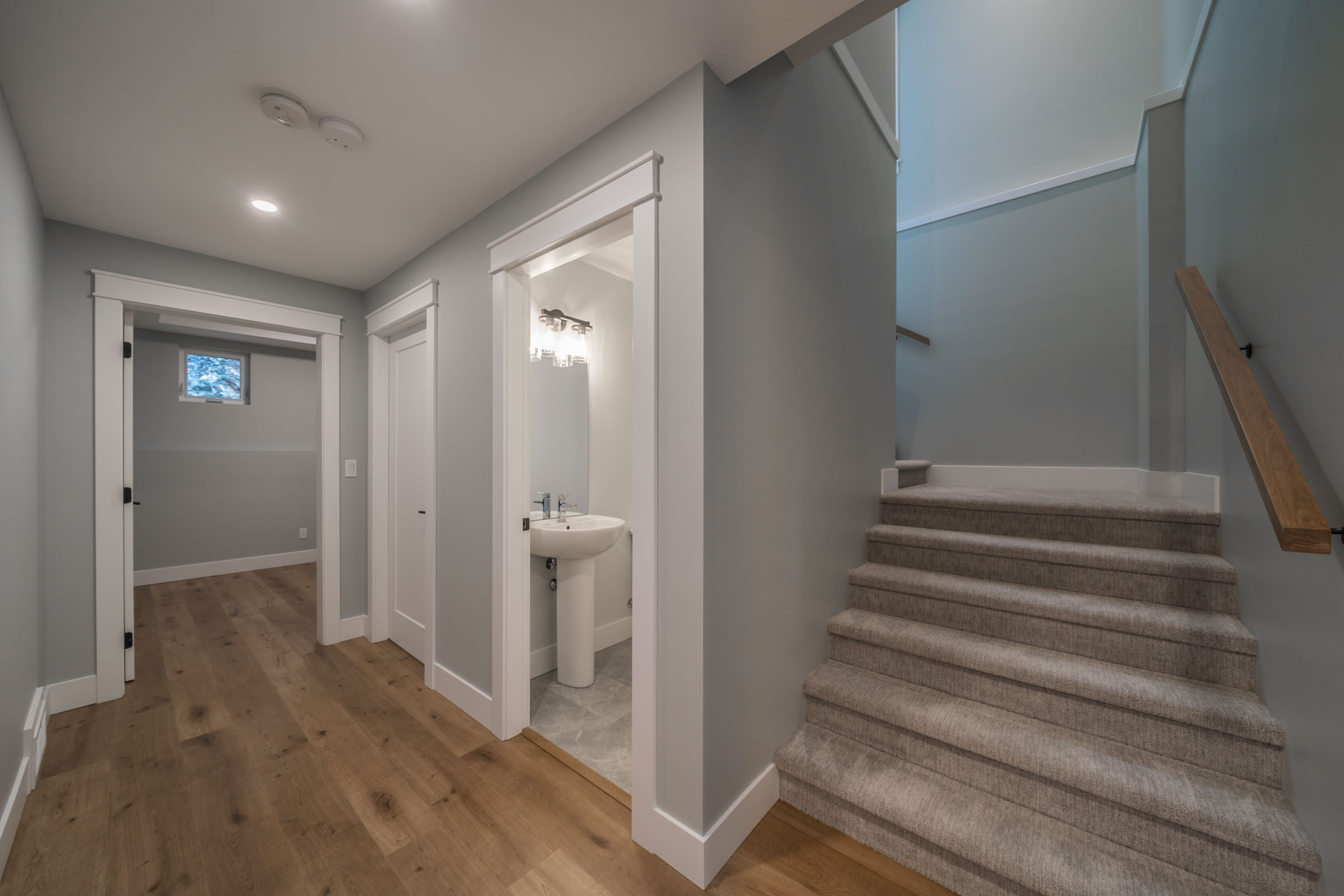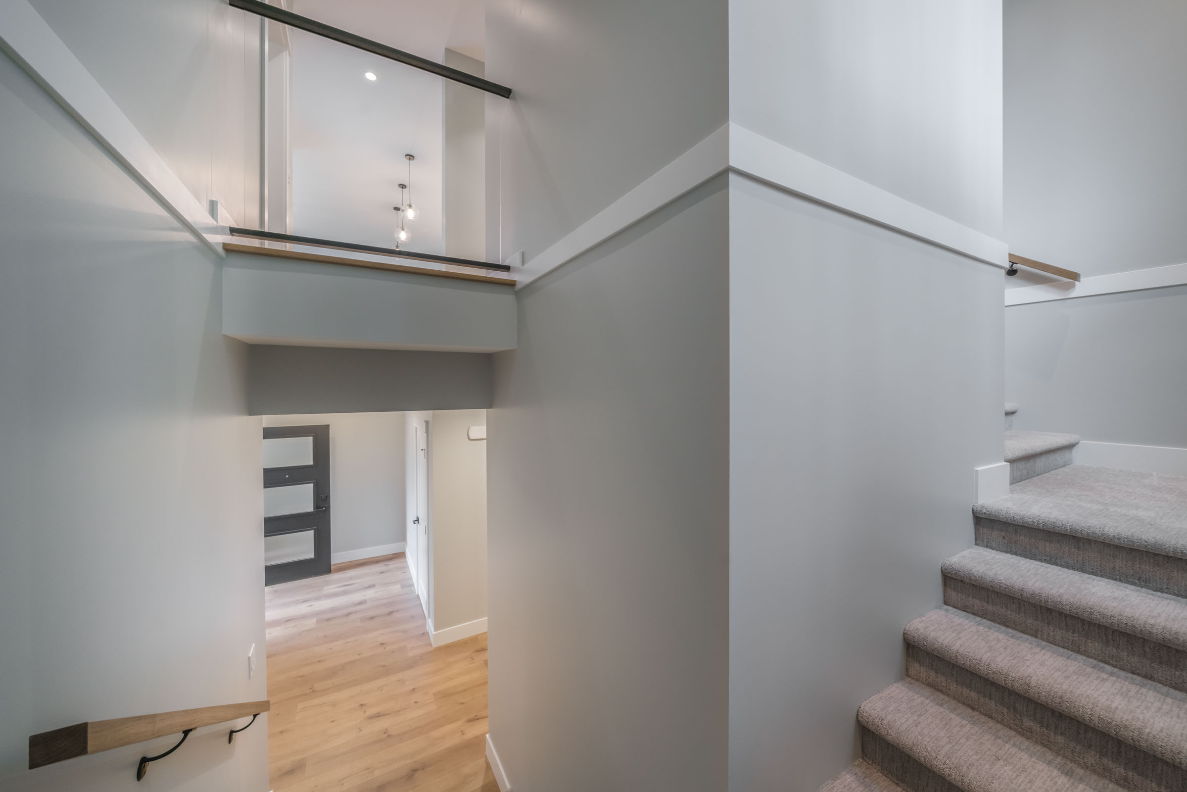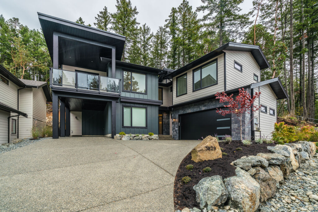 This house features a large upper / lower living area with 3 bedrooms and a den plus a 2 bedroom rental suite. The main house has a large master bathroom, which includes a soaker tub, walk-in shower and a separate makeup vanity area. There is a large walk-in closet in the master bedroom. The kitchen is an open concept to the living room and dining area. There is a nice size pantry off the kitchen and also a powder room to accommodate visitors. There is a gas fireplace with a reclaimed wood mantle with a beautiful chevron pattern tile. The front balcony is a good size for an outdoor space. There is also a rear patio with privacy backing on to a forested area. The den is located just off the front entryway with a powder room close by, which would be perfect for a home office. The front and rear landscape has been kept as natural as possible with river rock beds, and a variety of low maintenance plants with irrigation. The exterior of the house is a very modern style with cool colours to blend with the rock surrounding the property.