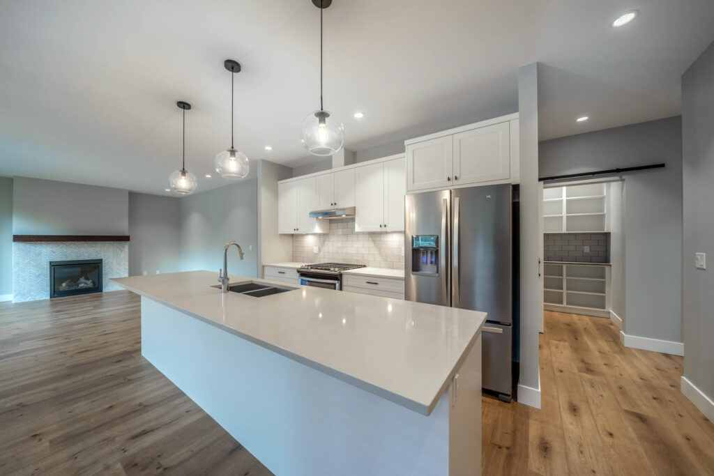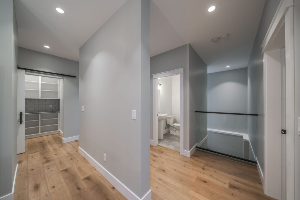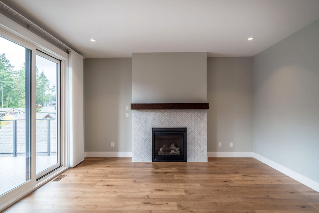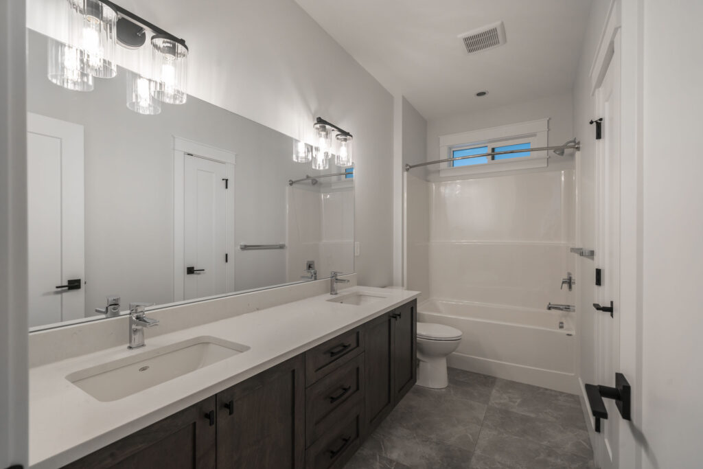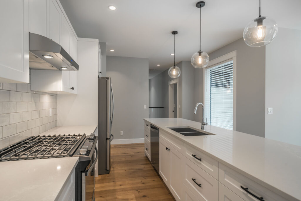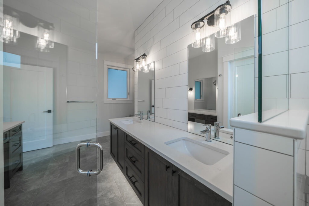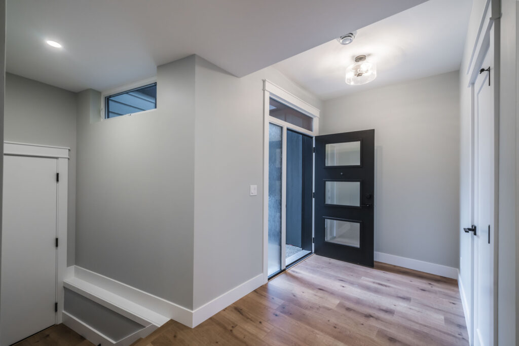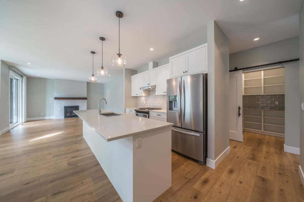 This house features a large upper / lower living area with 3 bedrooms and a den plus a 2 bedroom rental suite. The main house has a large master bathroom, which includes a soaker tub, walk-in shower and a separate makeup vanity area. There is a large walk-in closet in the master bedroom. The kitchen is an open concept to the living room and dining area. There is a nice size pantry off the kitchen and also a powder room to accommodate visitors. There is a gas fireplace with a reclaimed wood mantle with a beautiful chevron pattern tile. The front balcony is a good size for an outdoor space. There is also a rear patio with privacy backing on to a forested area. The den is located just off the front entryway with a powder room close by, which would be perfect for a home office. The front and rear landscape has been kept as natural as possible with river rock beds, and a variety of low maintenance plants with irrigation. The exterior of the house is a very modern style with cool colours to blend with the rock surrounding the property.
