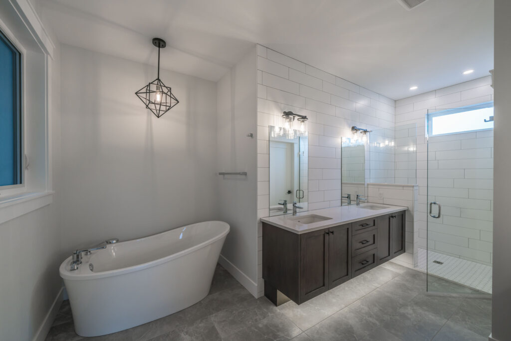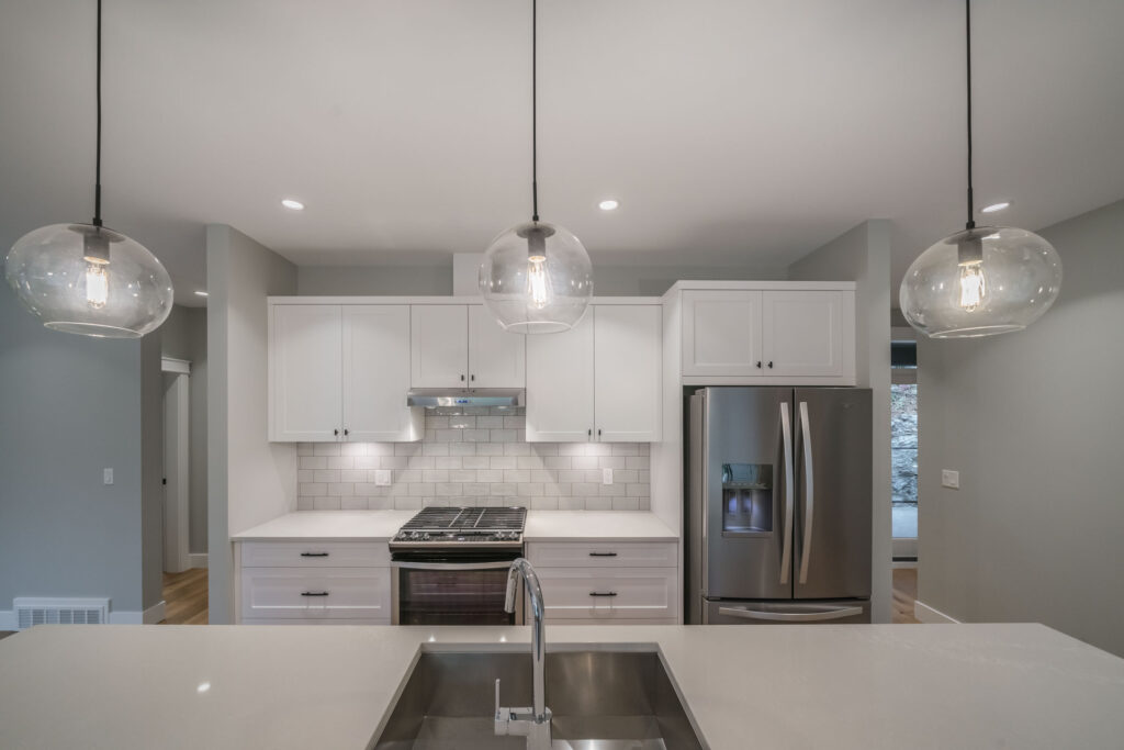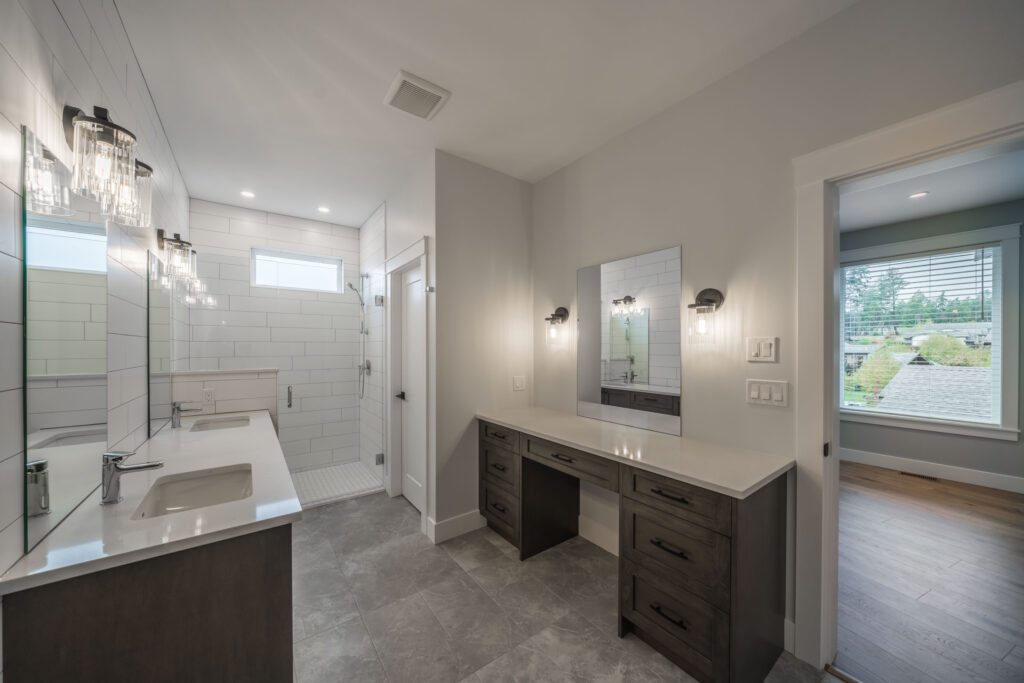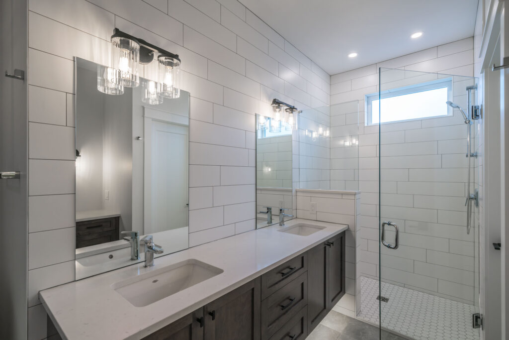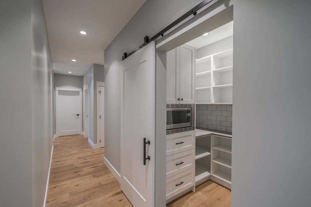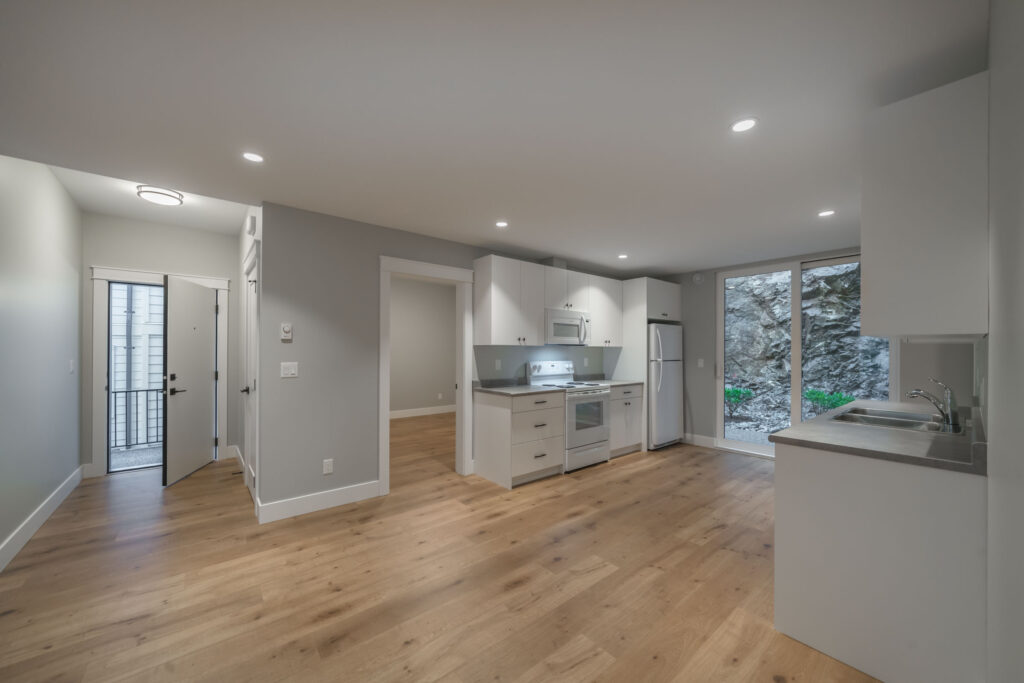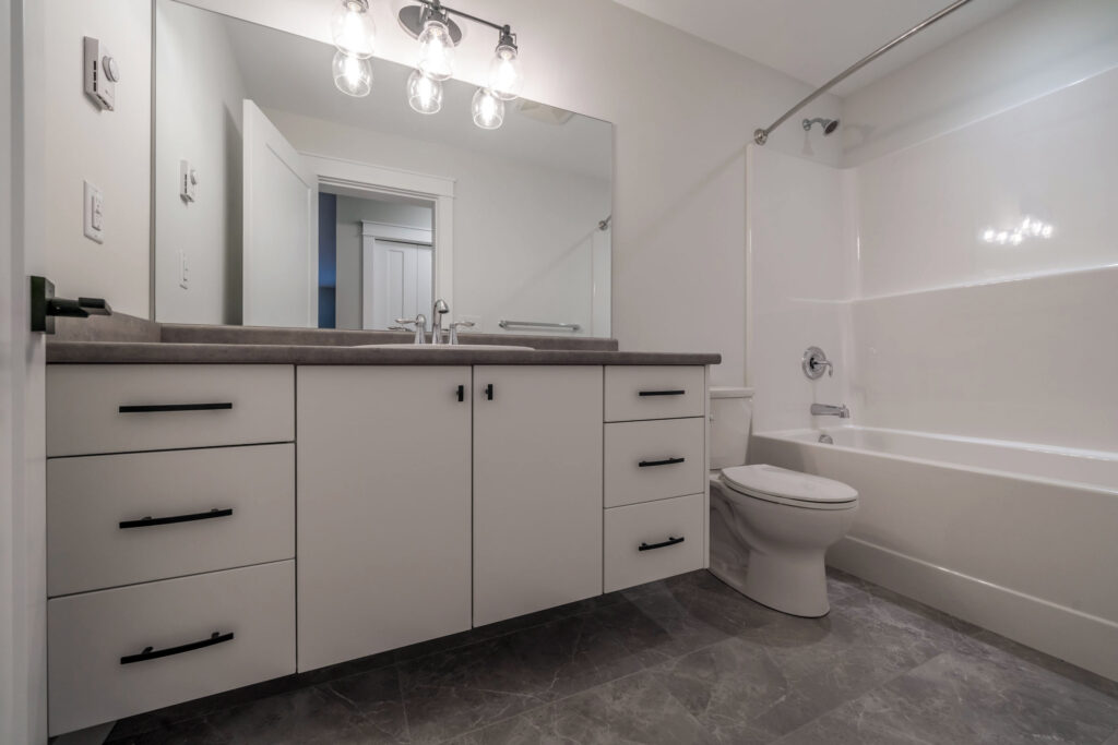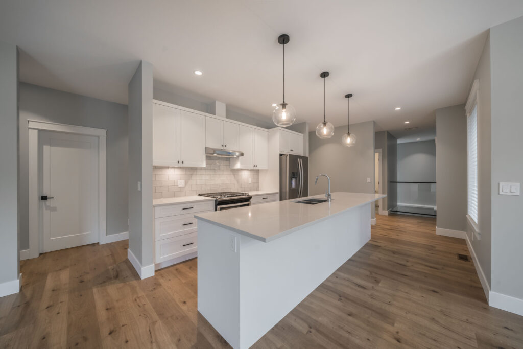 This house features a large upper / lower living area with 3 bedrooms and a den plus a 2 bedroom rental suite. The main house has a large master bathroom, which includes a soaker tub, walk-in shower and a separate makeup vanity area. There is a large walk-in closet in the master bedroom. The kitchen is an open concept to the living room and dining area. There is a nice size pantry off the kitchen and also a powder room to accommodate visitors. There is a gas fireplace with a reclaimed wood mantle with a beautiful chevron pattern tile. The front balcony is a good size for an outdoor space. There is also a rear patio with privacy backing on to a forested area. The den is located just off the front entryway with a powder room close by, which would be perfect for a home office. The front and rear landscape has been kept as natural as possible with river rock beds, and a variety of low maintenance plants with irrigation. The exterior of the house is a very modern style with cool colours to blend with the rock surrounding the property.