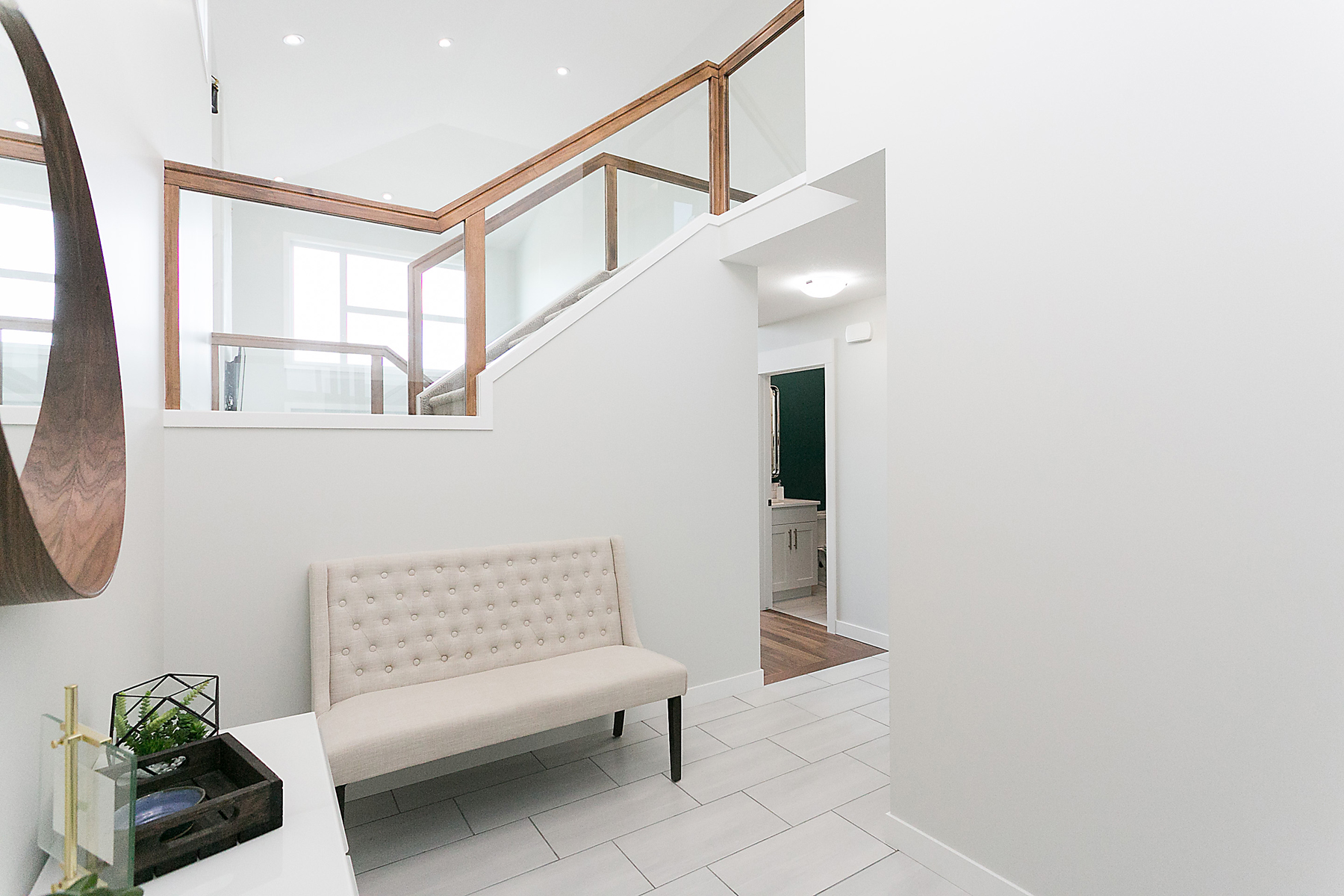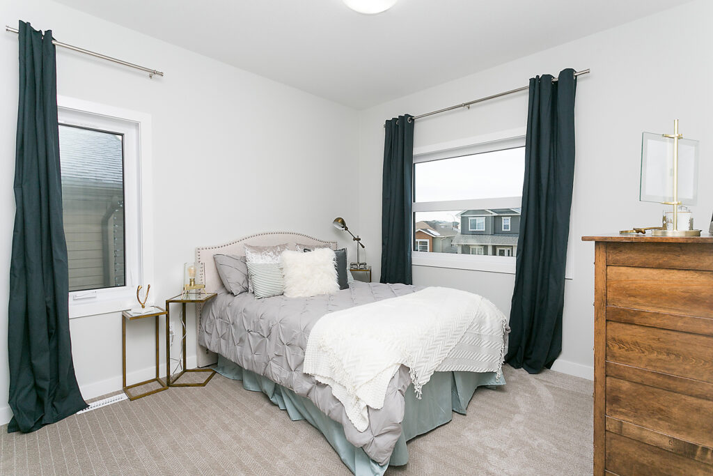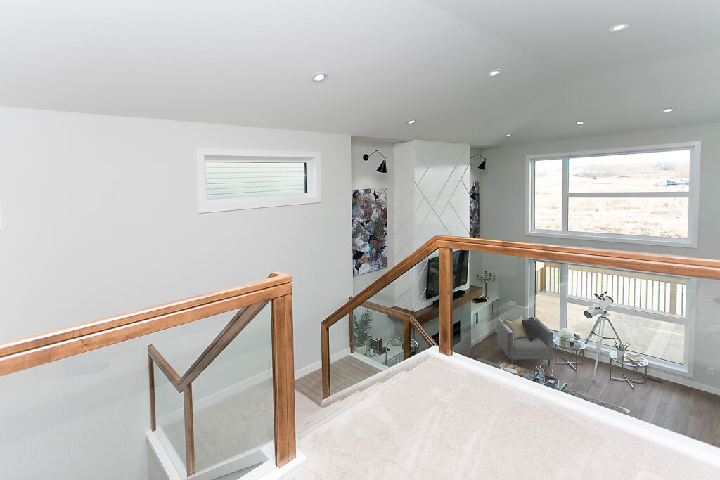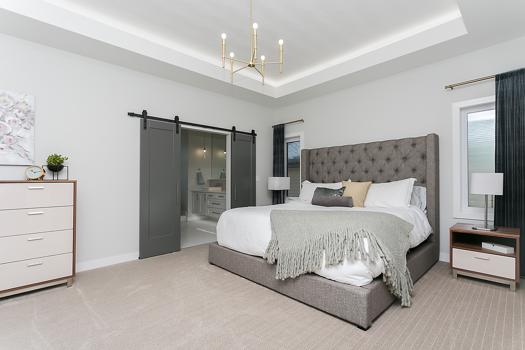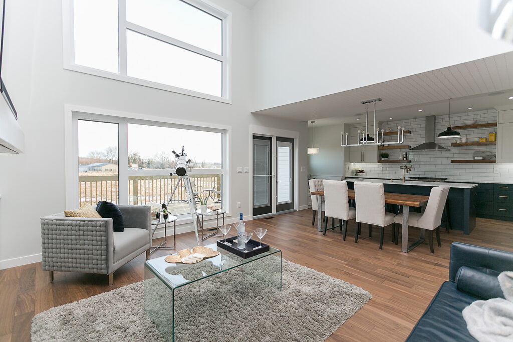 This modern custom home features a spacious open concept main floor with hardwood floors, large windows, and high ceilings. The master suite features a recessed ceiling, walk-in closet, sliding doors, and spa-like master bathroom.