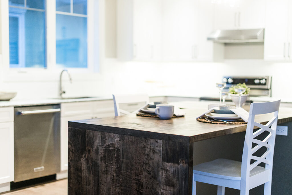 This 4 bedroom, 2.5 bath custom home features an open-concept layout with vaulted ceilings and hardwood floors throughout. The kitchen and living room features a blend of rustic and modern design elements – distressed wood counters and finishes, white cabinets and chairs, and stainless-steel appliances create a cozy and sophisticated atmosphere. The wood stove in the living room adds to the rustic charm of the space.
