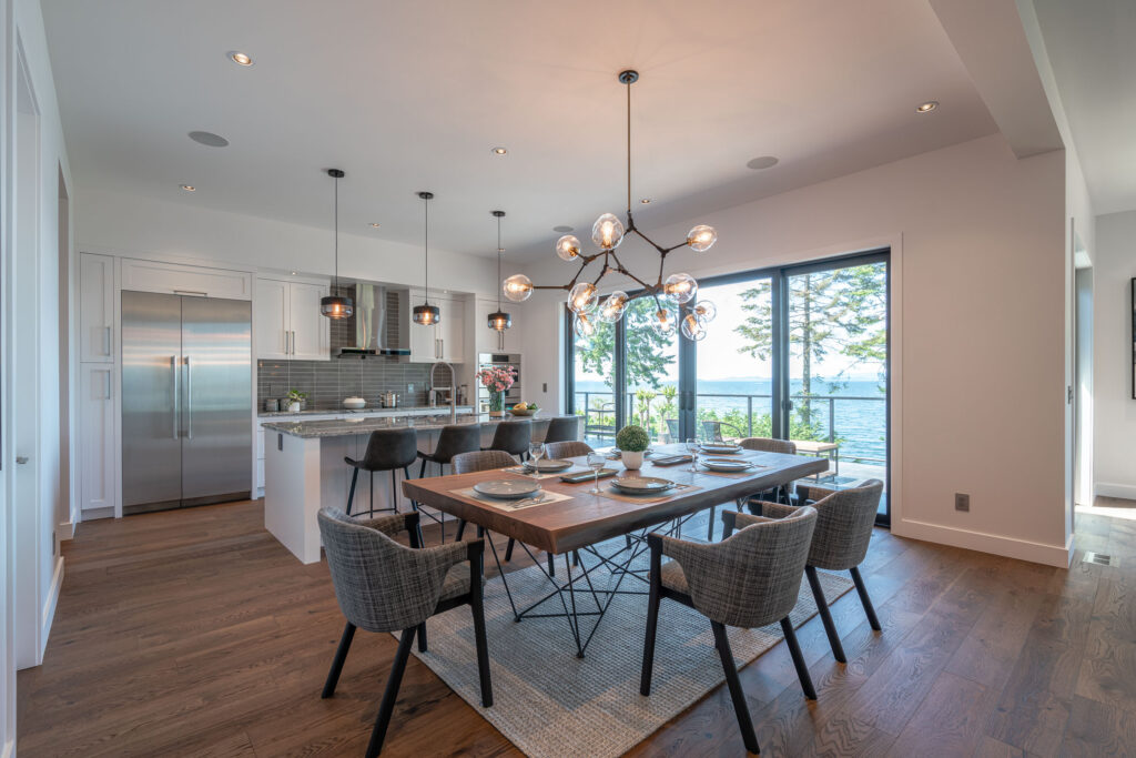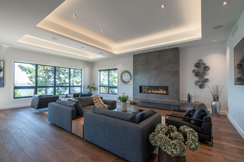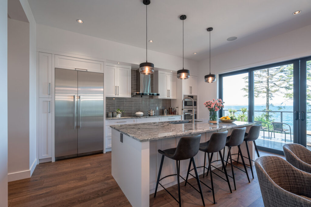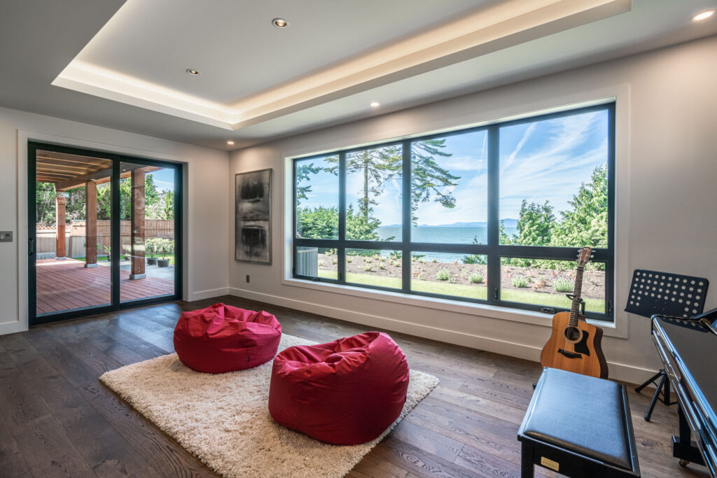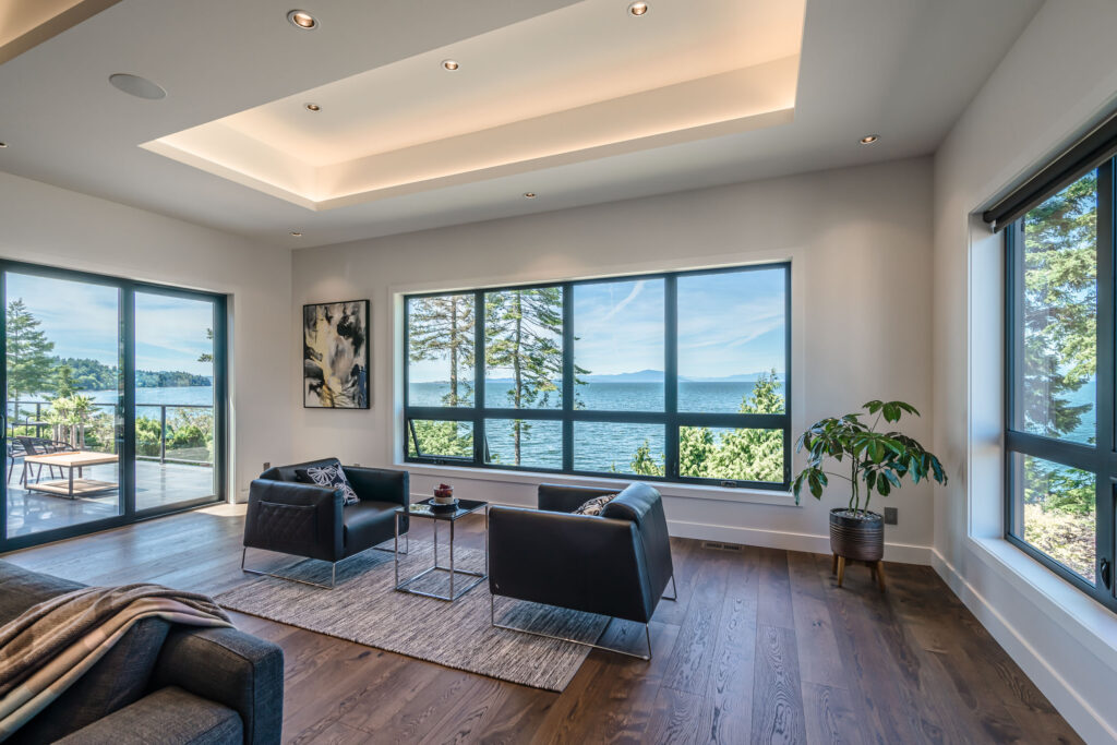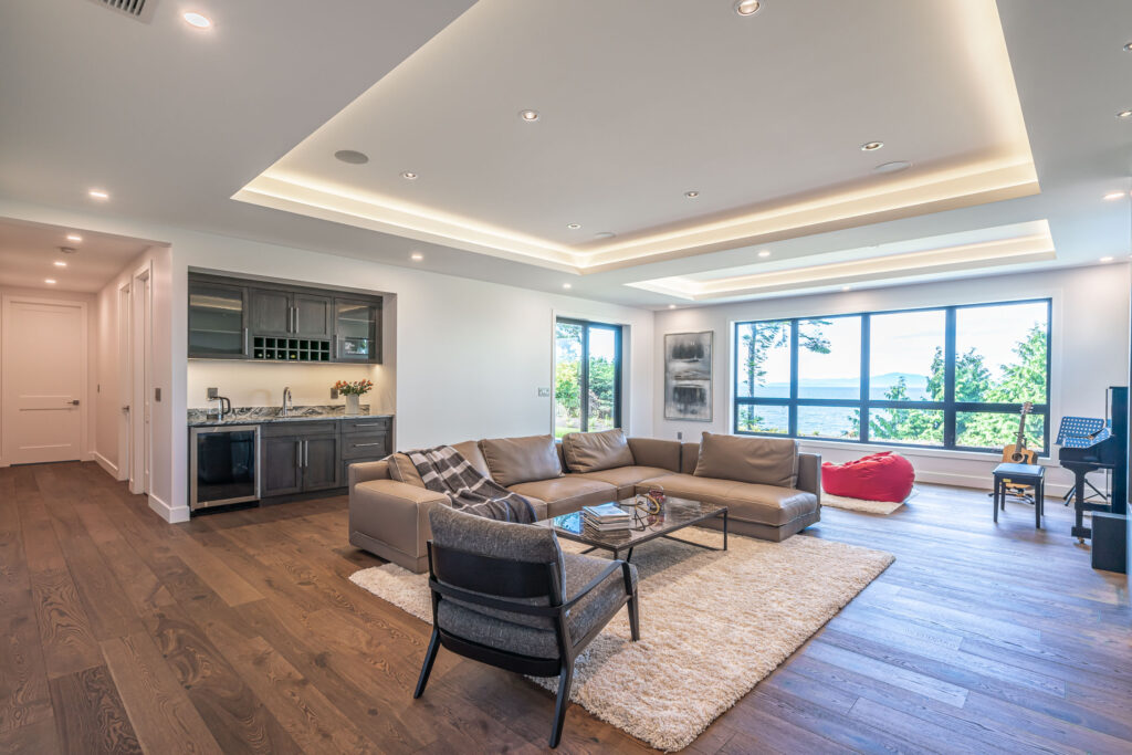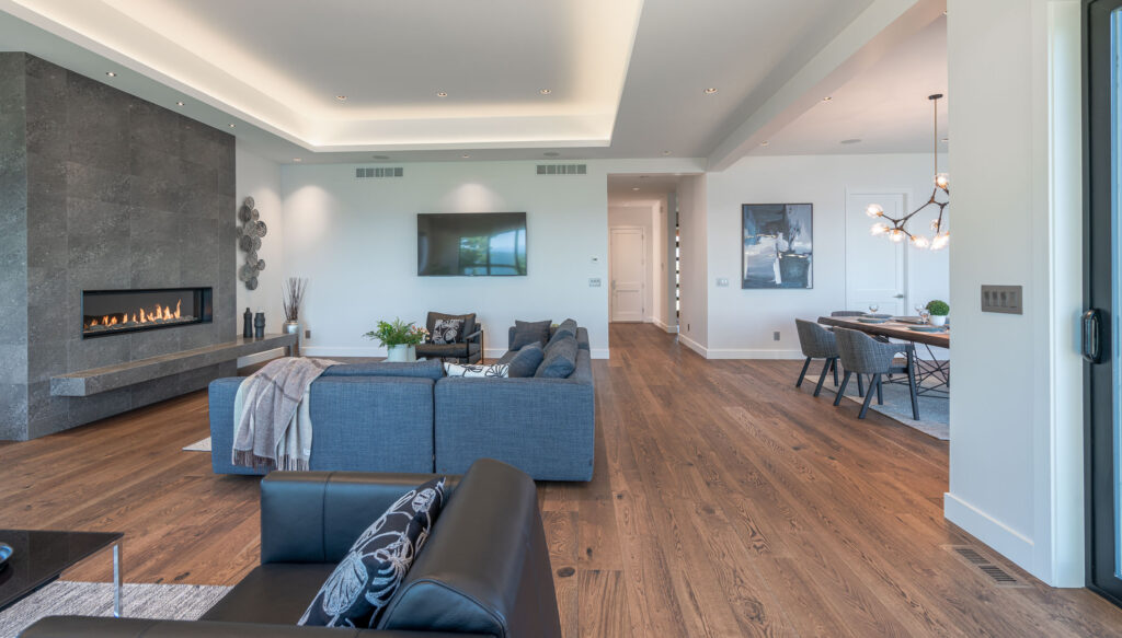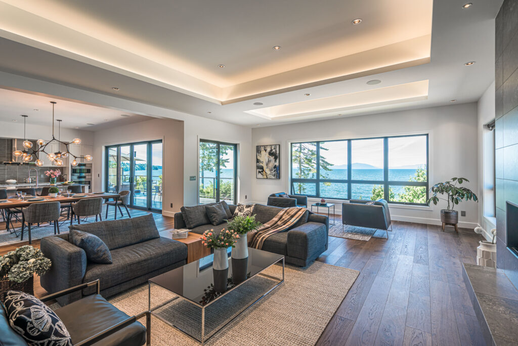 This expansive modern custom home features an open concept main living area, a gourmet kitchen, hardwood floors, and gorgeous ocean views.