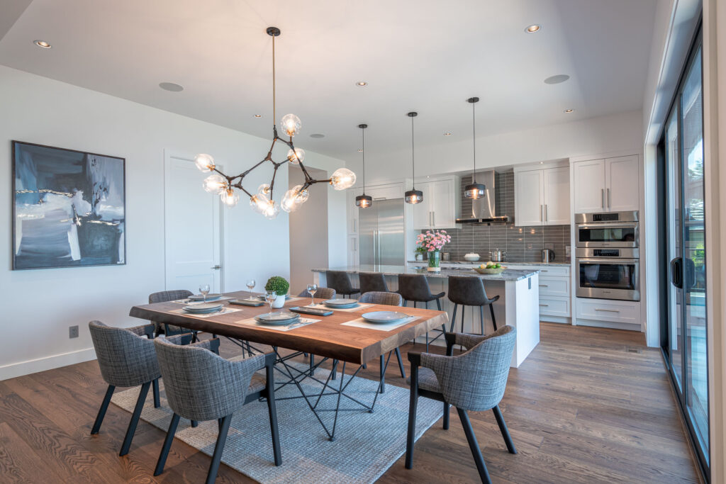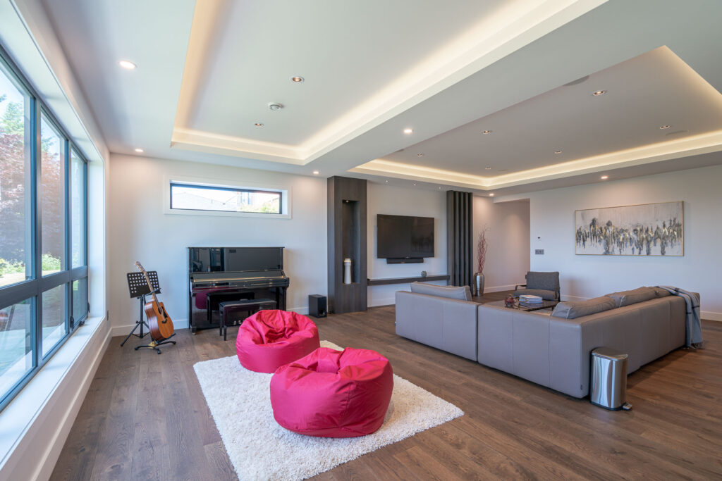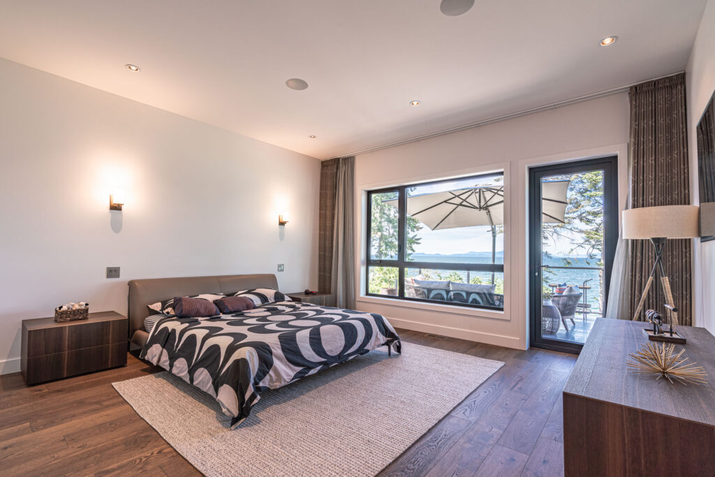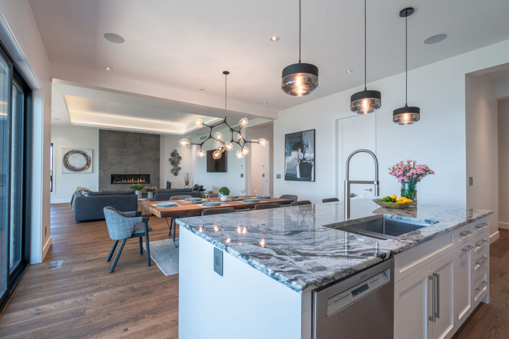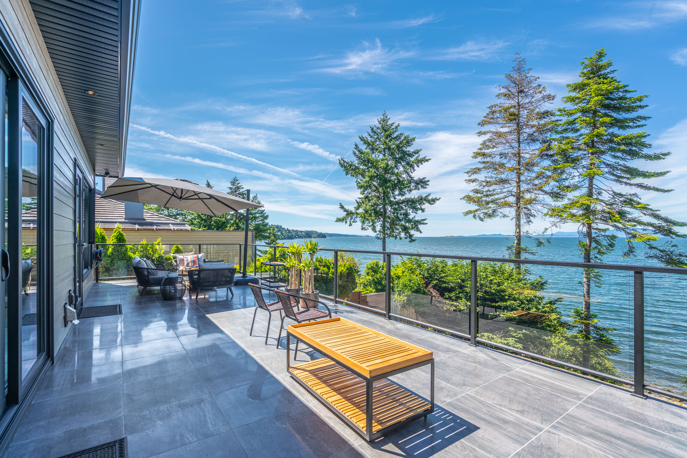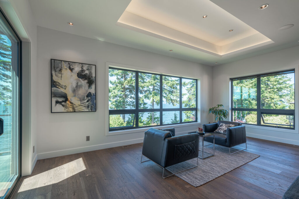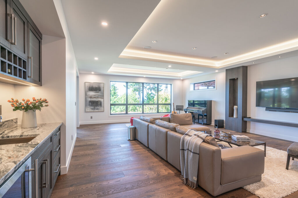 This expansive modern custom home features an open concept main living area, a gourmet kitchen, hardwood floors, and gorgeous ocean views.