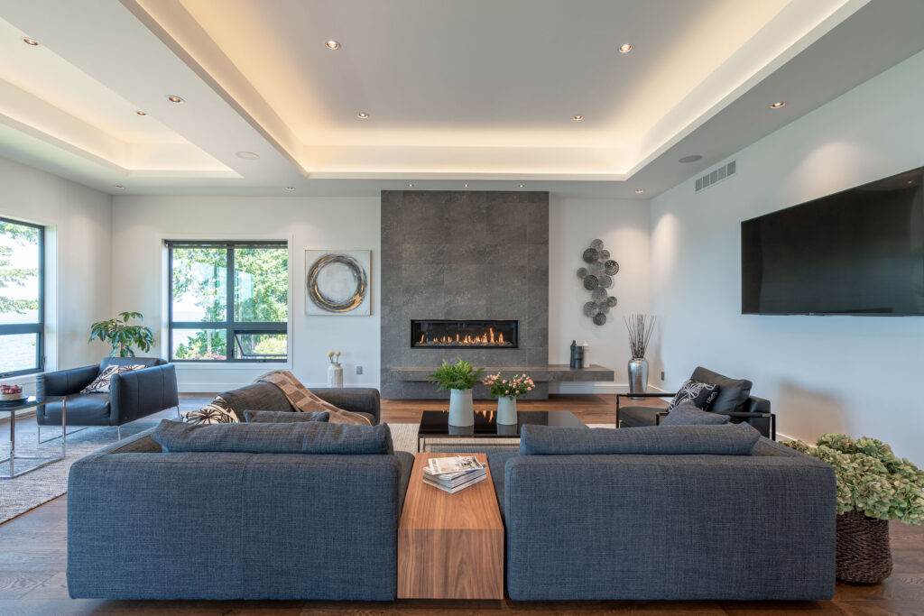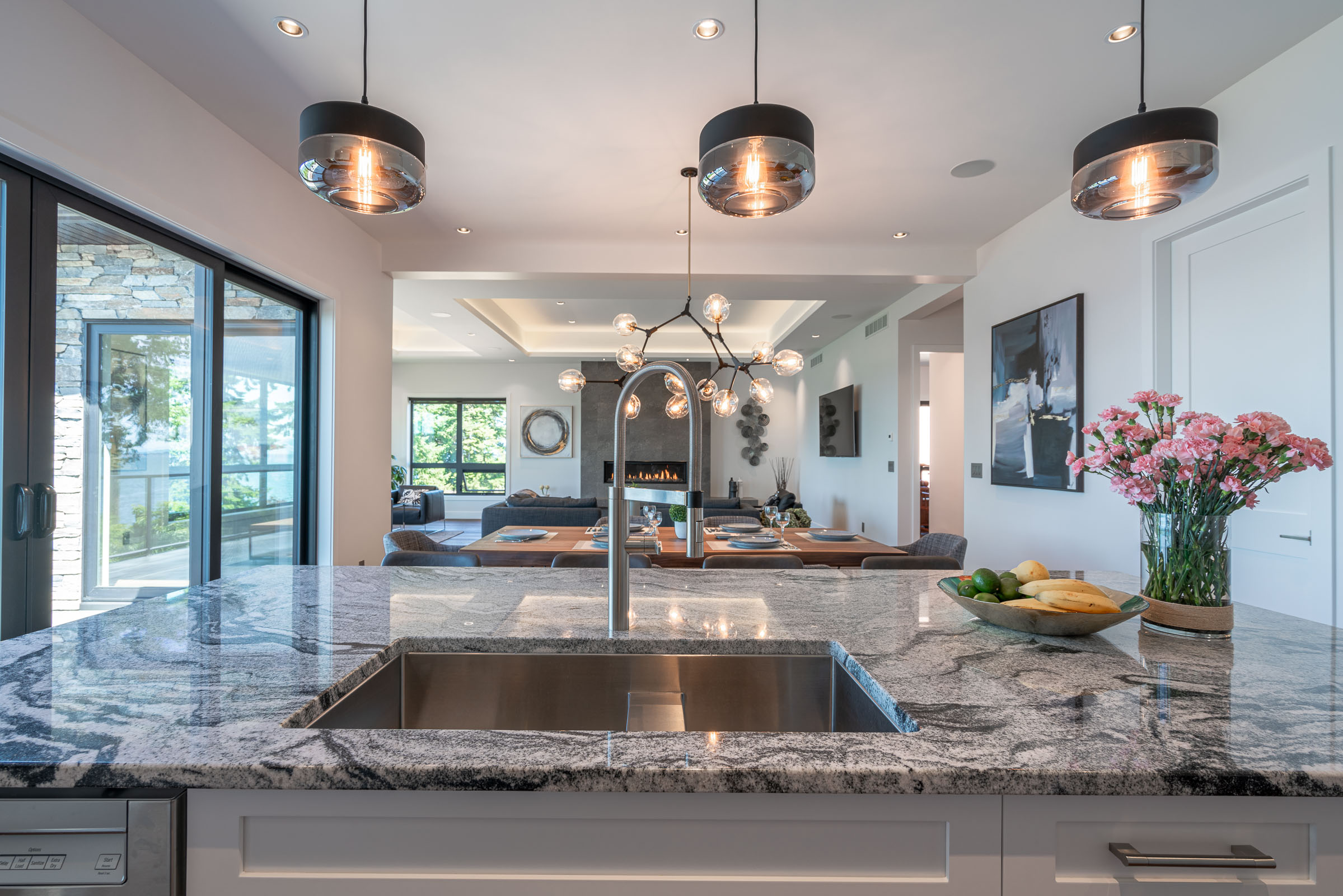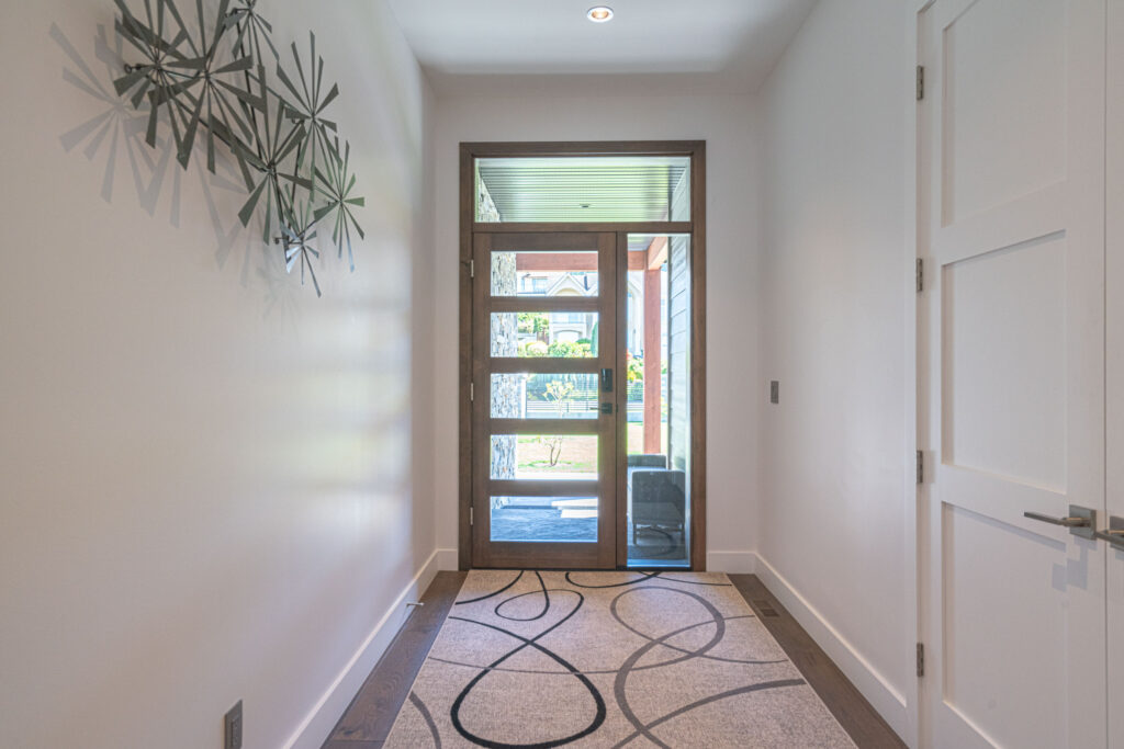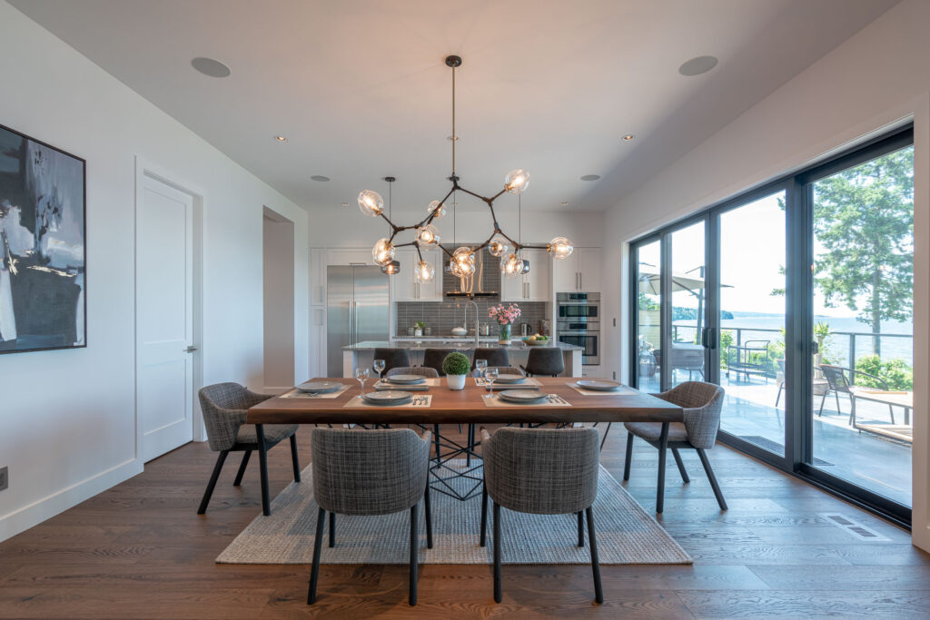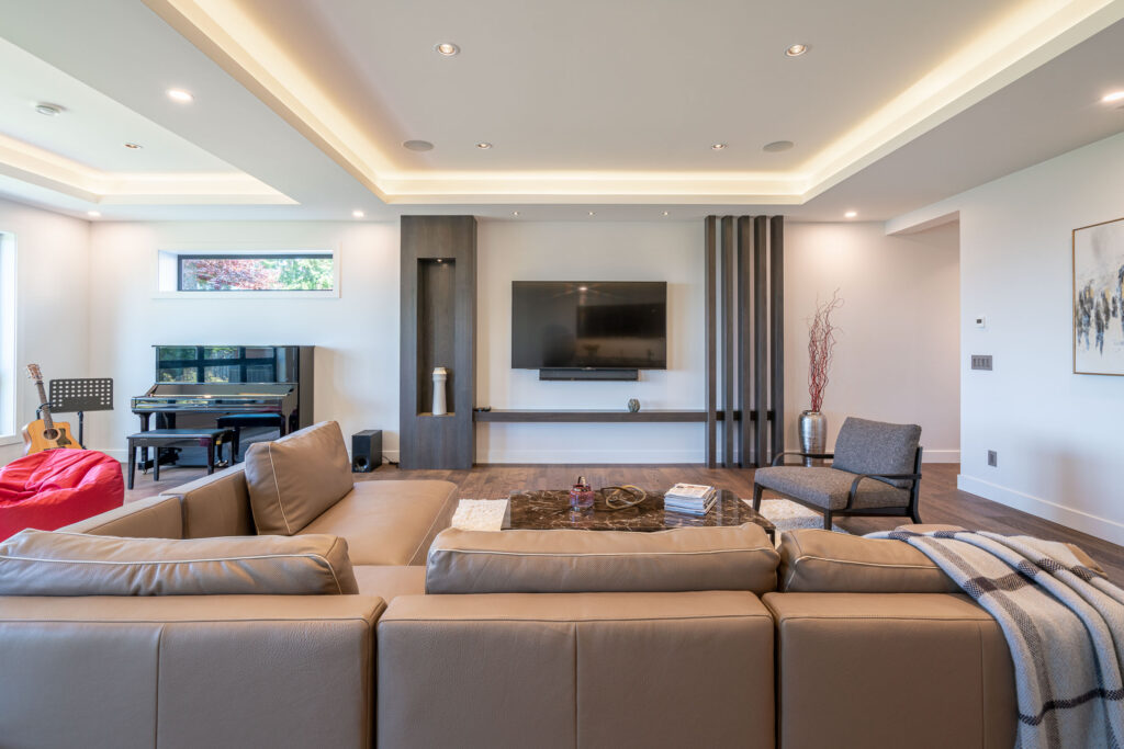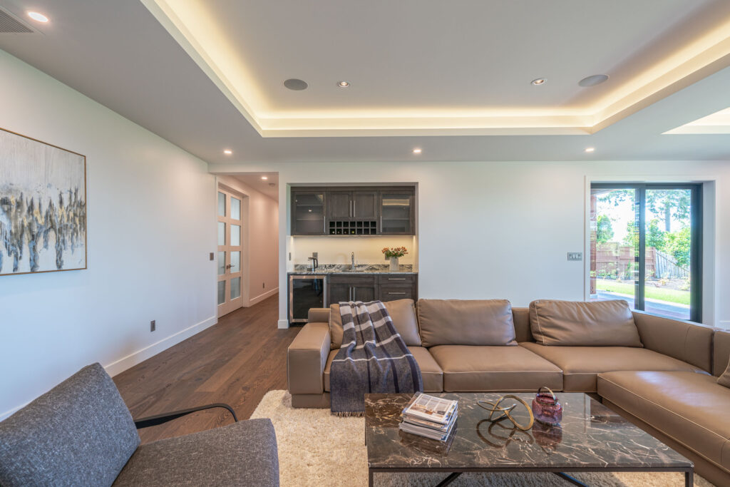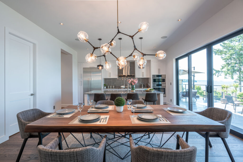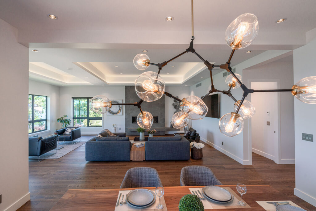 This expansive modern custom home features an open concept main living area, a gourmet kitchen, hardwood floors, and gorgeous ocean views.