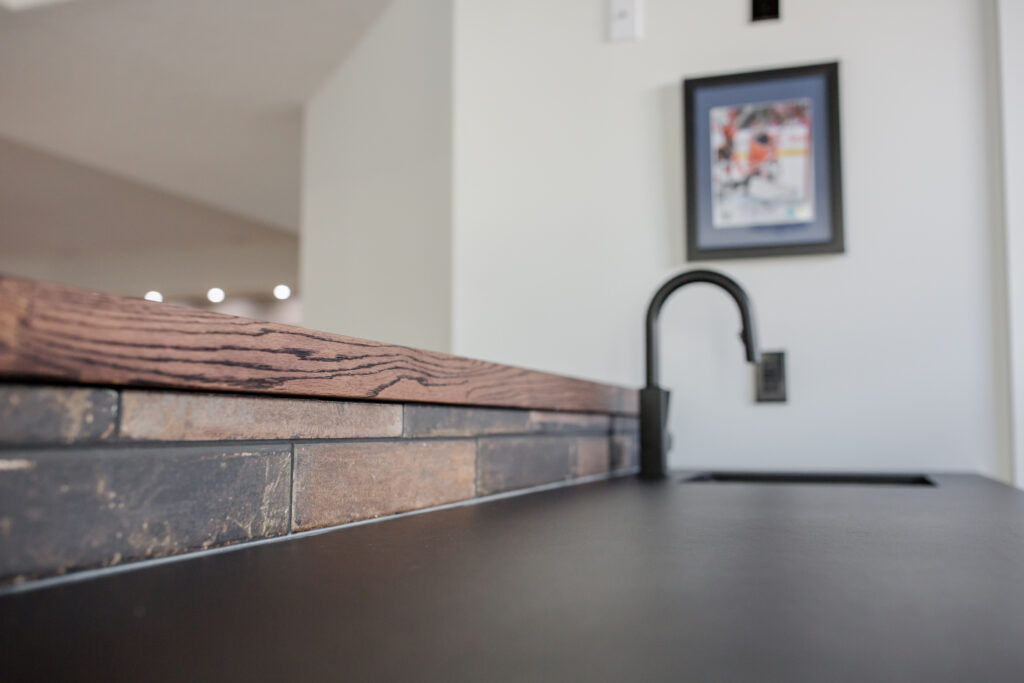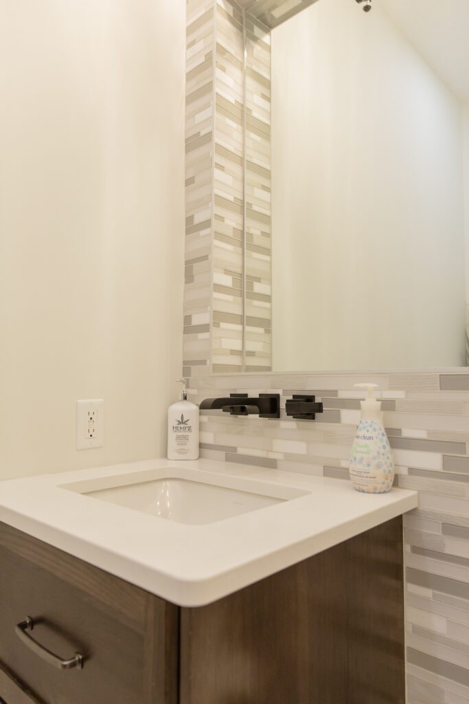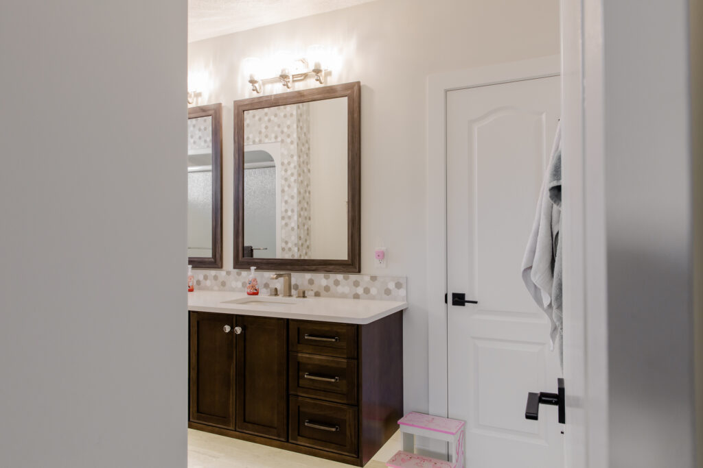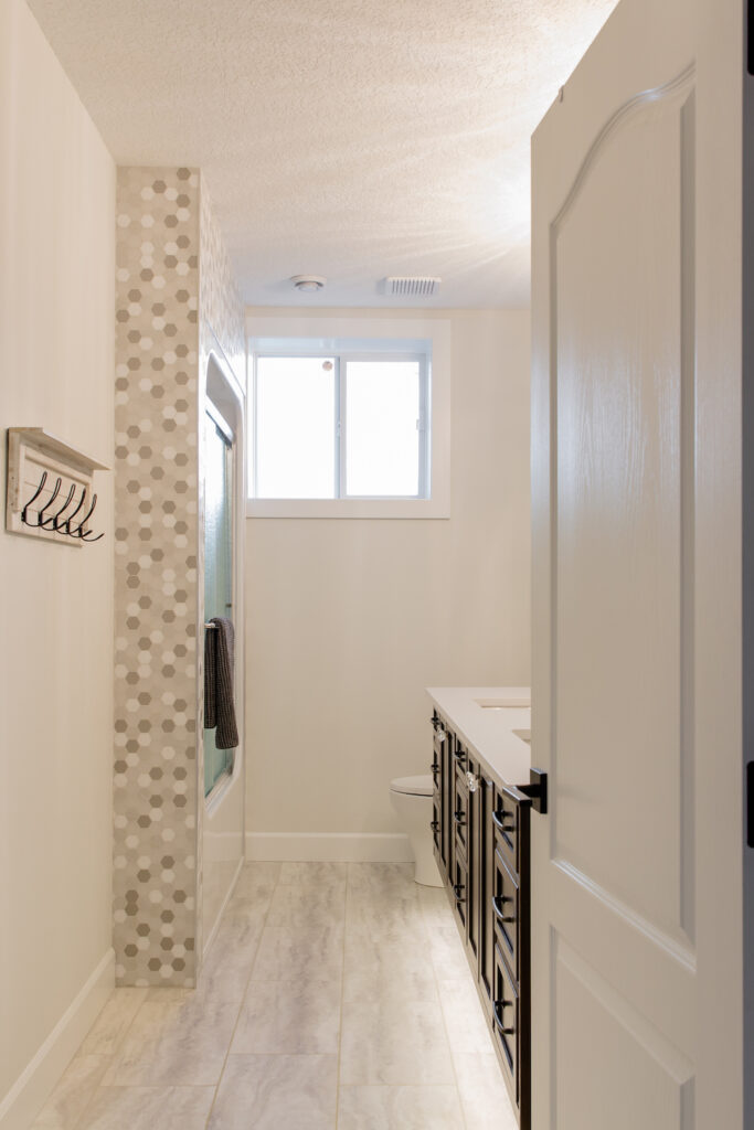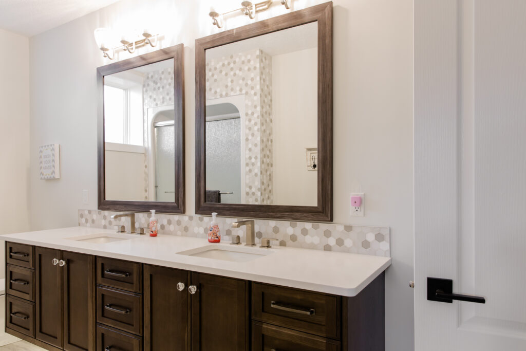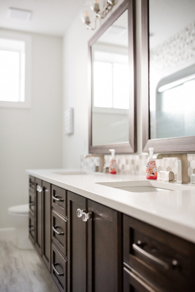 The client’s dad built the house when the client was a teenager. His Dad has lived in it ever since but had become ill with cancer and wanted to downsize. The client, planning on doing an alternate renovation with Alair, decided to purchase the house from the dad and complete a major transformation. We removed glass block and dust rose valances – transforming the interior from dated to modern.