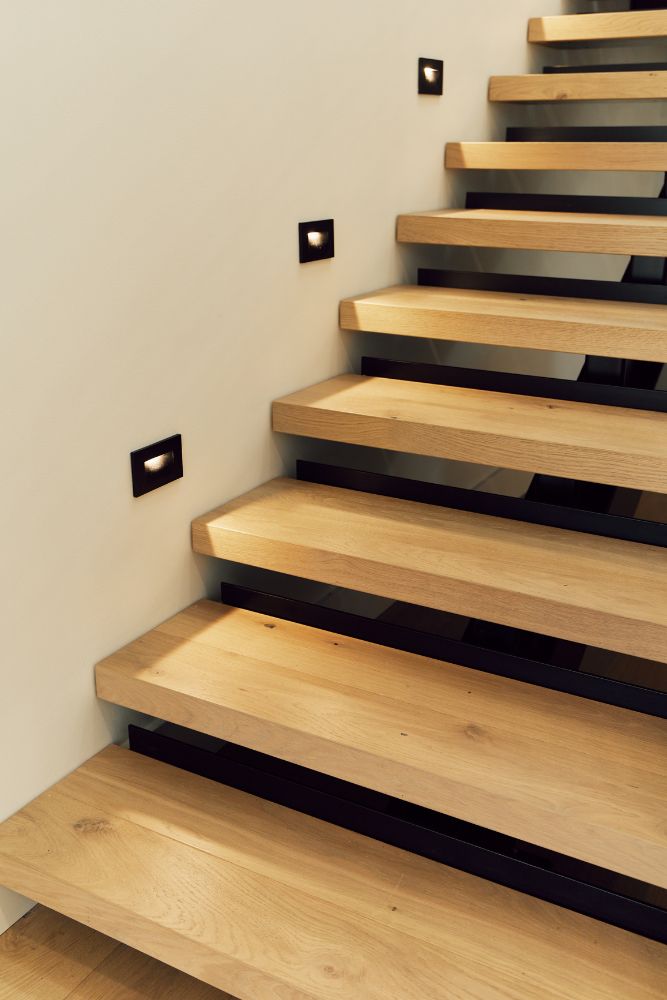 For open riser staircases, try adding LED recessed lights on the wall. Space the lights evenly apart, be consistent and strategic to ensure even coverage.