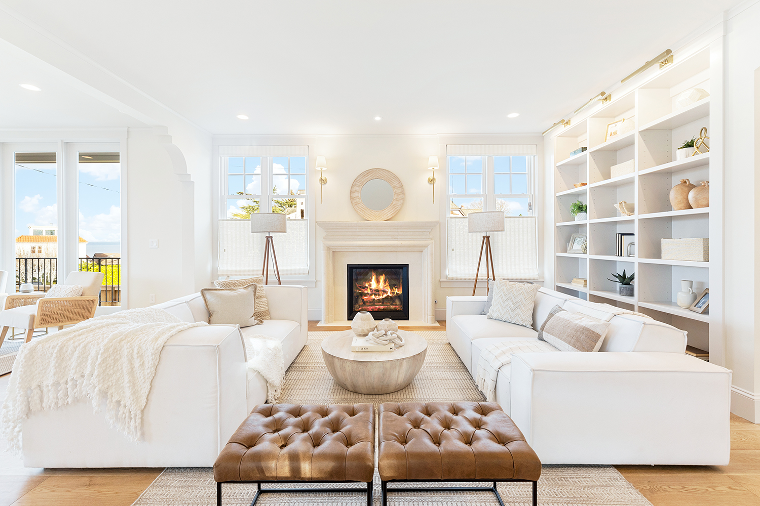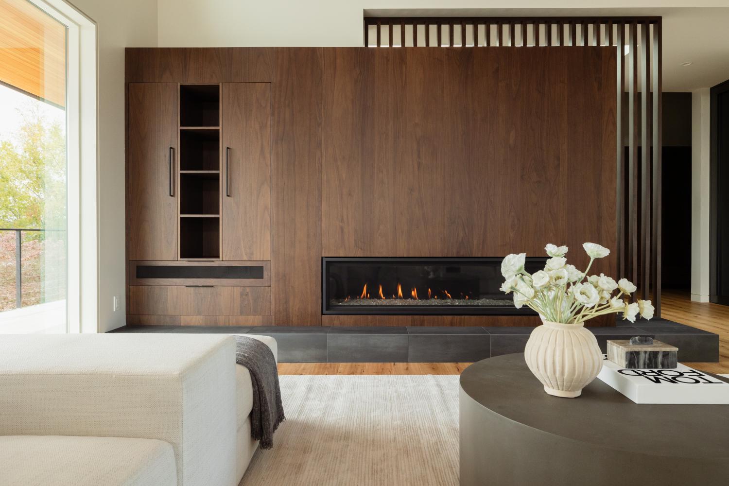 When in doubt, go floral! Flowers are a timeless addition to any coffee table, bringing life to your space. In our Kirkland Dream project, we paired a beautiful bouquet of white flowers in a white vase, creating a striking contrast against the dark wood fireplace. This drama adds depth and richness to the room.
