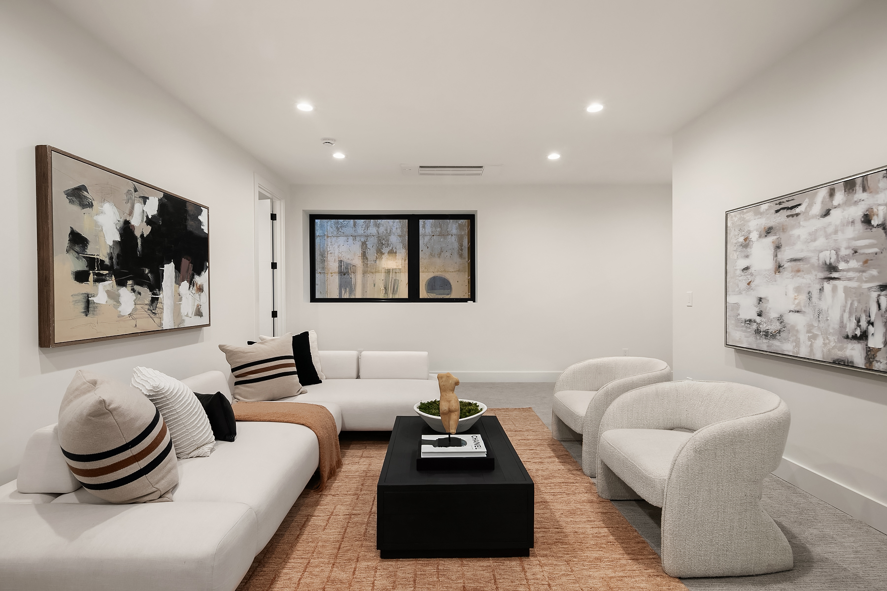 For those looking to make a bold statement, consider a striking piece of art as the centerpiece of your coffee table. In our Laurel Park project, we opted for a small statue that draws the eye and enriches the overall aesthetic. An art centerpiece not only stands out on its own but also ties in with paintings on either wall, creating a gallery-like experience.